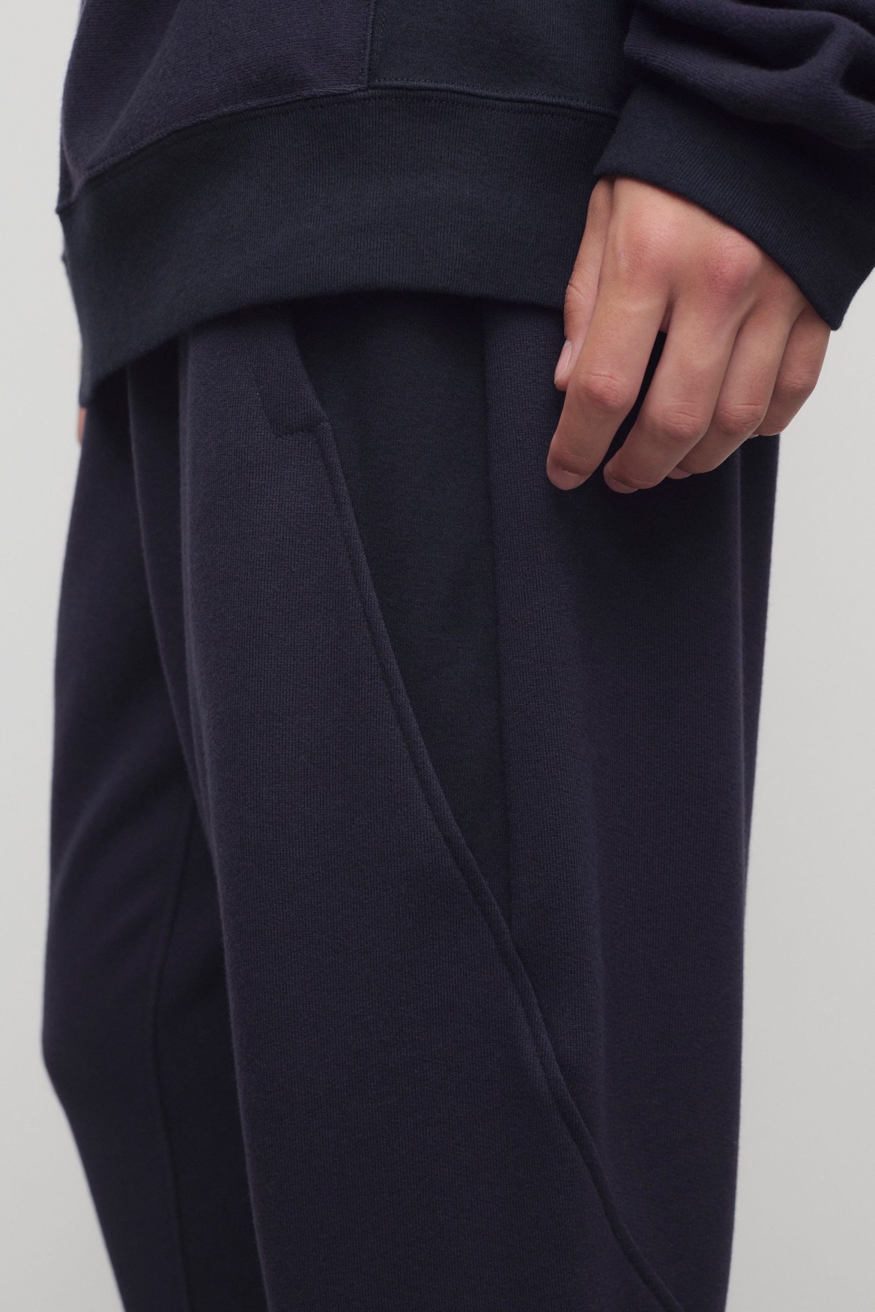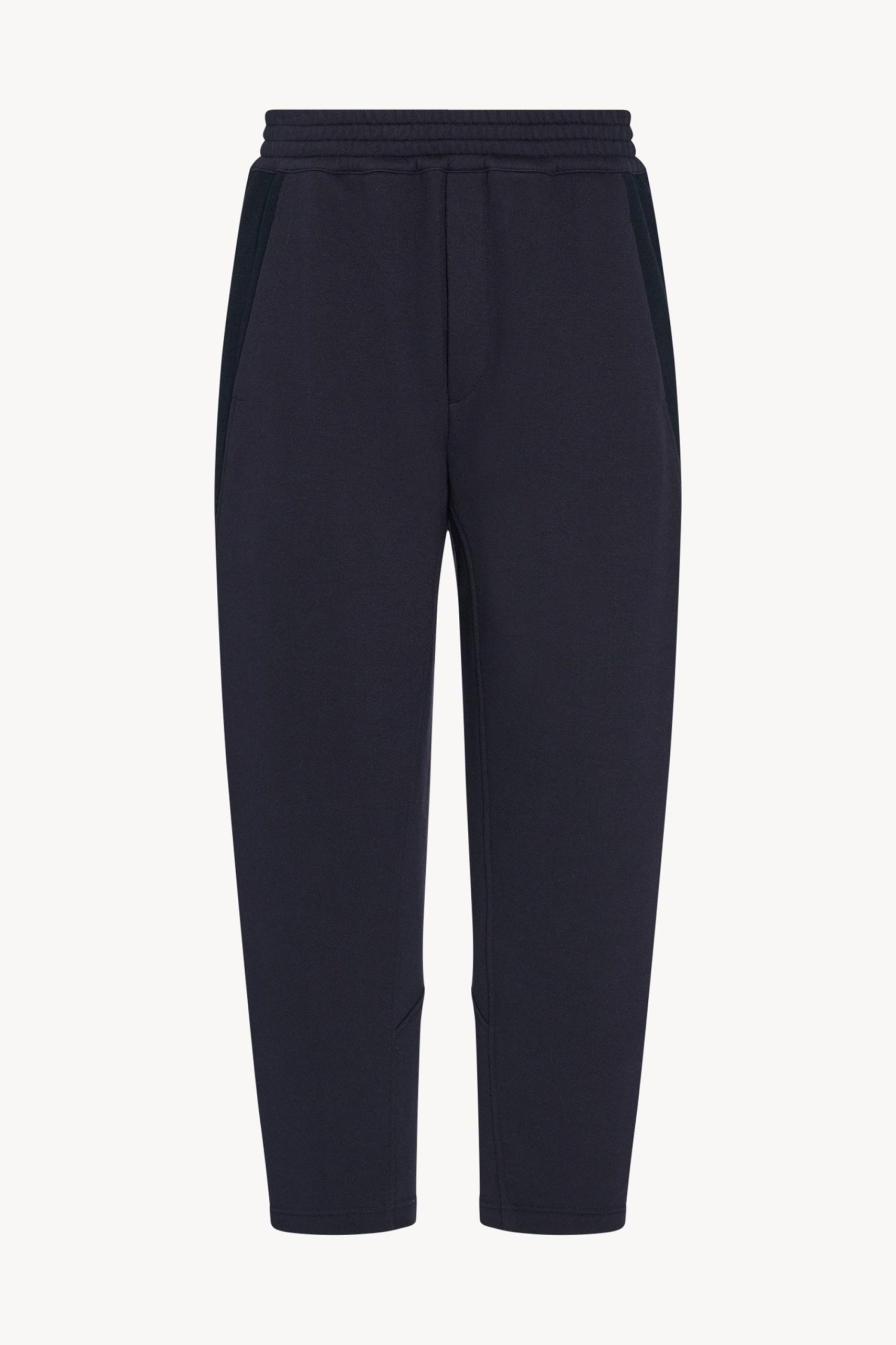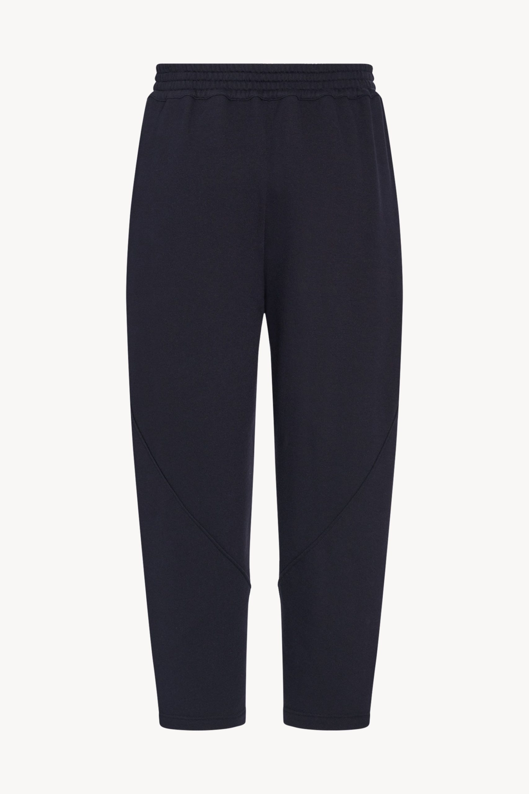 Relaxed pull-on pant in cotton and cashmere French terry with tapered hem. side seam pockets. and topstitched elastic waistband.