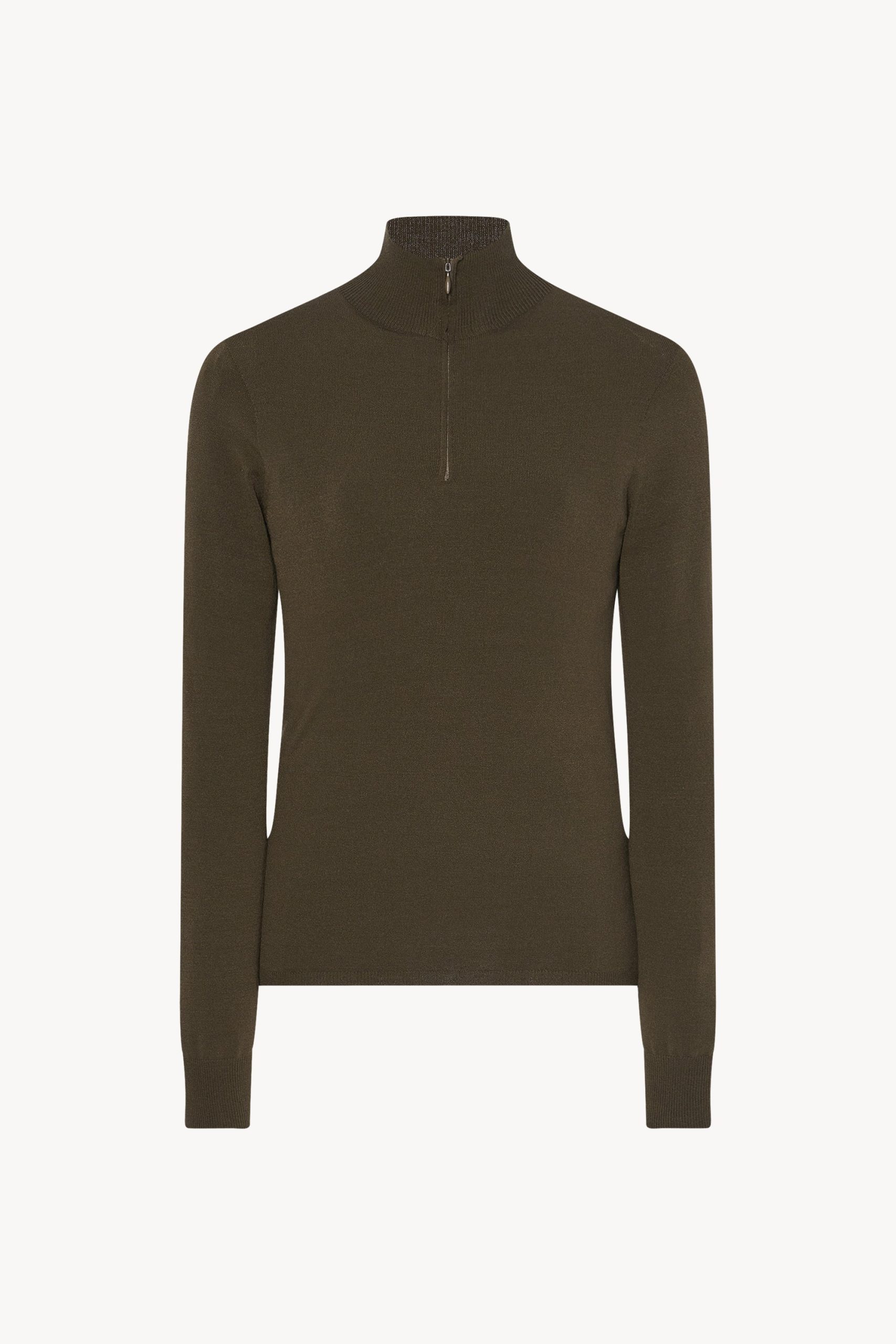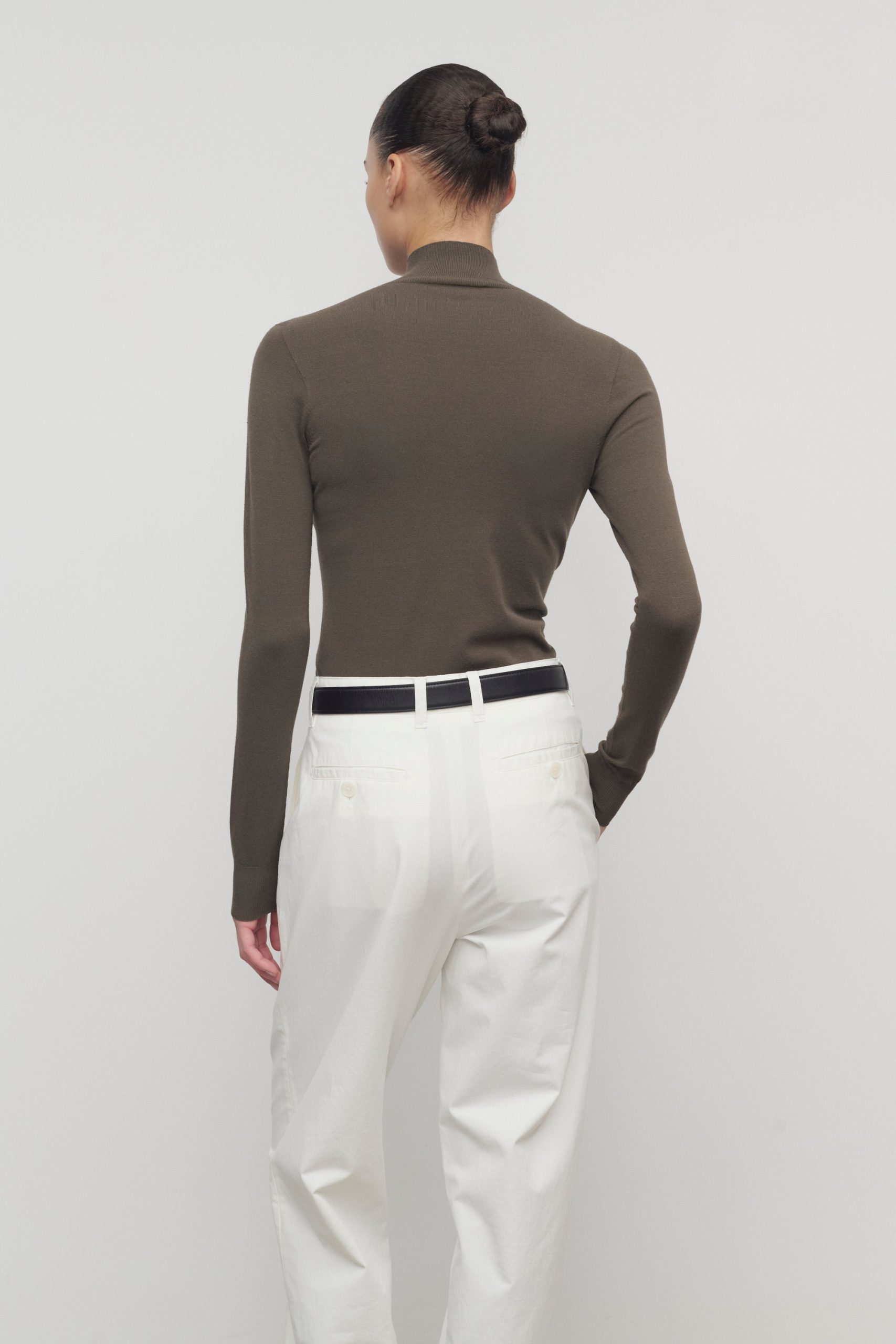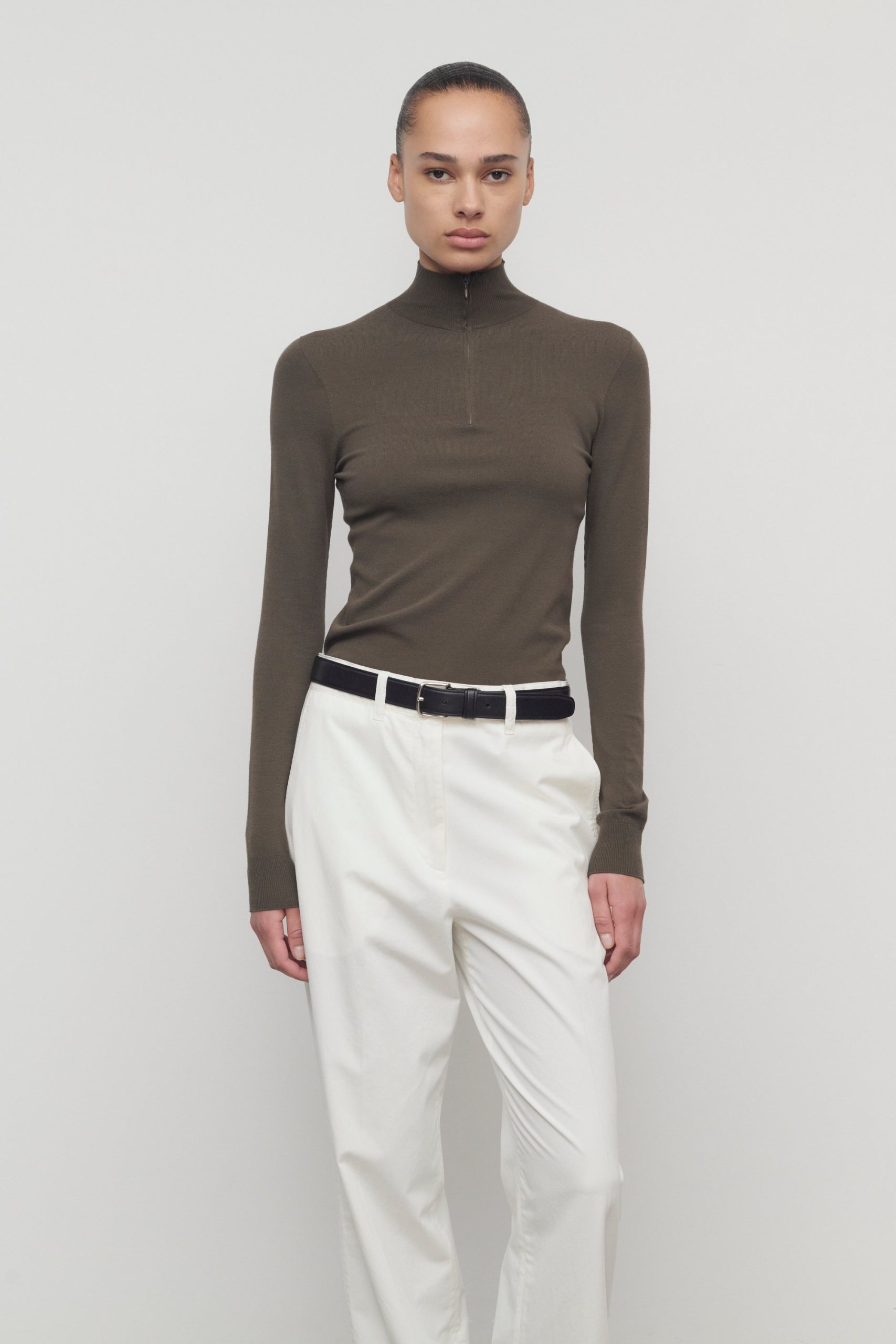 Long-sleeved turtleneck sweater in ultrasoft stretch jersey with slim fit. front half-zip closure. and ribbed neckline. cuffs. and hem.