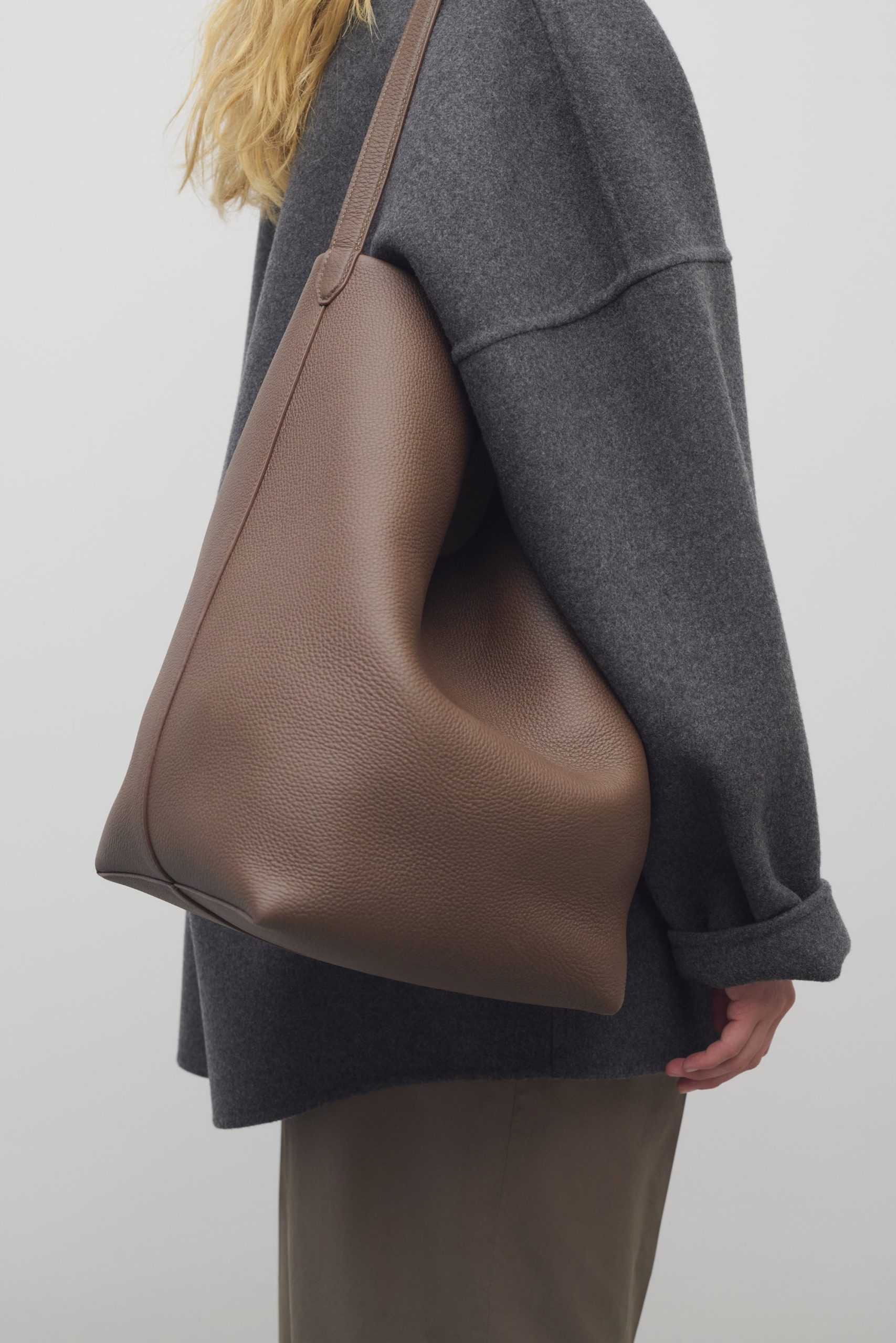 Classic tote bag in textured calfskin leather with interior toggle closure and flat handle.