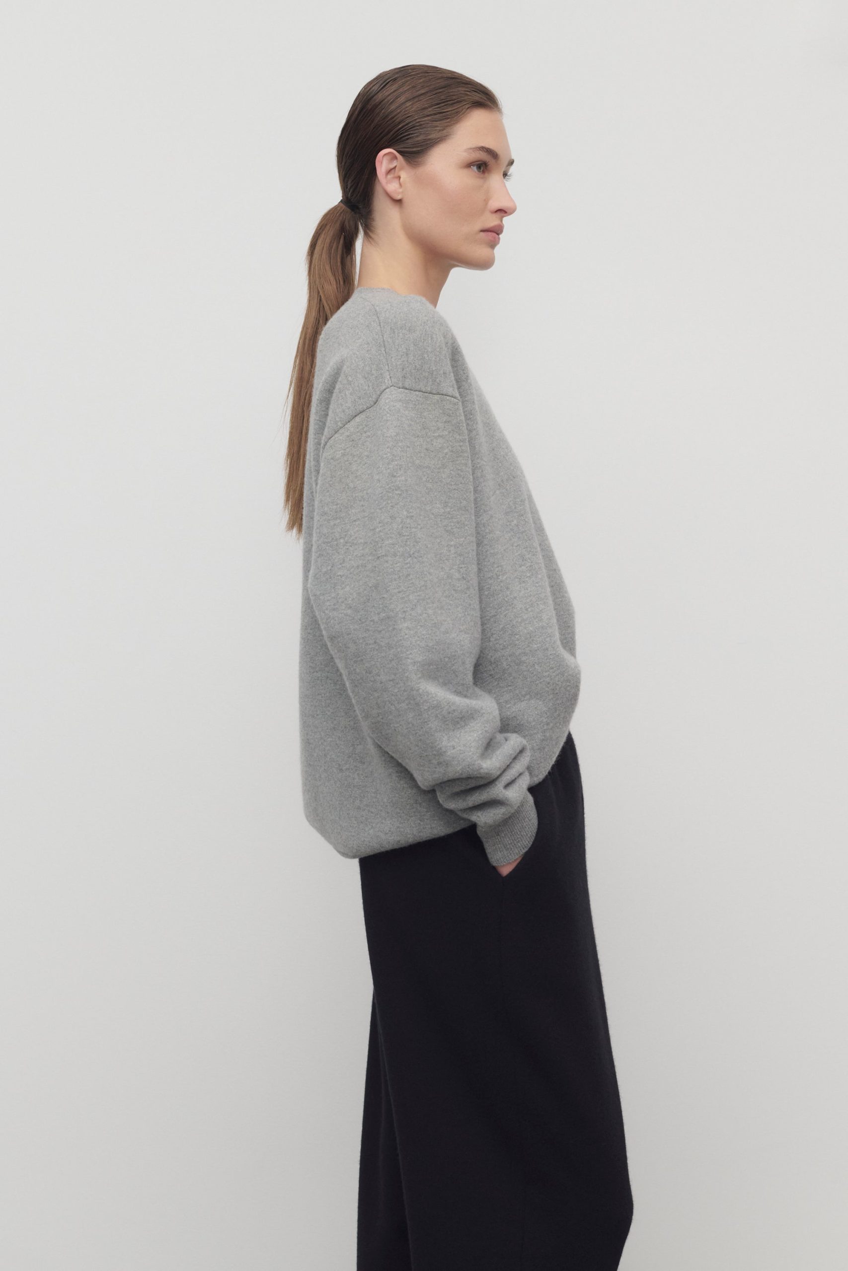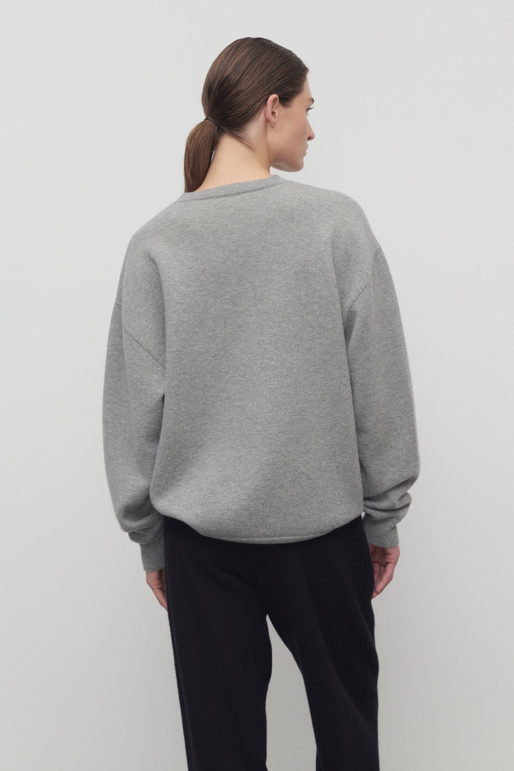 Classic crewneck sweater in ultrafine cashmere with relaxed fit. looped terry interior. and ribbed neckline. cuffs. and hem.