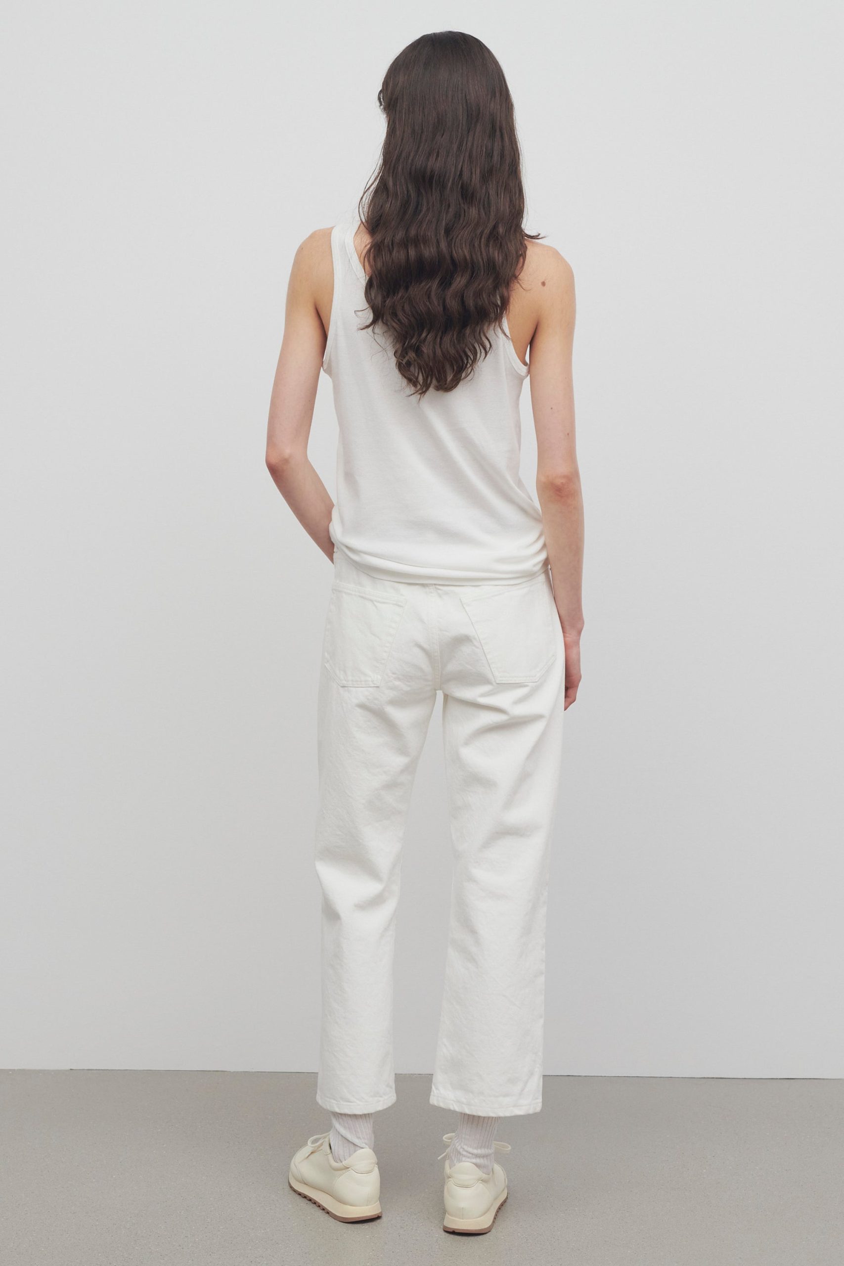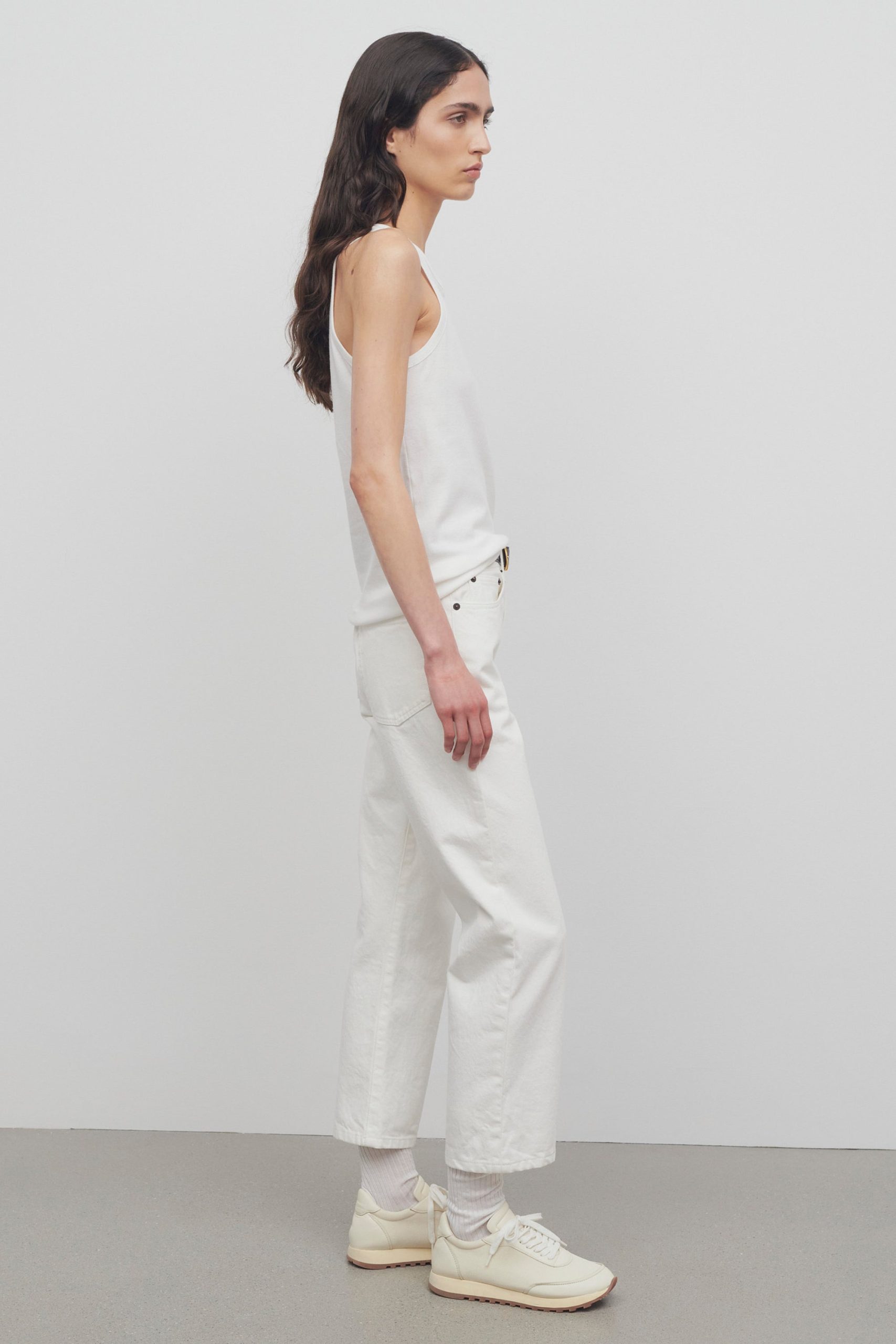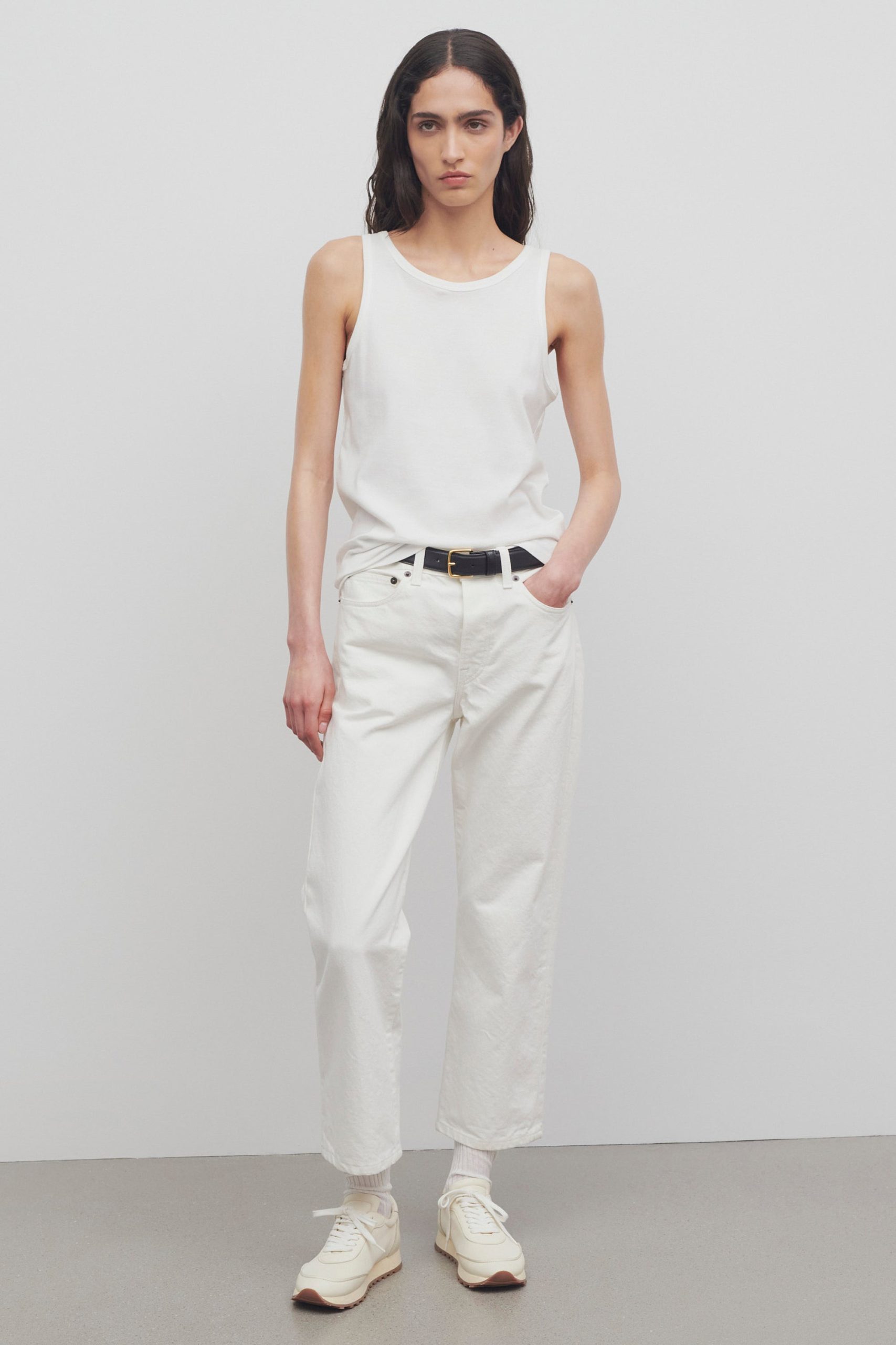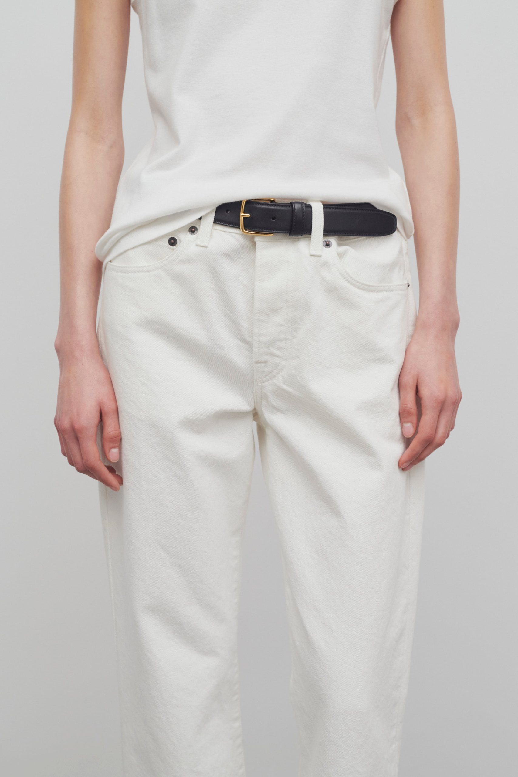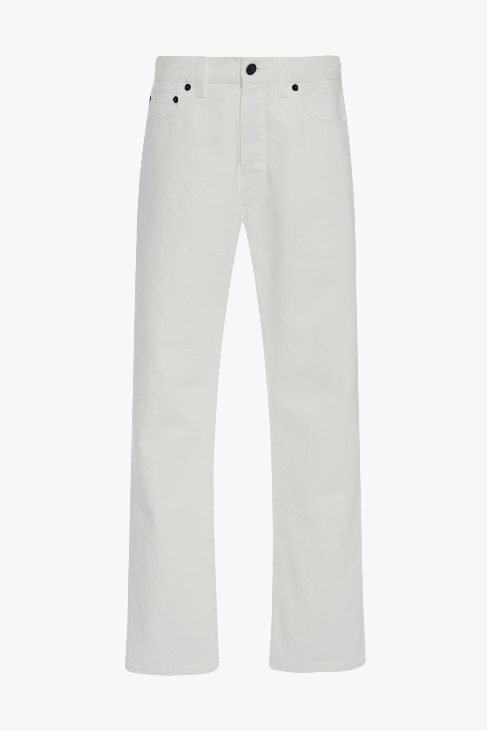 Mid-rise ankle length 5-pocket jean in cotton denim with slim fit. straight leg. and subtly flared hem.