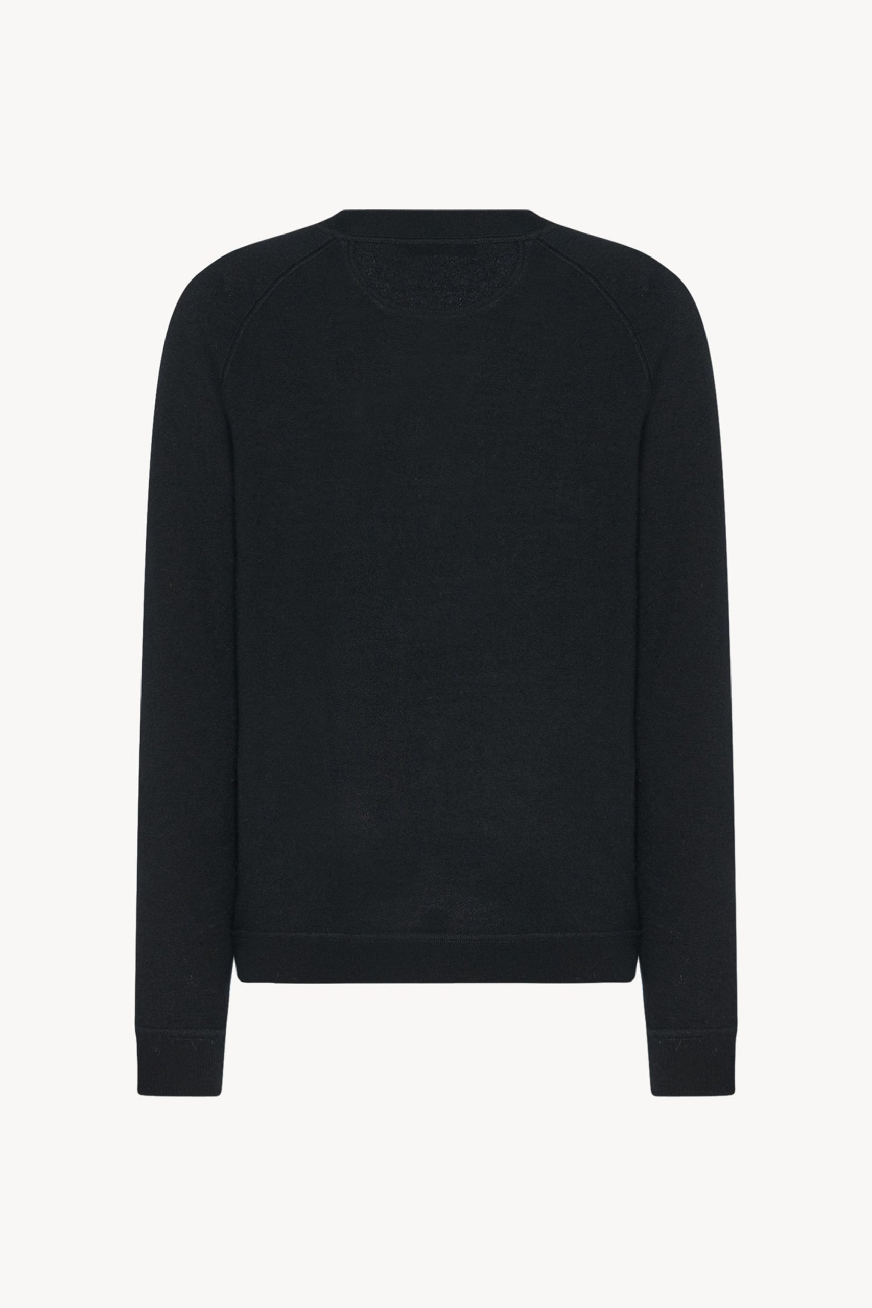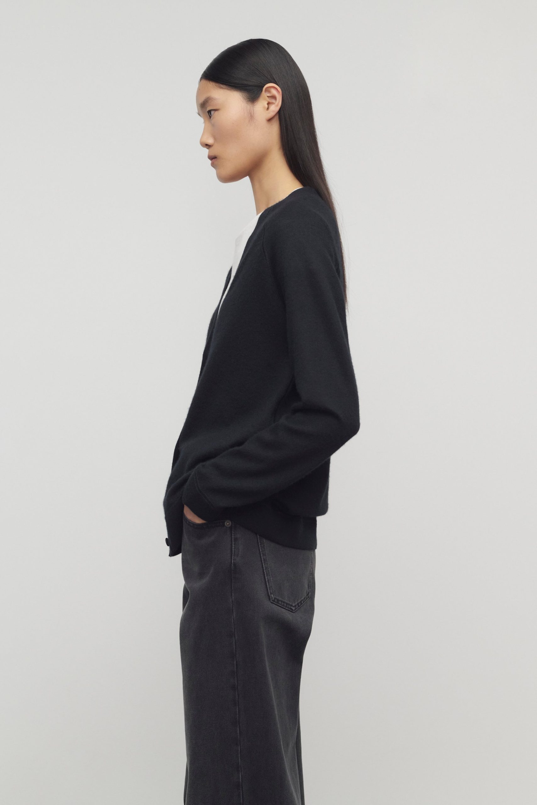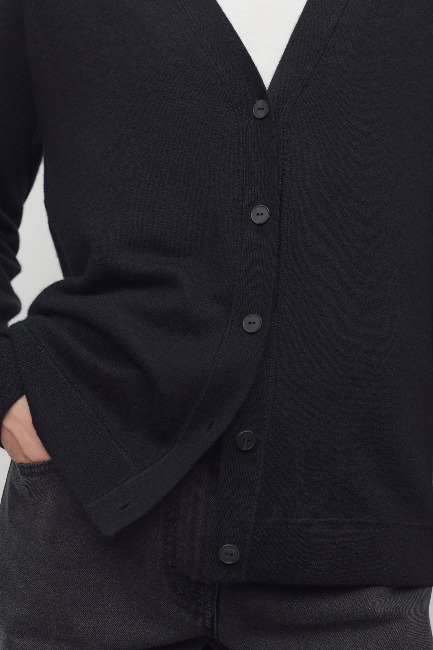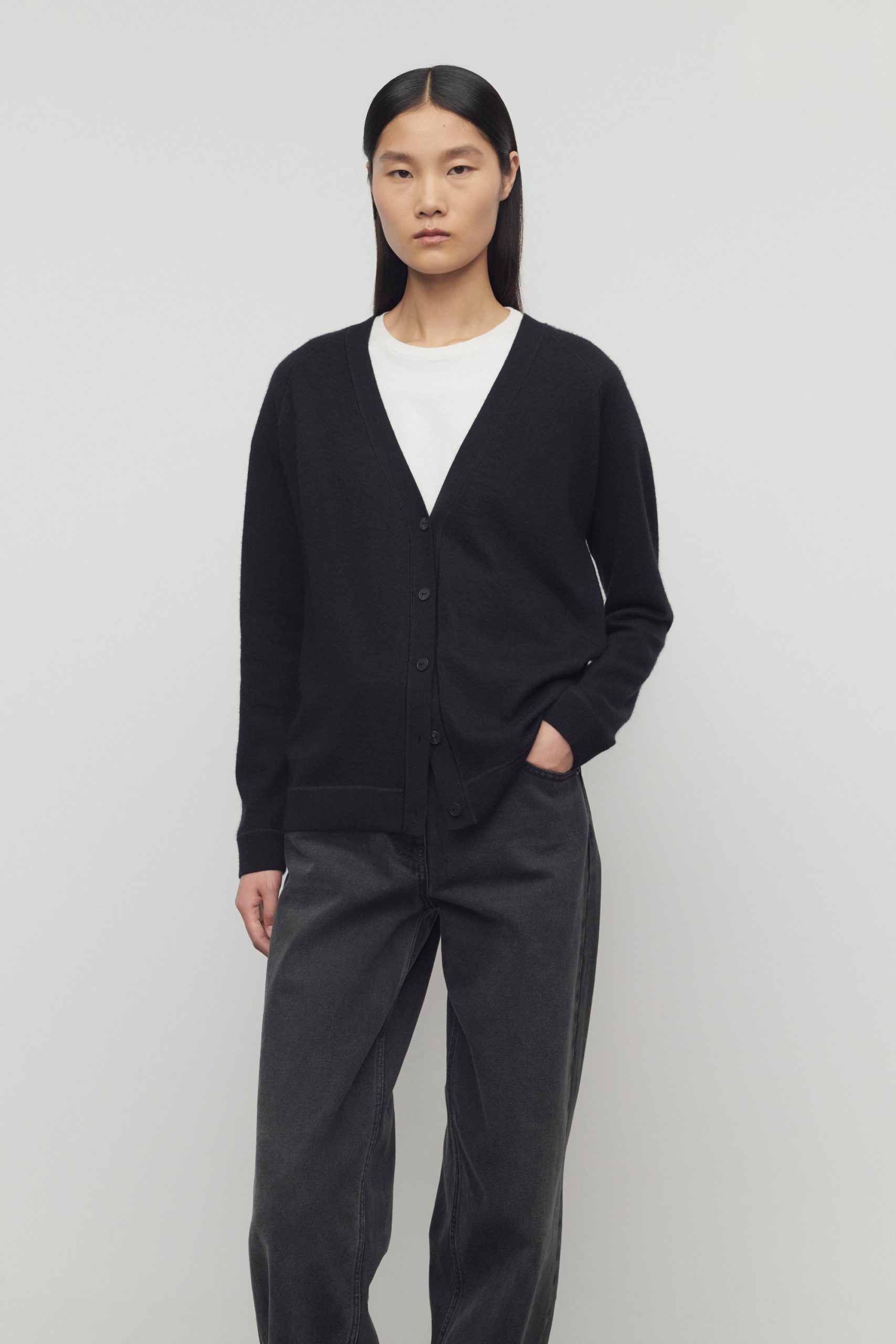 Relaxed v-neck cardigan in ultrafine cashmere jersey with covered stitch detailing. front button closure. and ribbed cuffs and hem.