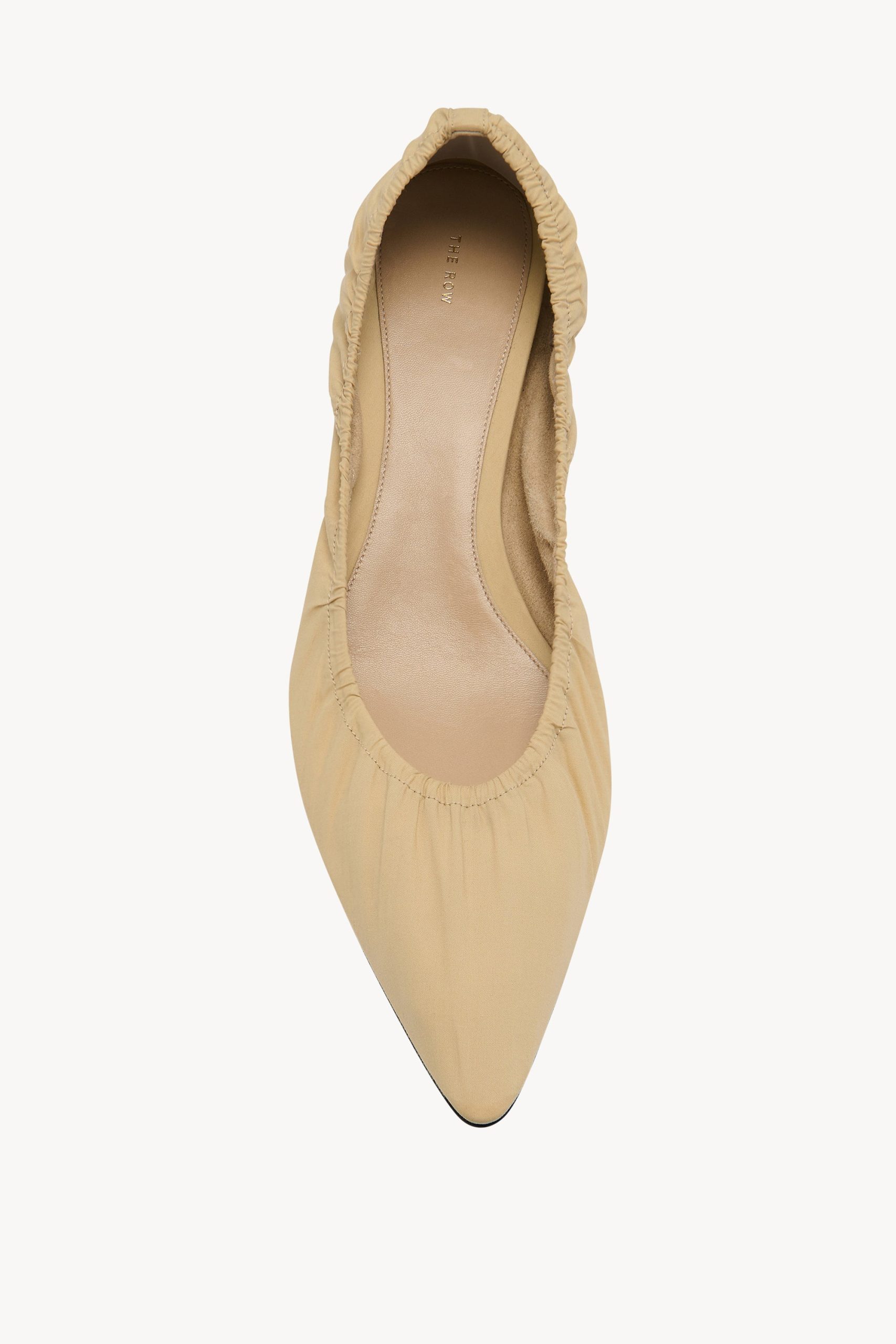 Kitten heel in washed cotton poplin with pointed toe. soft elastic trim. and leather sole.