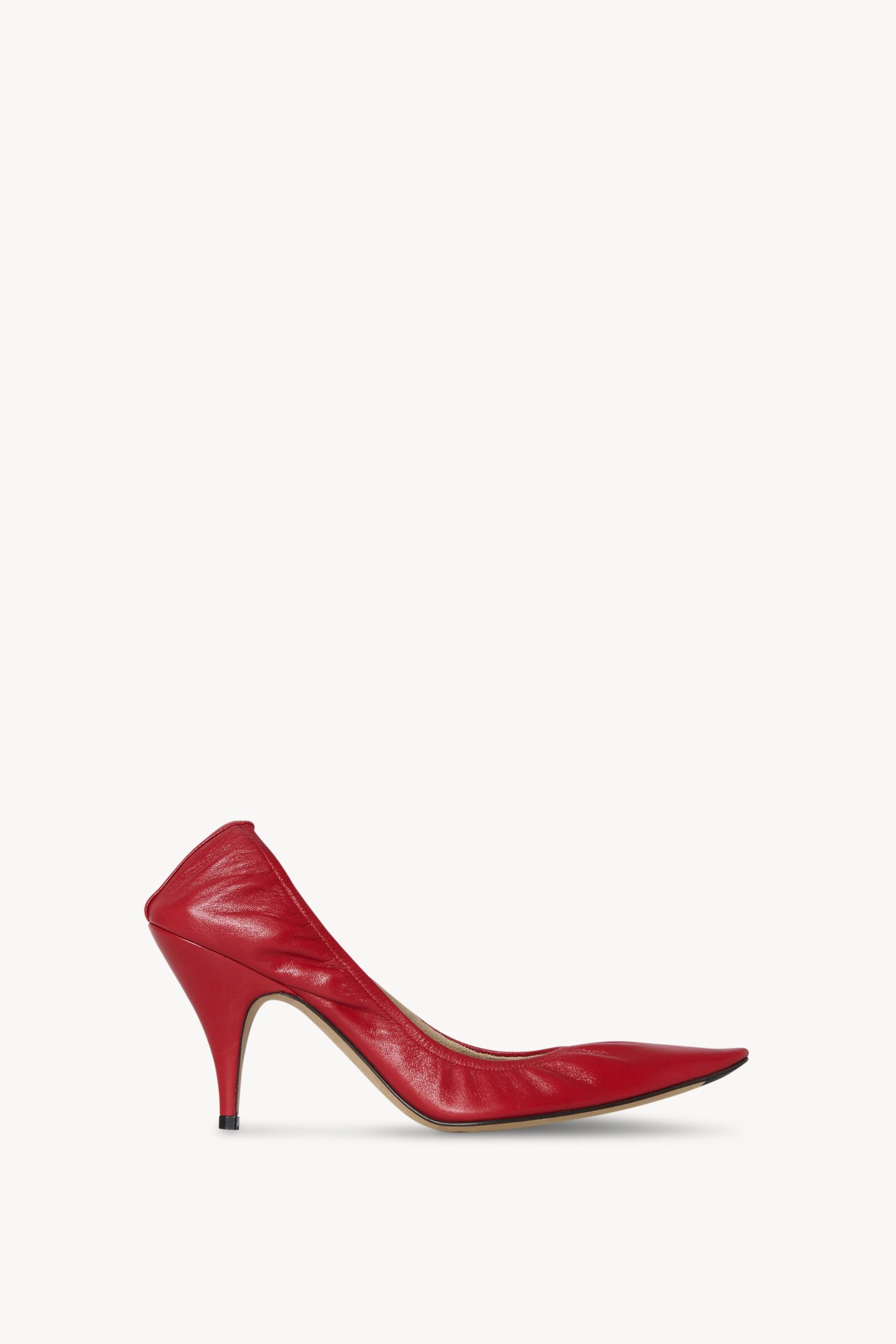 High heel shoe in soft lambskin leather with pointed toe. soft elastic trim. and leather sole.