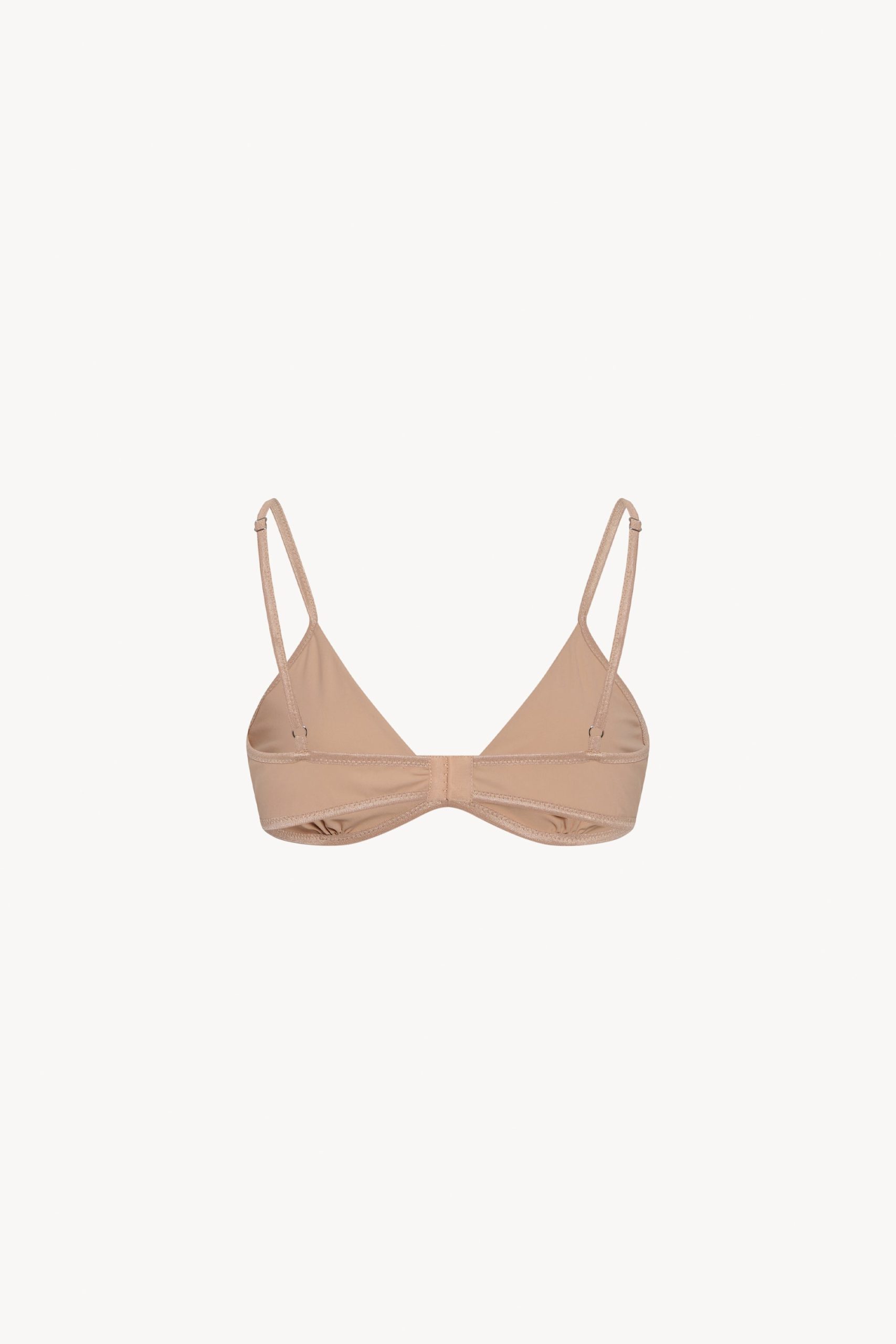 Triangle bralette in ultra-light breathable jersey with adjustable spaghetti straps. ruched front detail. and back hook and eye closures.