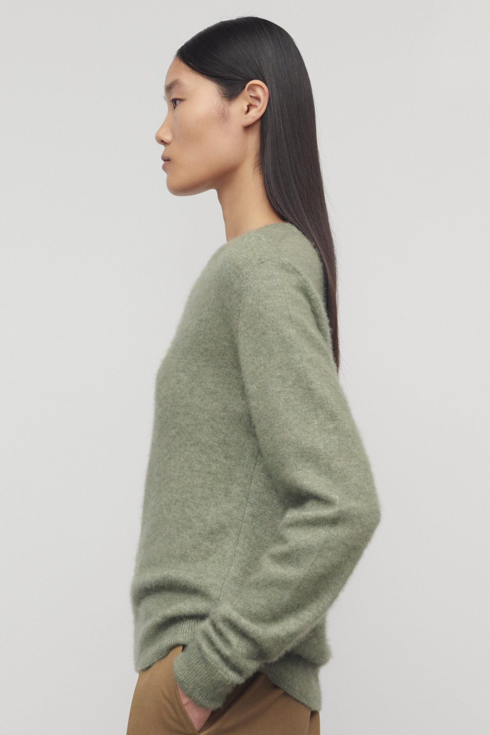 Classic crewneck sweater in textured cashmere and silk with regular fit and ribbed neckline. cuffs. and hem.