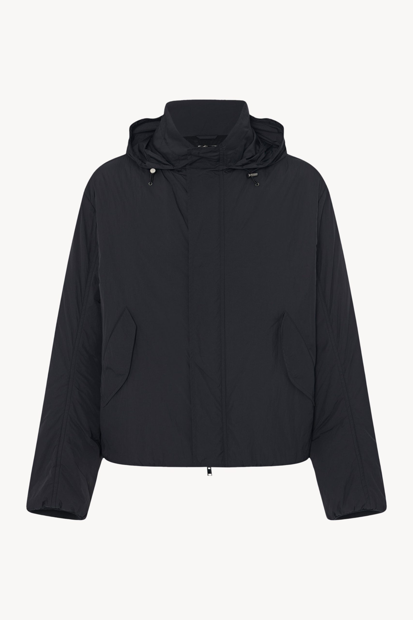Technical bomber jacket in lightweight water repellent nylon with elasticated hood and cuffs. slanted front flap pockets. and concealed front placket with snap and zipper closure.