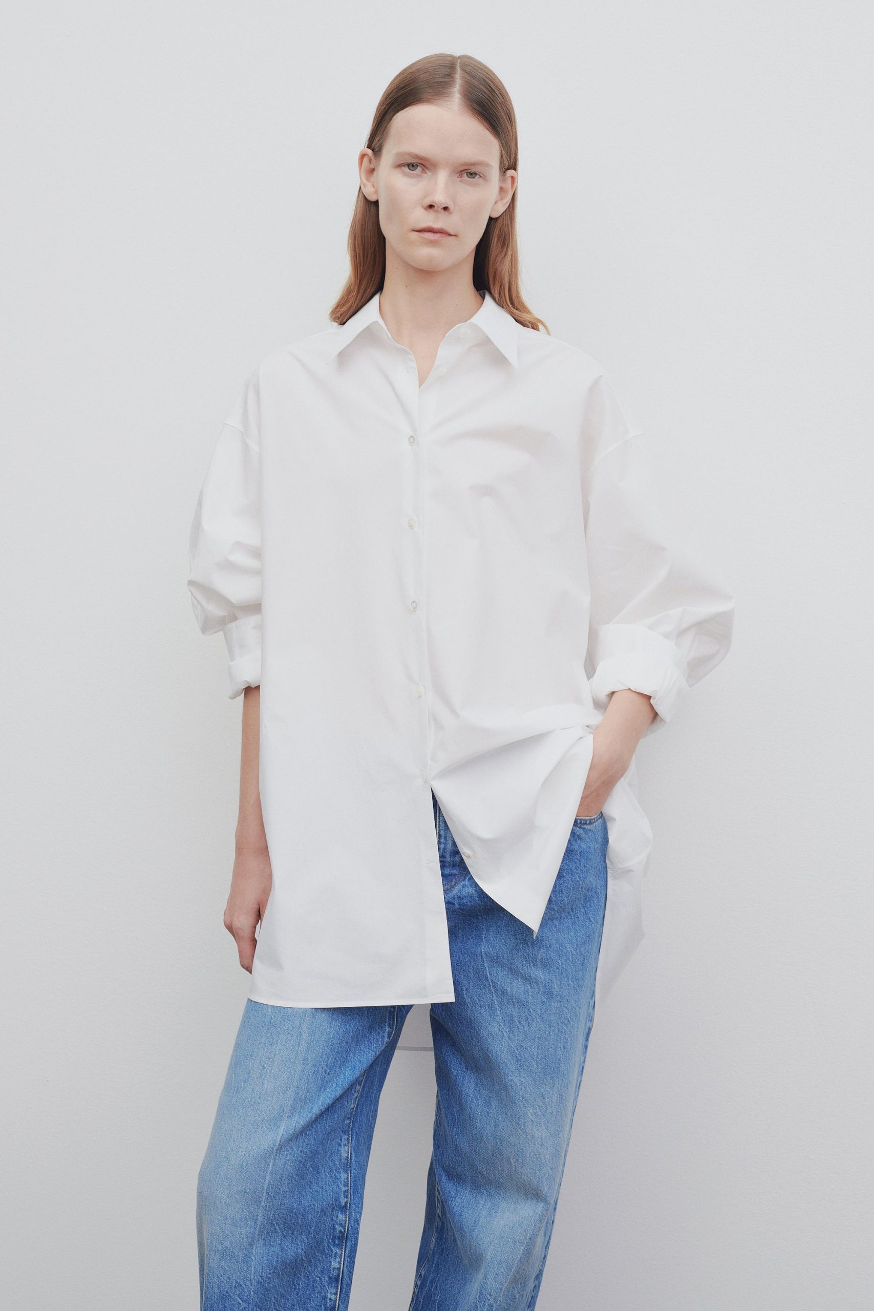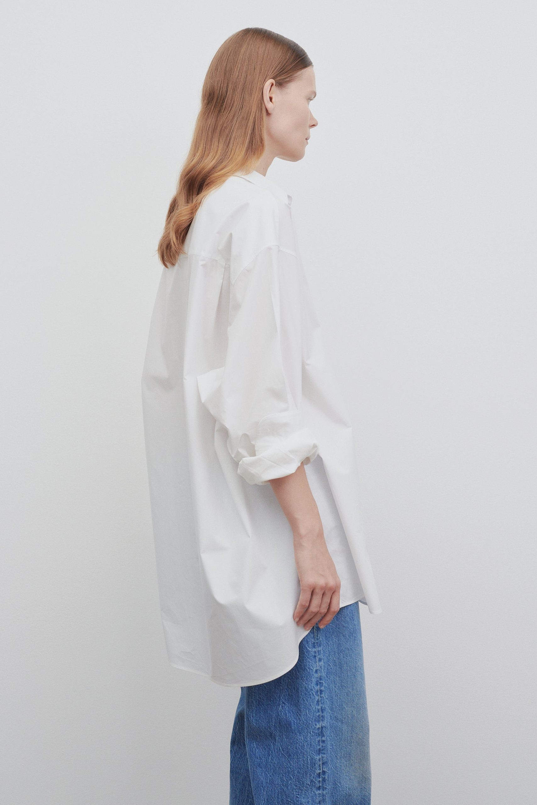 Oversized button-down shirt in crisp cotton poplin with menswear-inspired silhouette and curved shirttail hem.