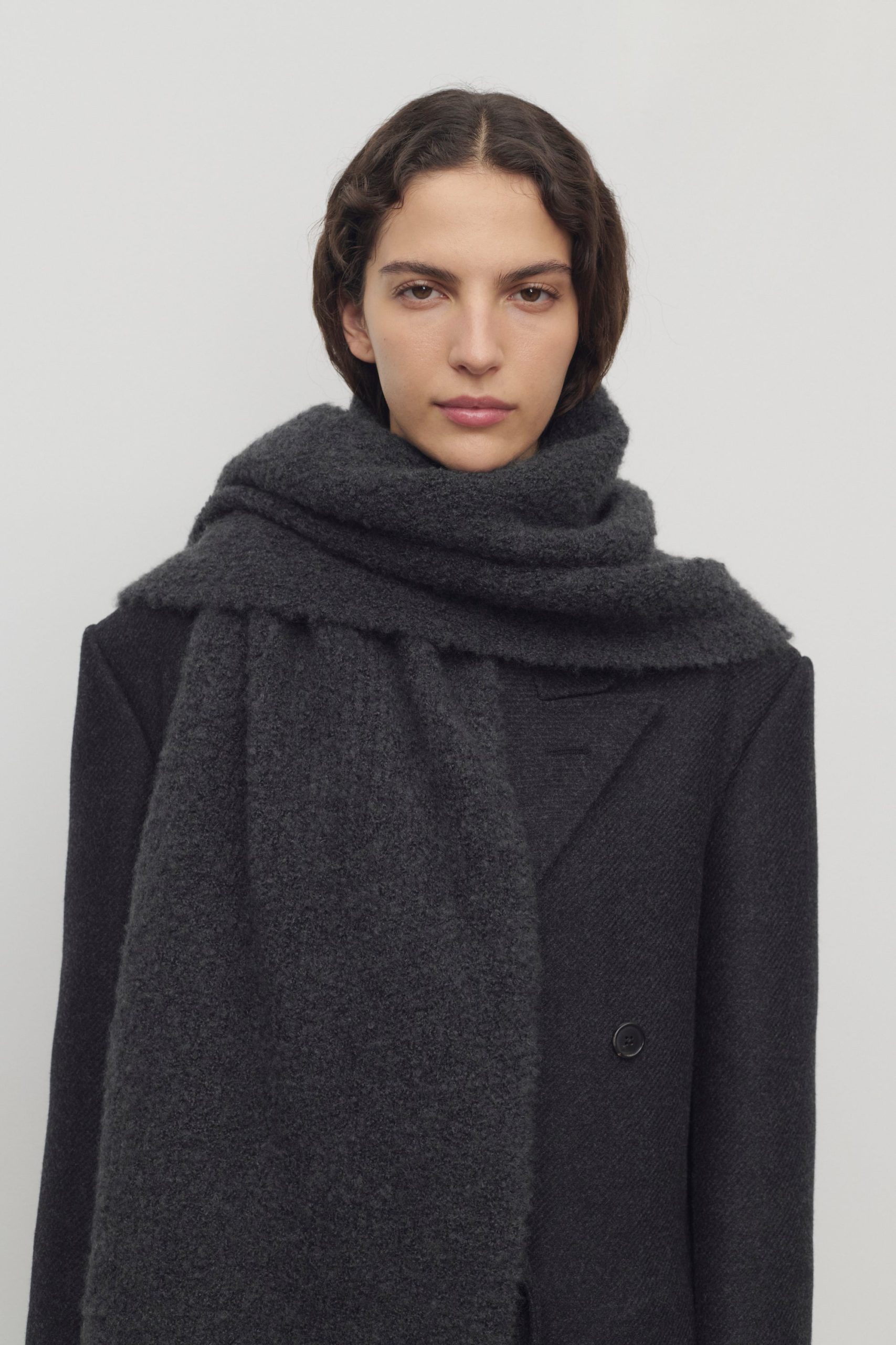 Extra-long knit scarf in textured alpaca and cashmere boucl?? with clean edge finish.