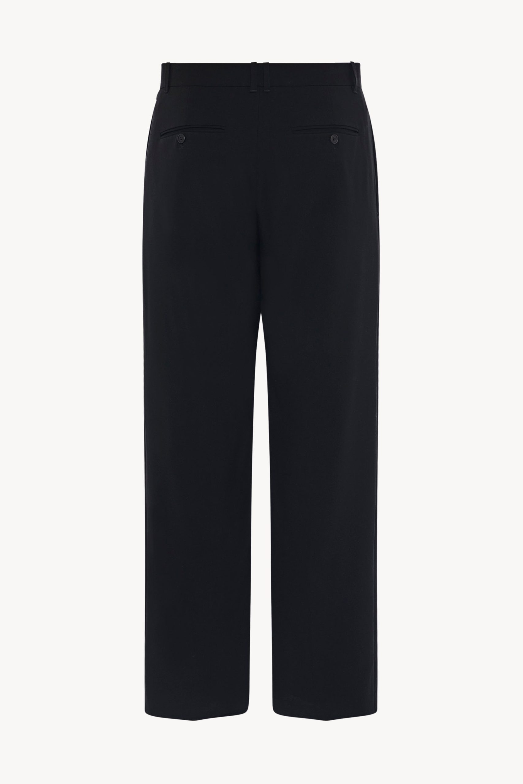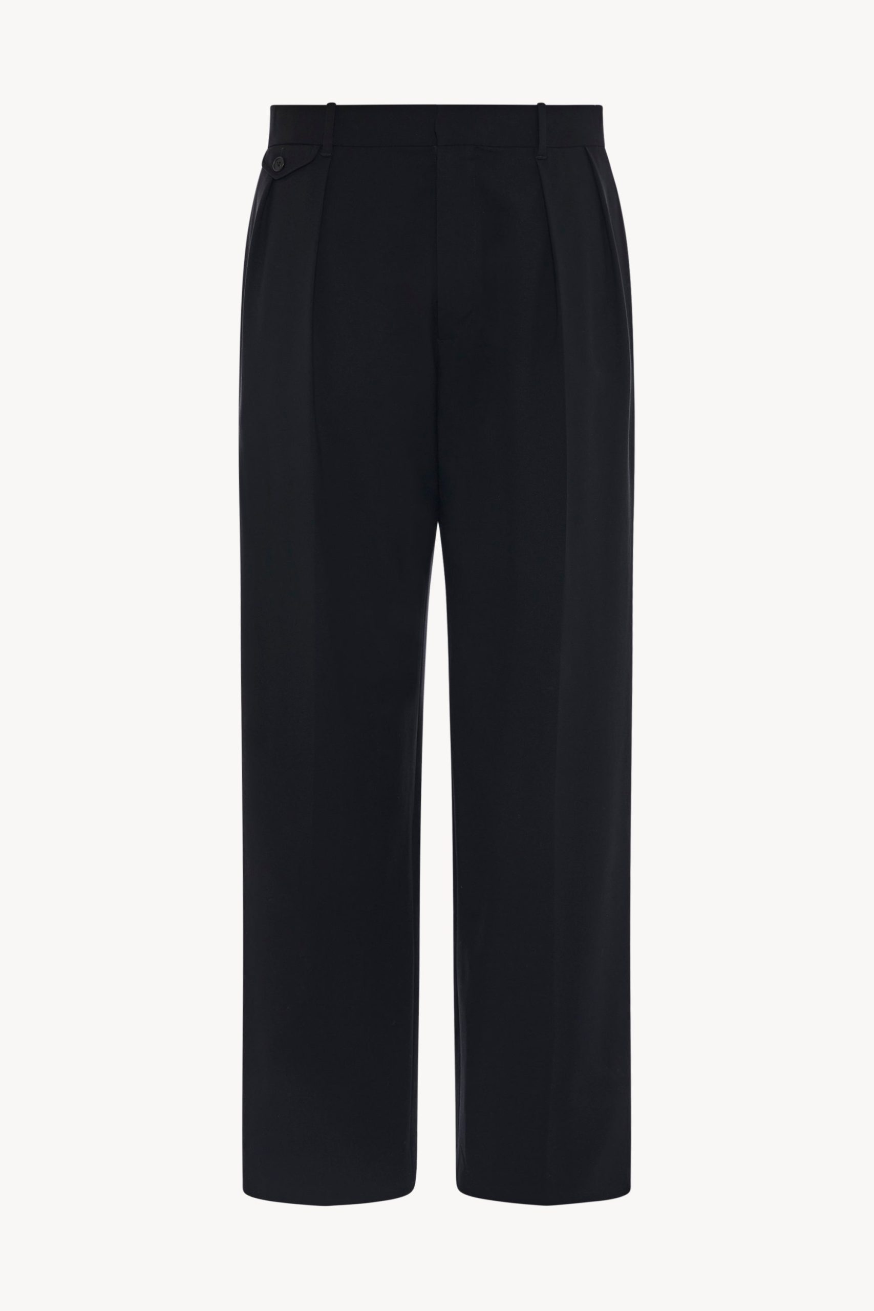 Mid-waisted pant in soft wool gabardine with double pleated front. side seam pockets. button-down back pockets and triangular coin pocket.