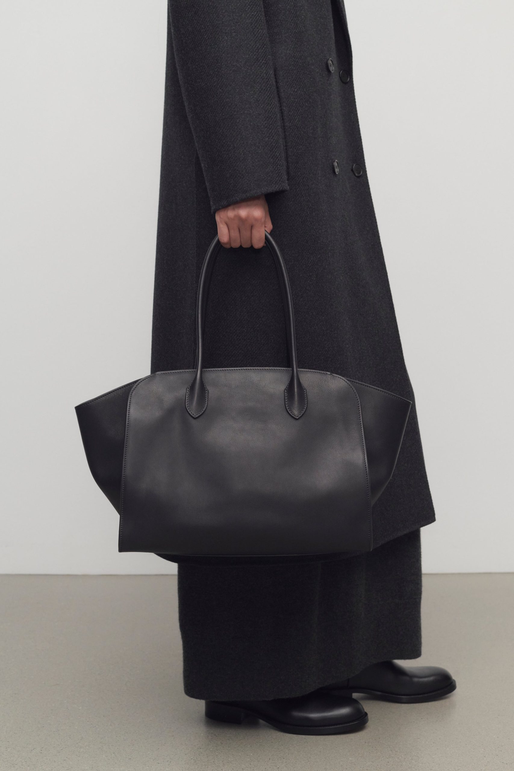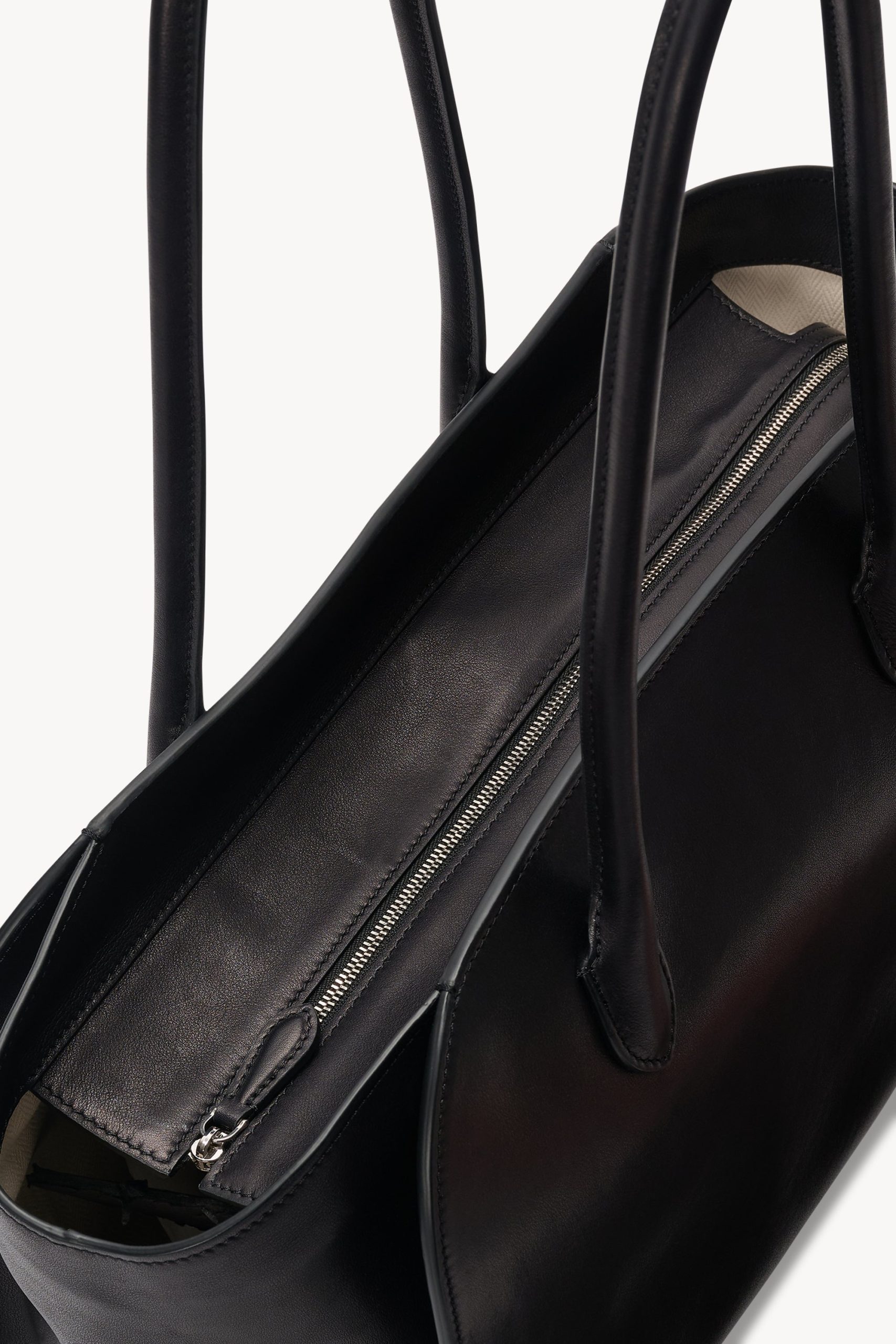 Softly structured tote bag in polished saddle leather with tubular handles. gusseted side panels. and top zipper closure. Untreated and drum-dyed. the leather develops character with time and use.