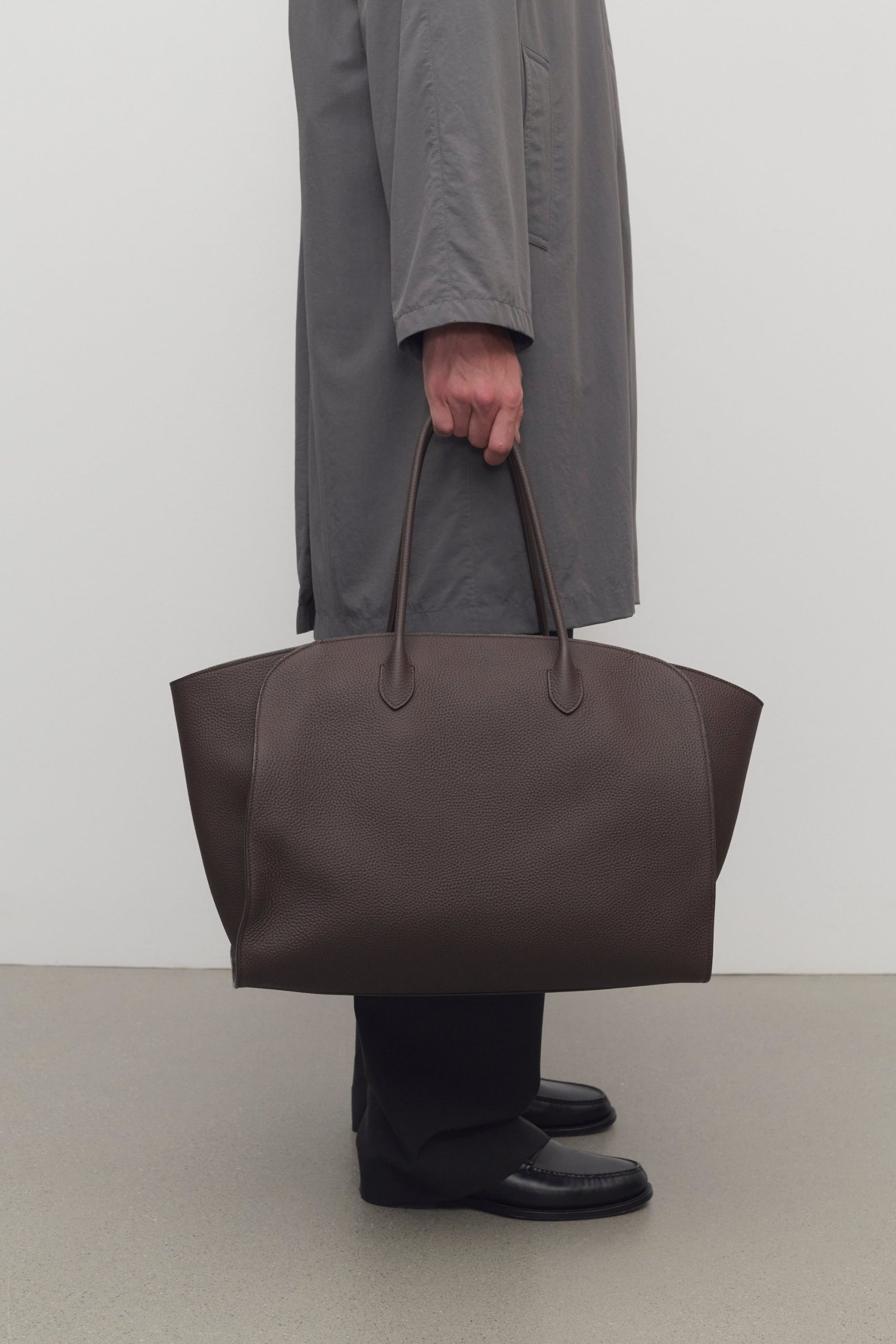 Softly structured tote bag in matte grained calfskin leather with tubular handles. gusseted side panels. and top zipper closure.