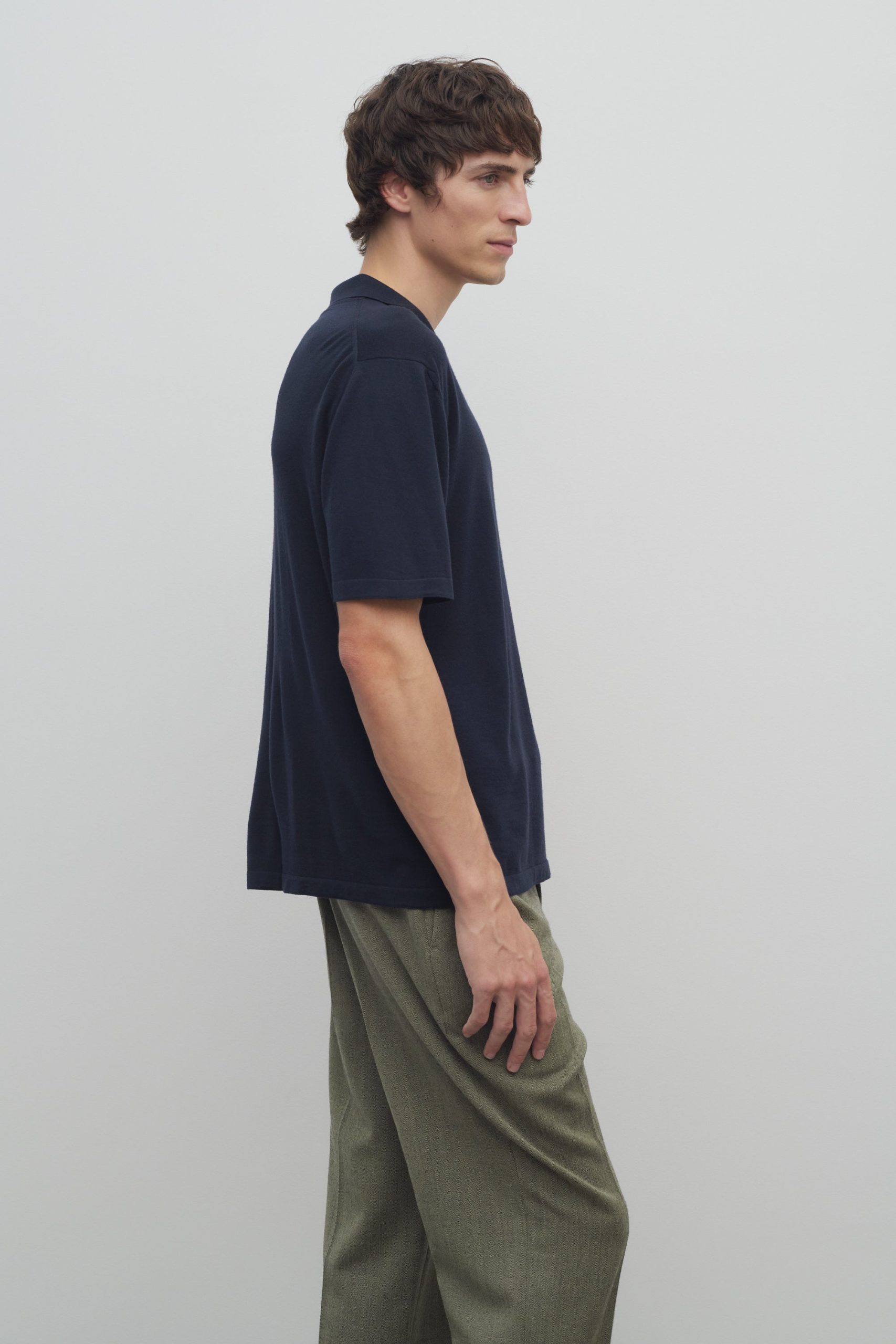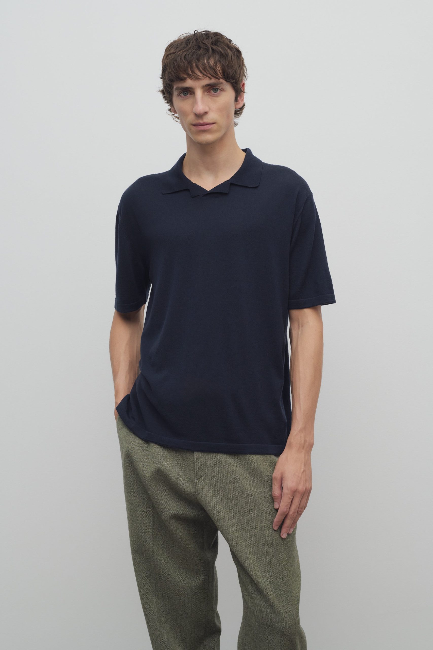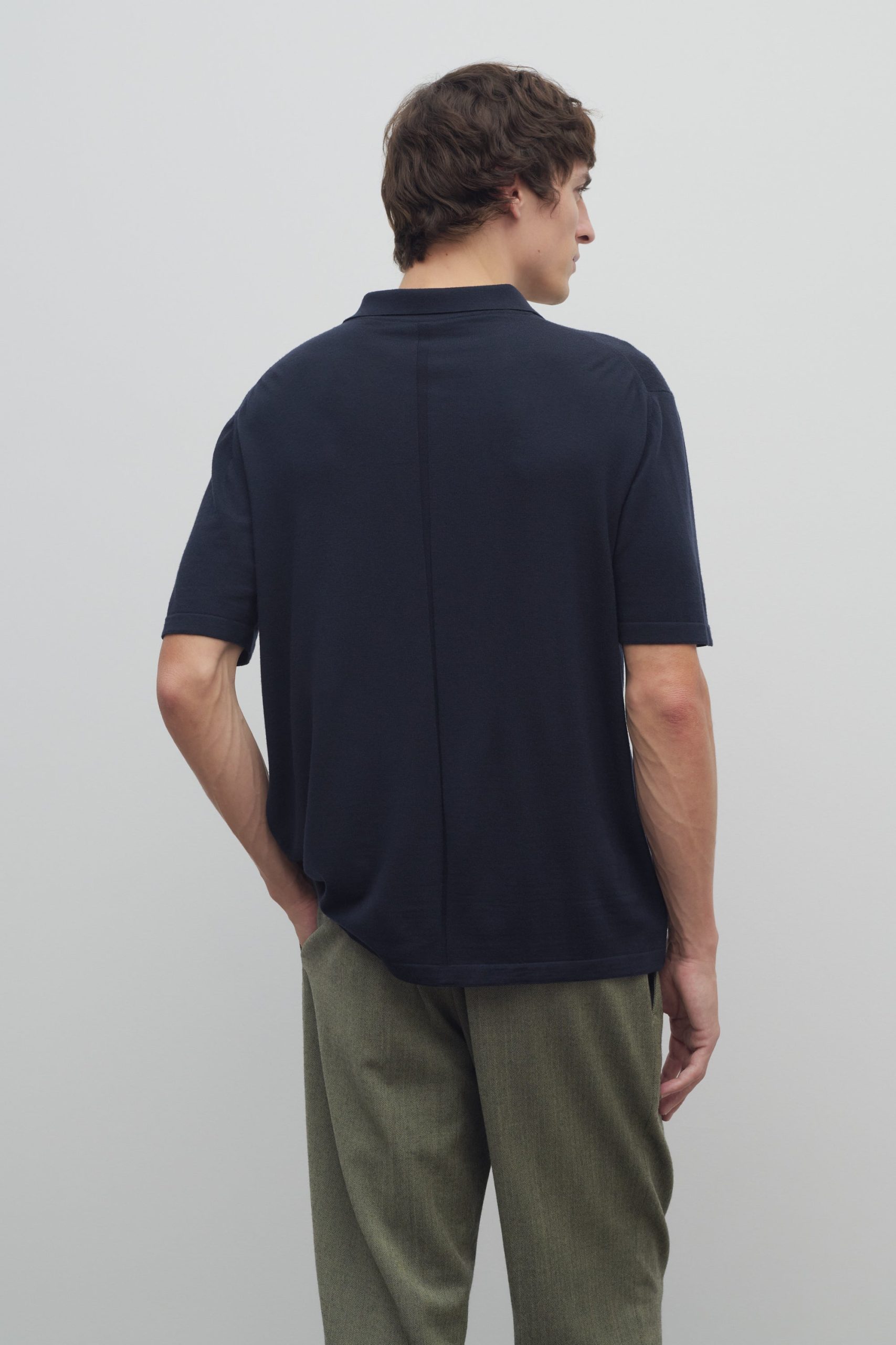 Short-sleeved polo top in ultrafine wool knit with slim fit. buttonless front tab. and signature center back detail.