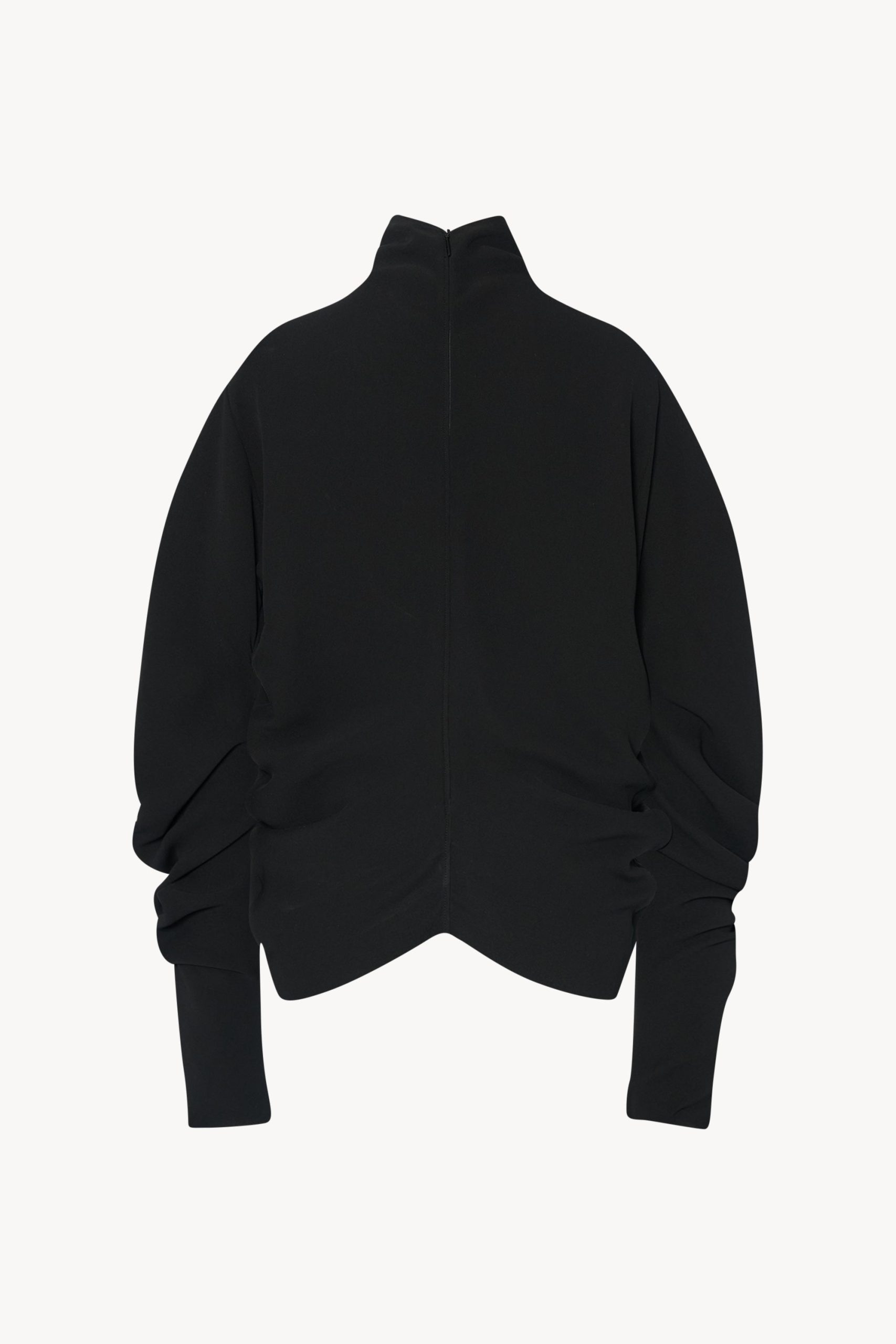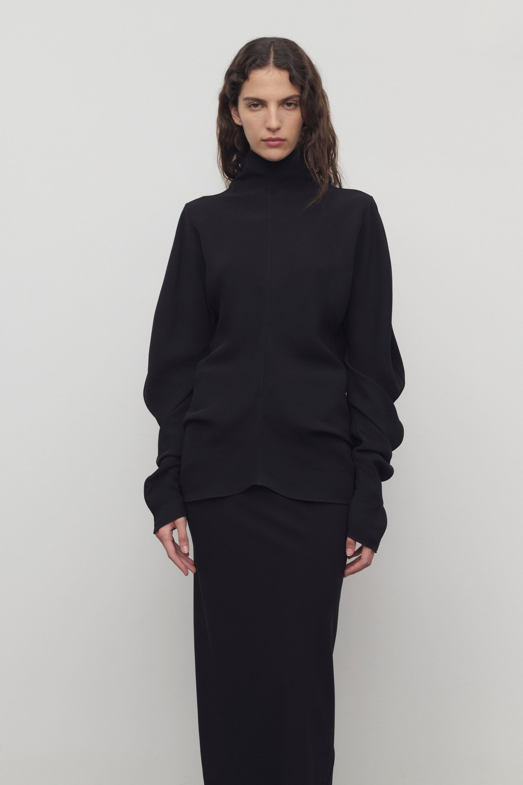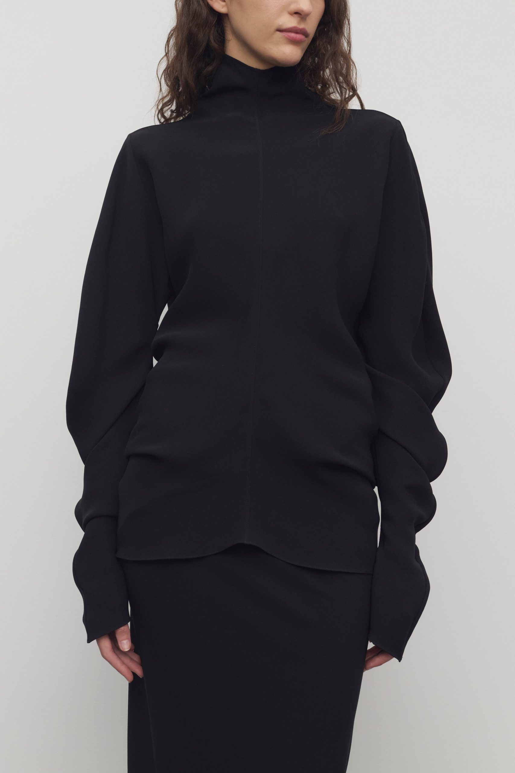 Sculptural long-sleeved top in crisp. lightweight silk with high neckline. gathered draping. and concealed back zipper closure.