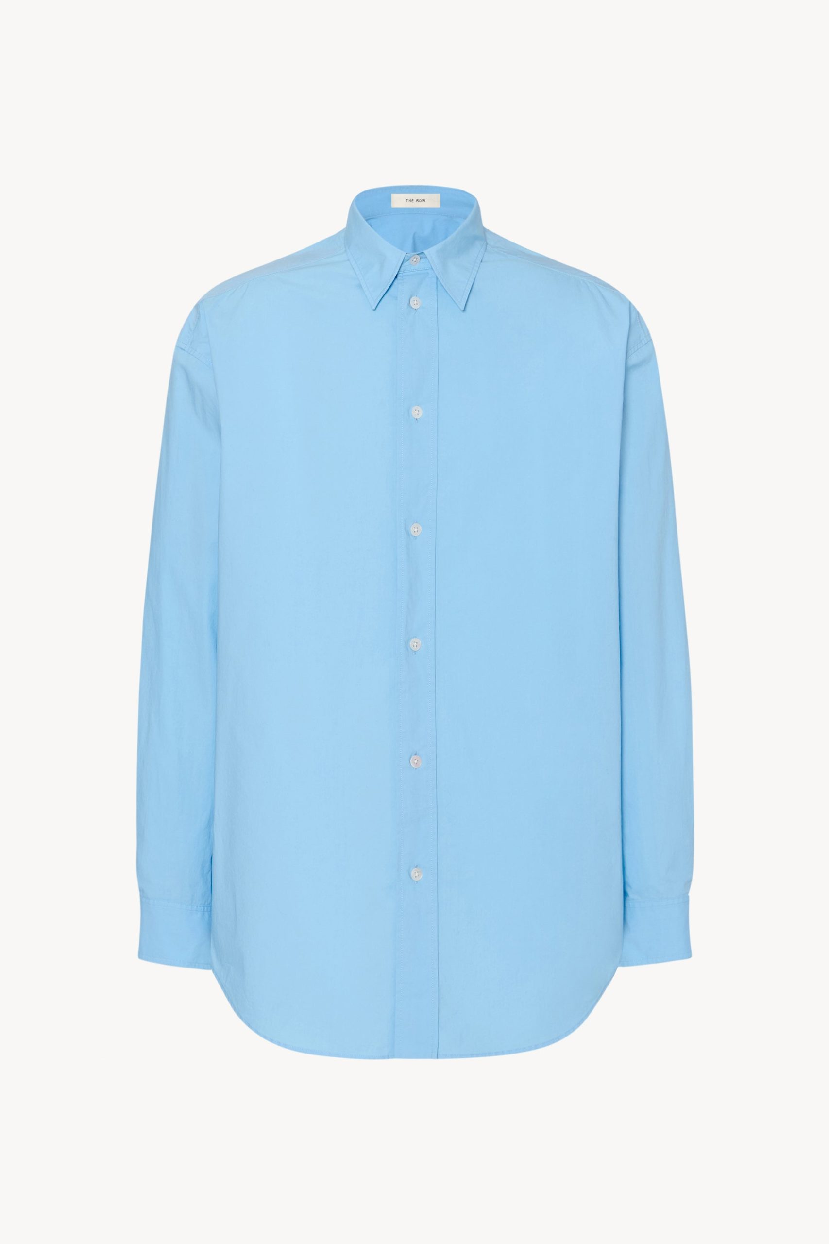Classic button-up shirt in washed cotton poplin with slim back yoke. curved hem. and exposed front placket with mother-of-pearl buttons.