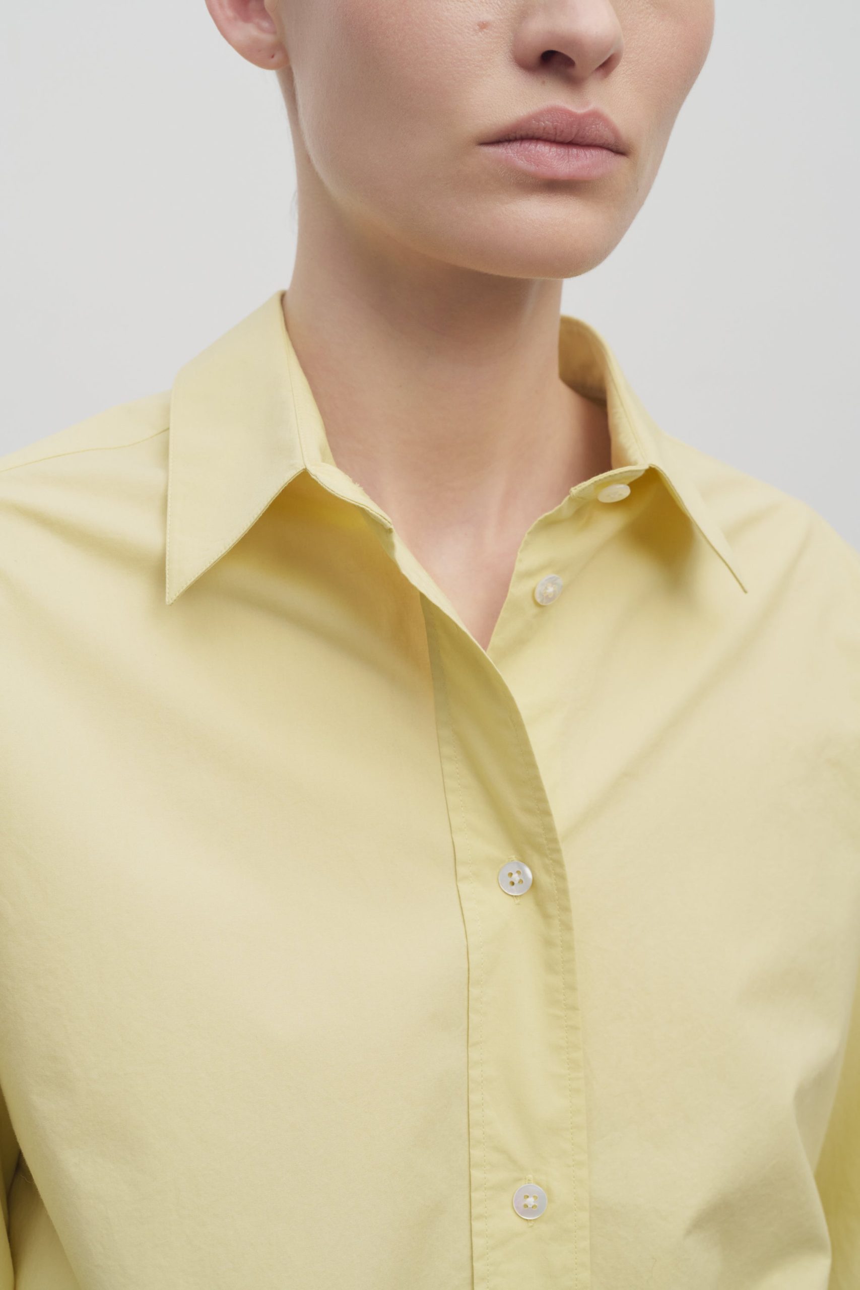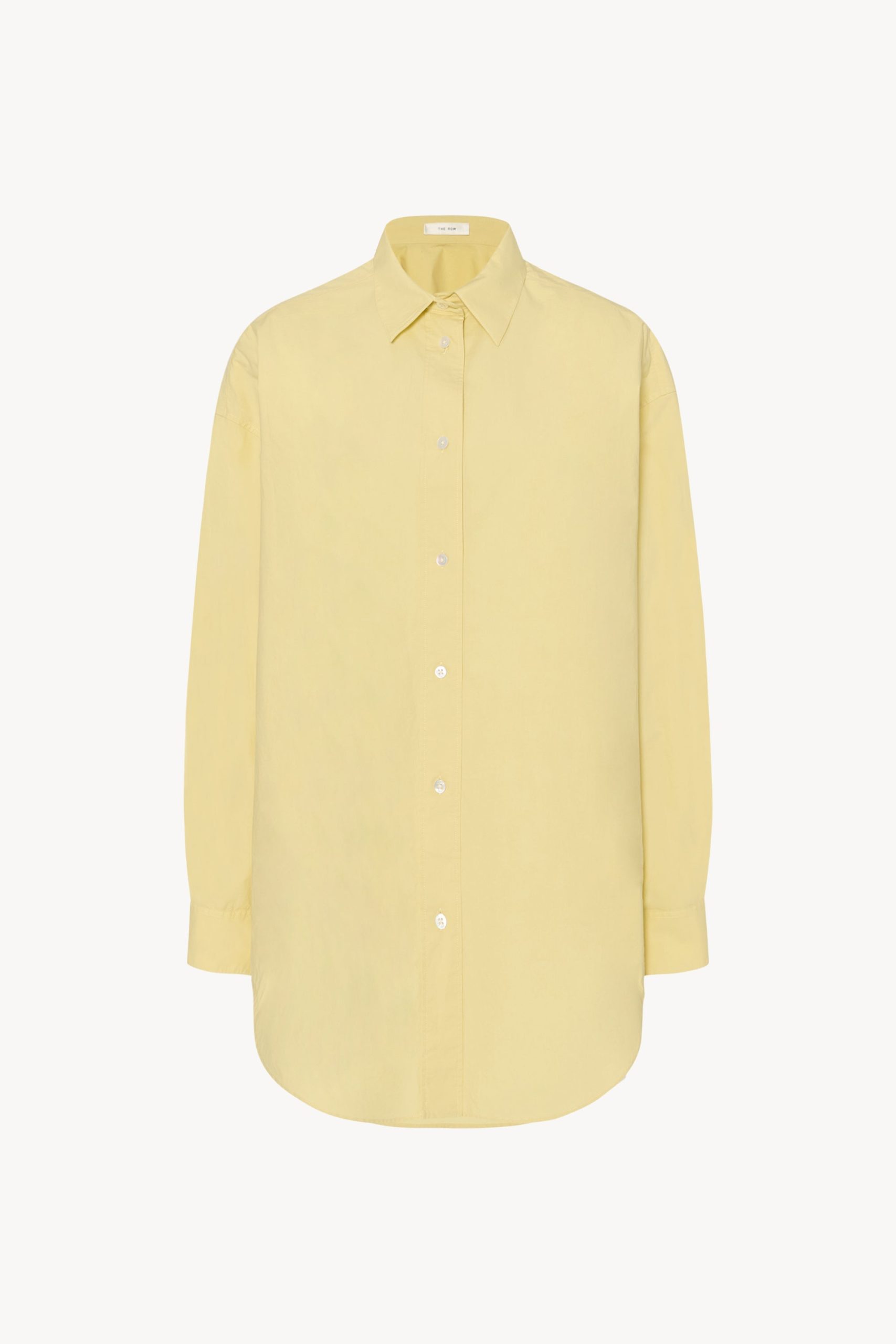 Classic button-up shirt in washed cotton poplin with curved hem. slim back yoke. and exposed front button placket.