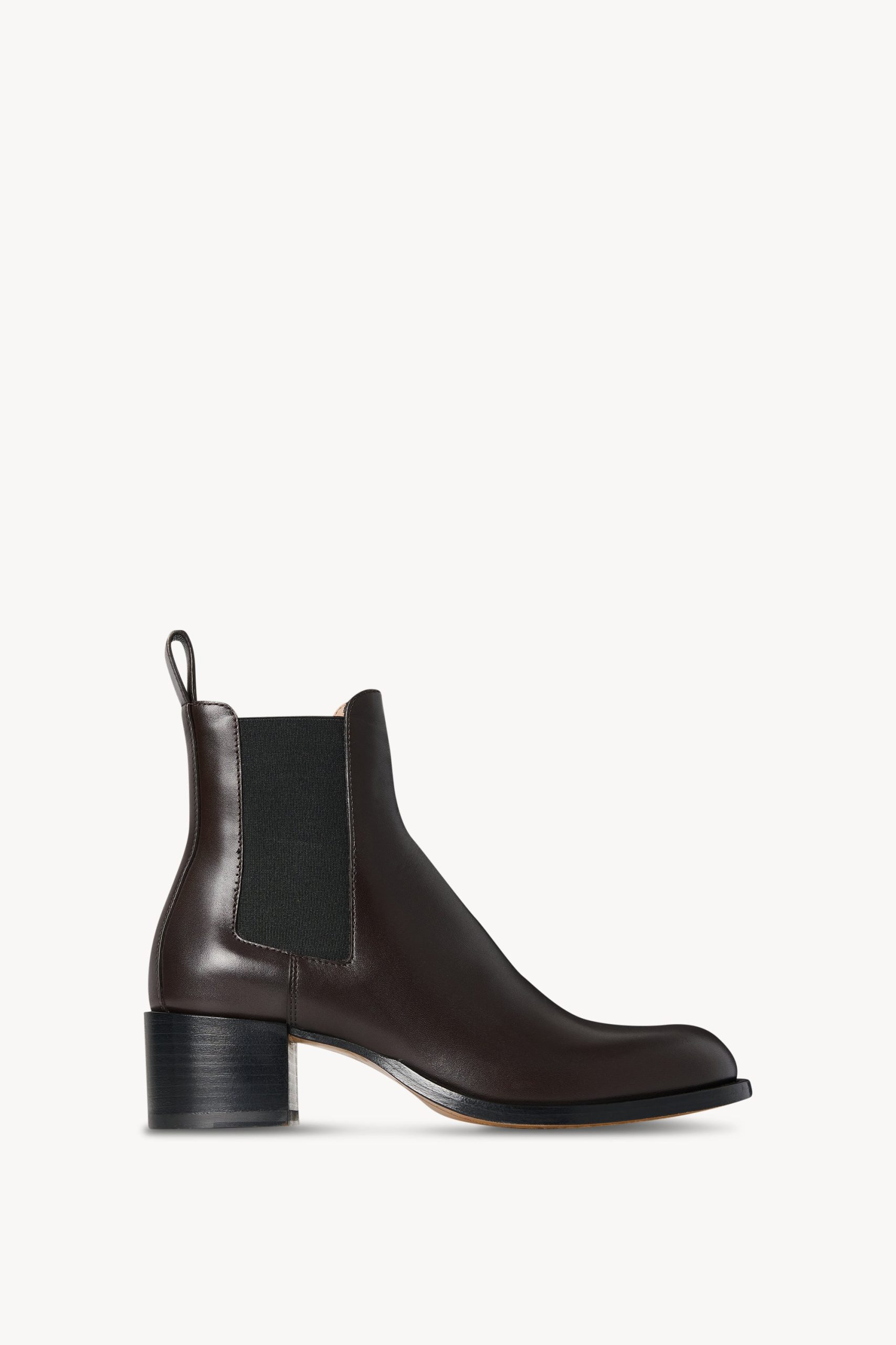 Heeled Chelsea boot in polished calfskin leather with round toe. elasticated side panels. and stacked leather heel.