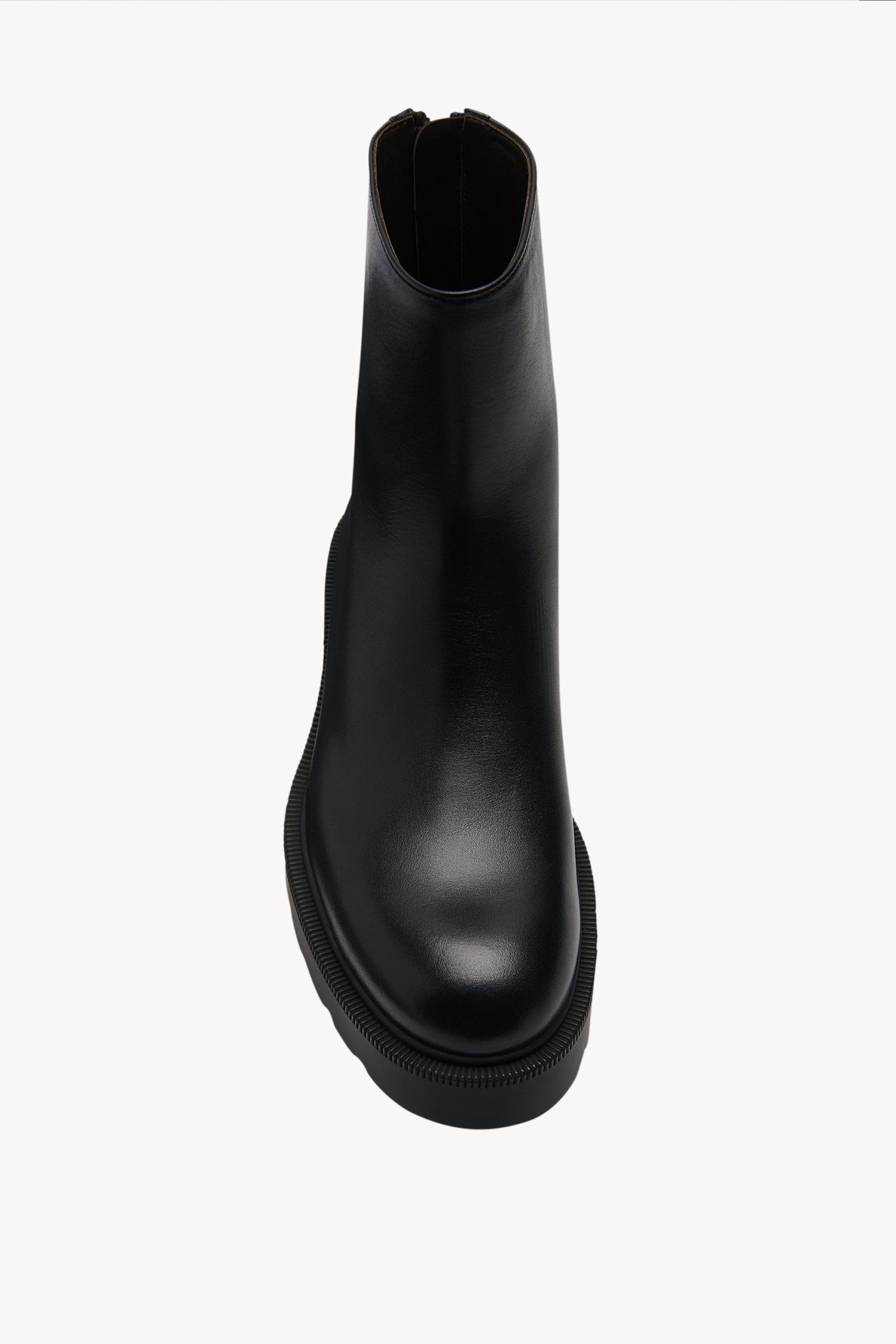 Versatile ankle boot in polished calfskin leather with round toe. back zipper closure. and treaded rubber platform sole.