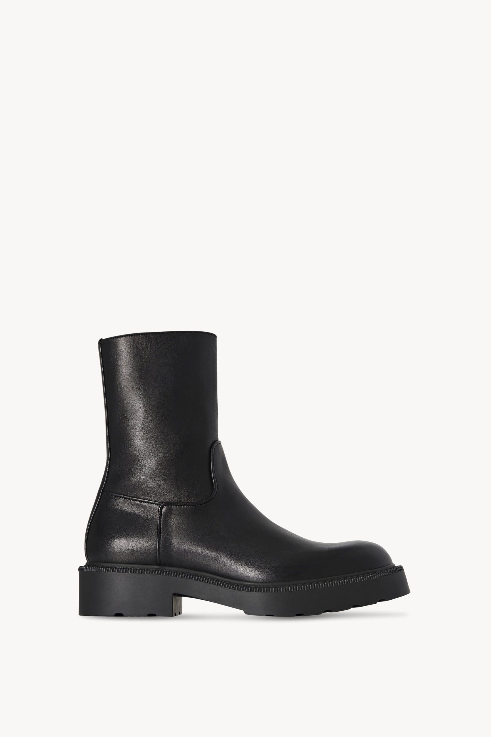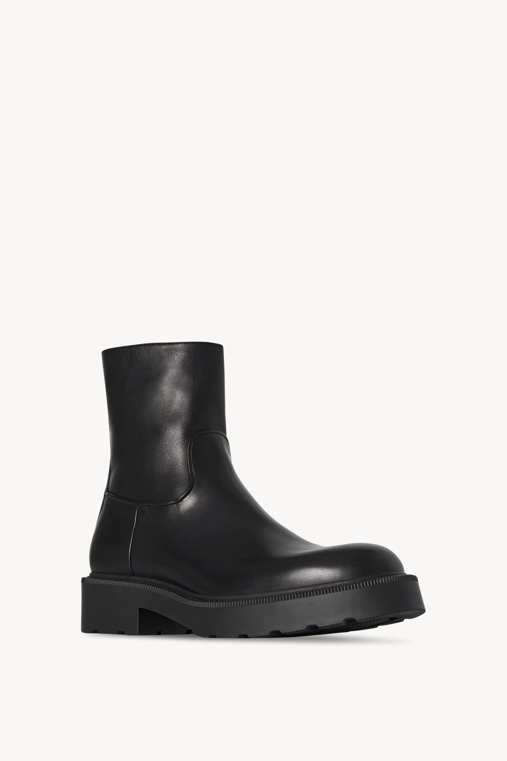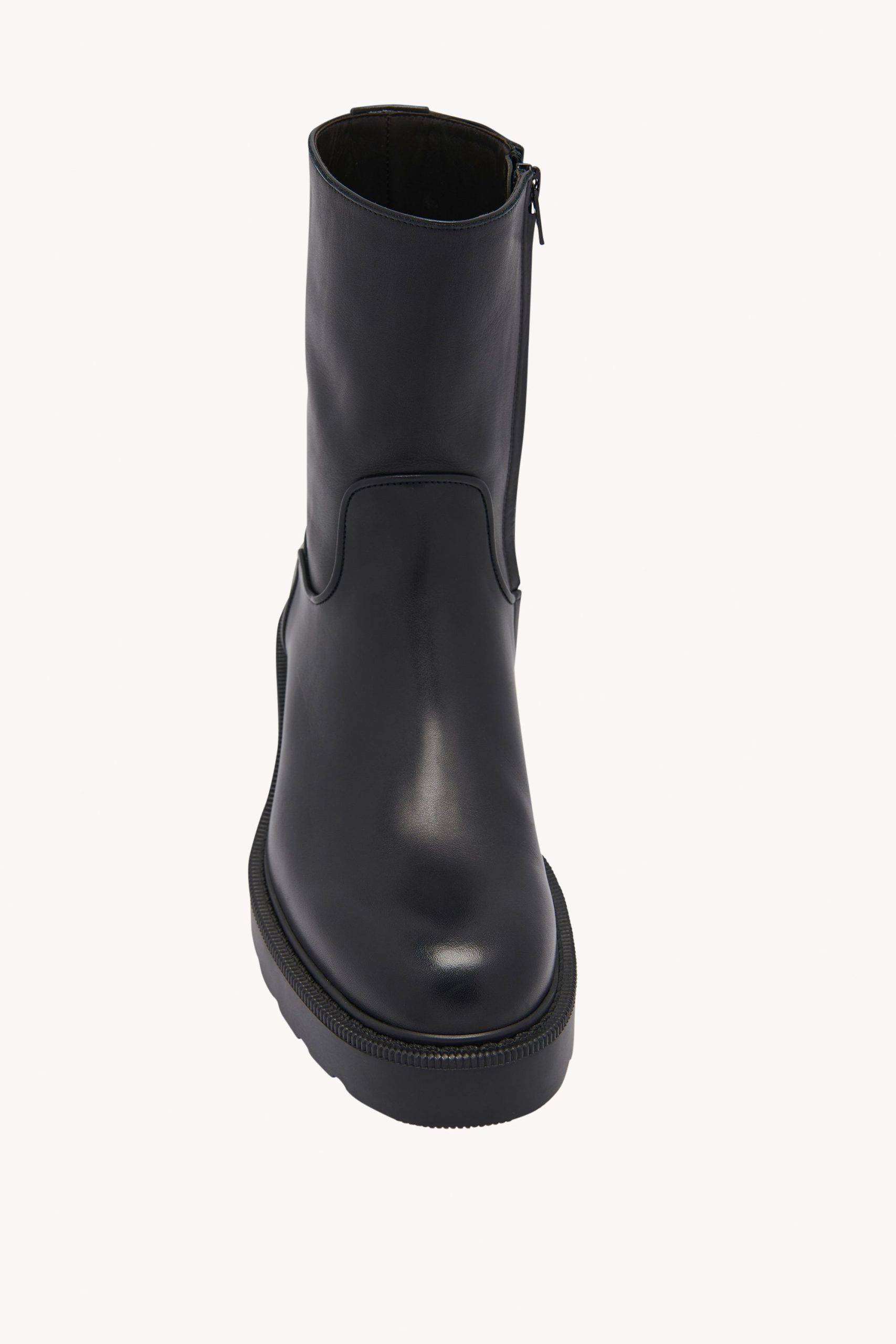 Ankle boot in silky polished calfskin leather with round toe. thick heeled sole and interior zipper closure.