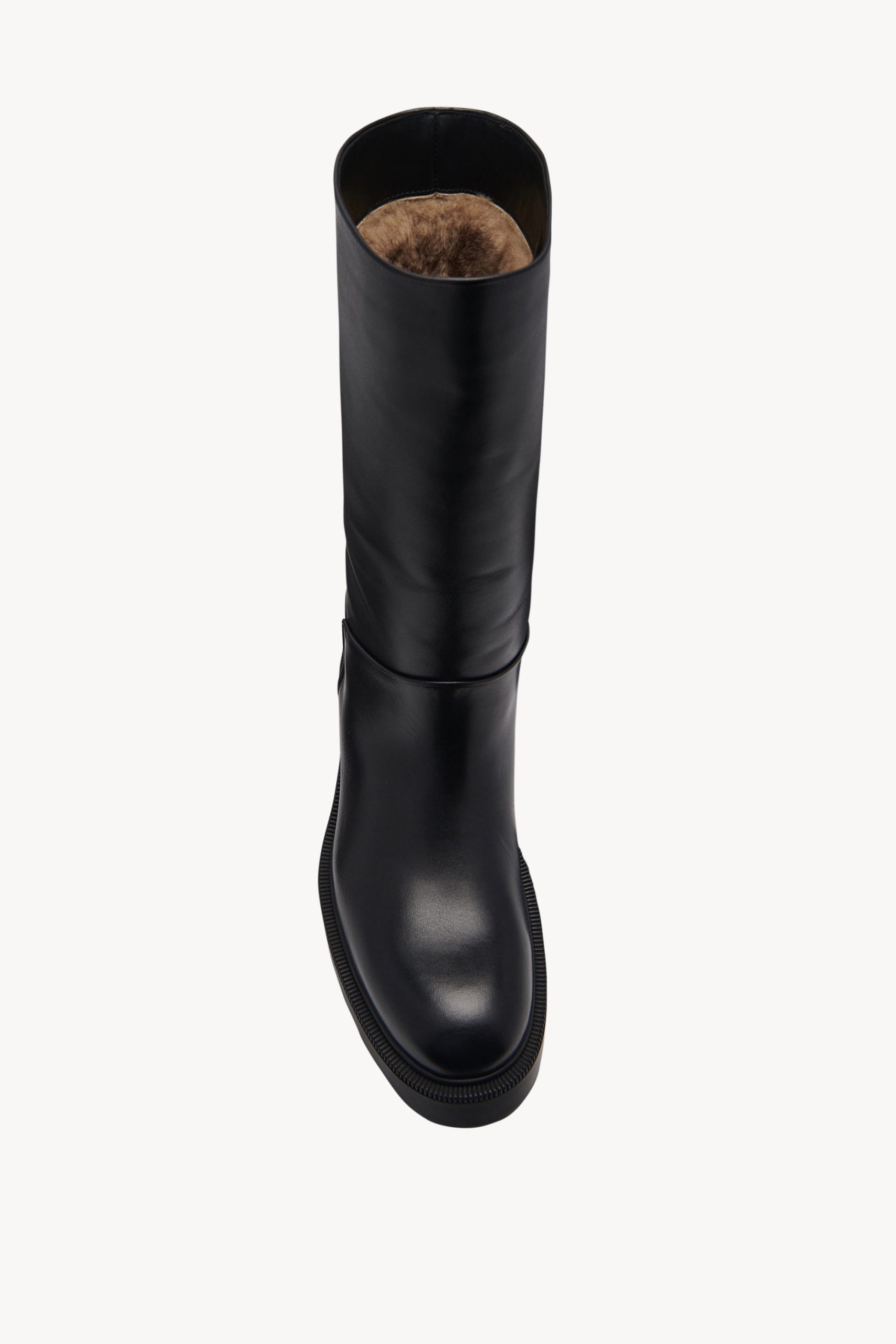 Pull-on boot in silky polished calfskin leather with round toe. shearling lining and thick heeled sole.