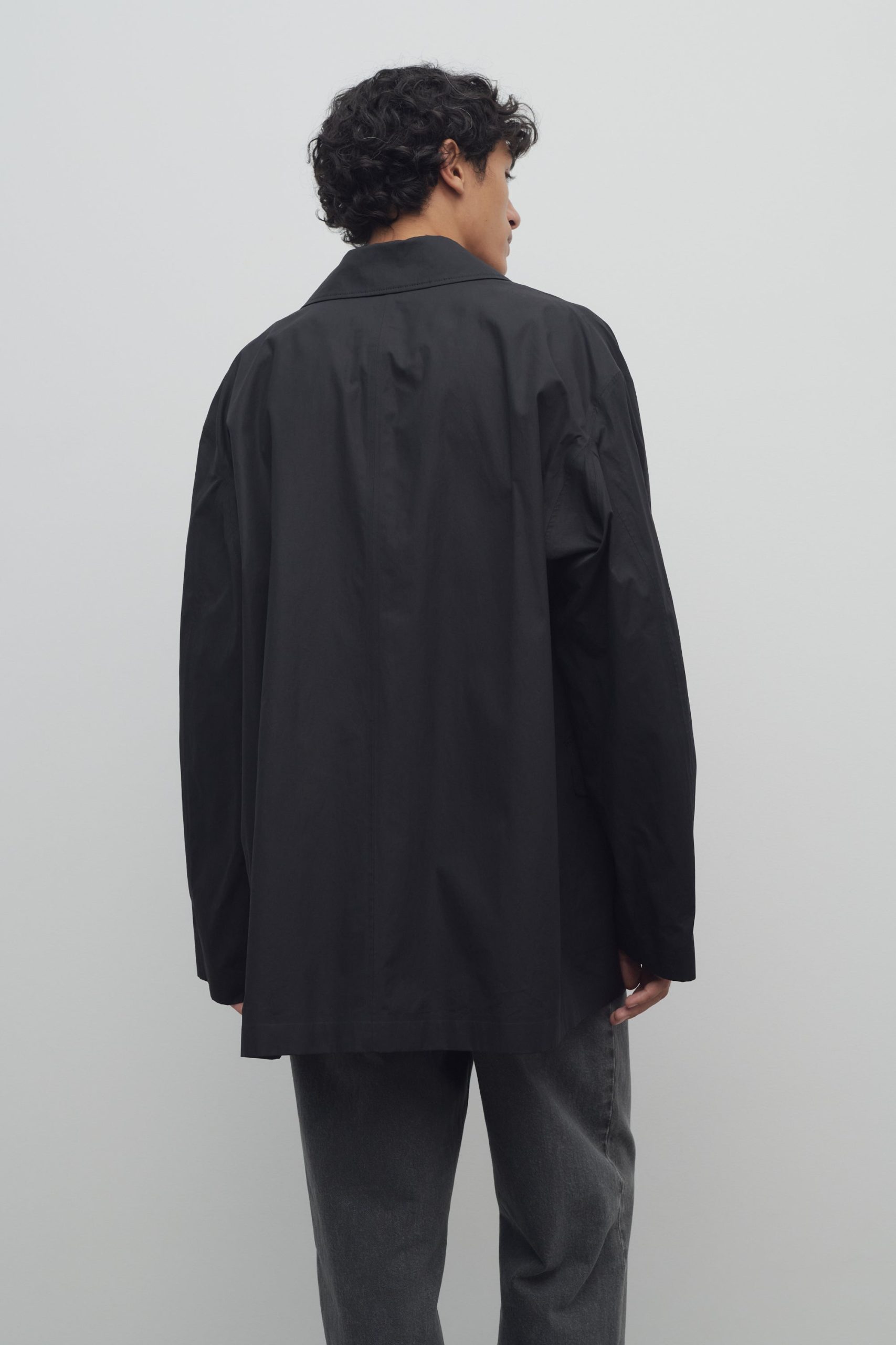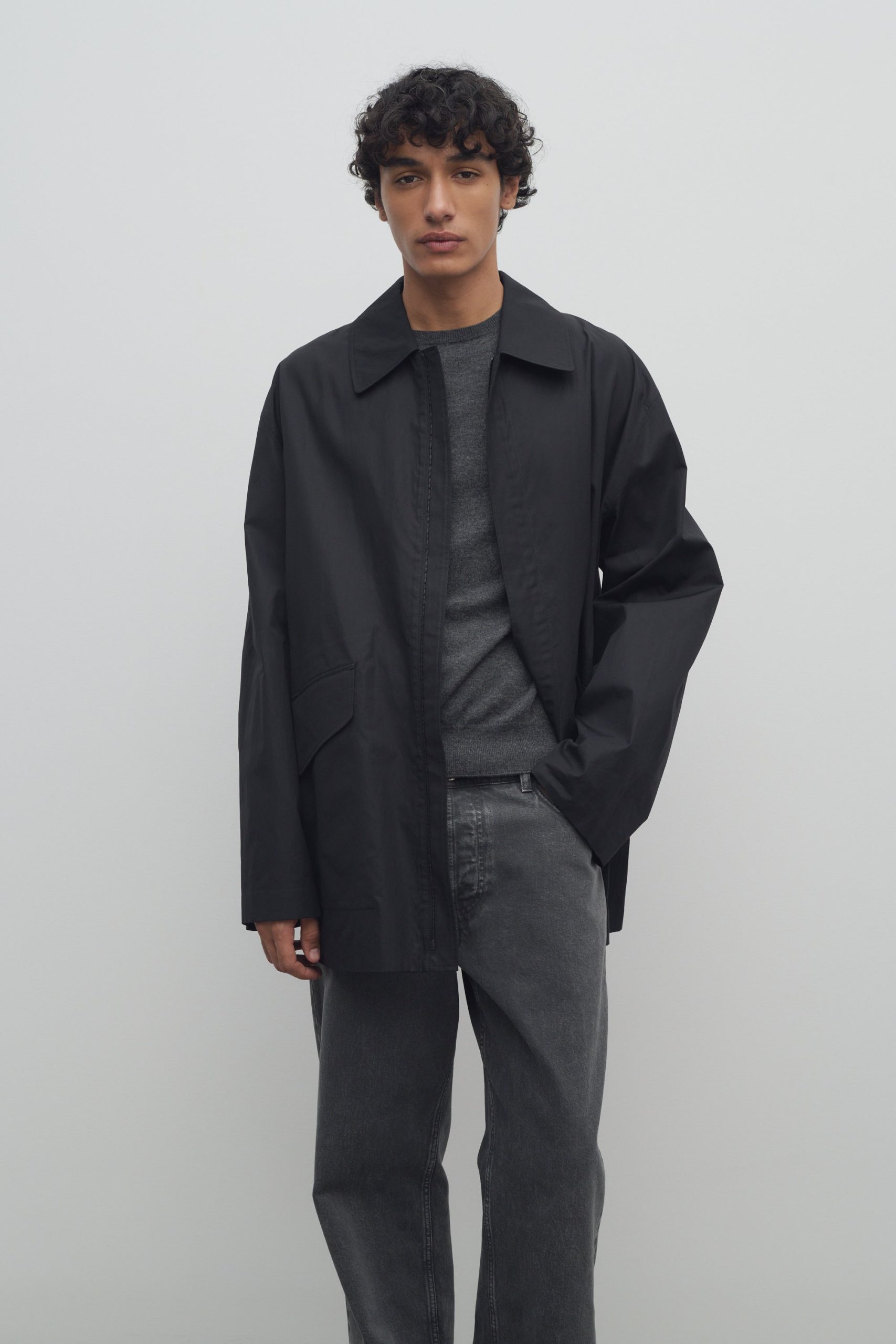 Boxy work jacket in Pima cotton poplin with slanted front flap pockets and concealed front placket with two-way zipper closure.