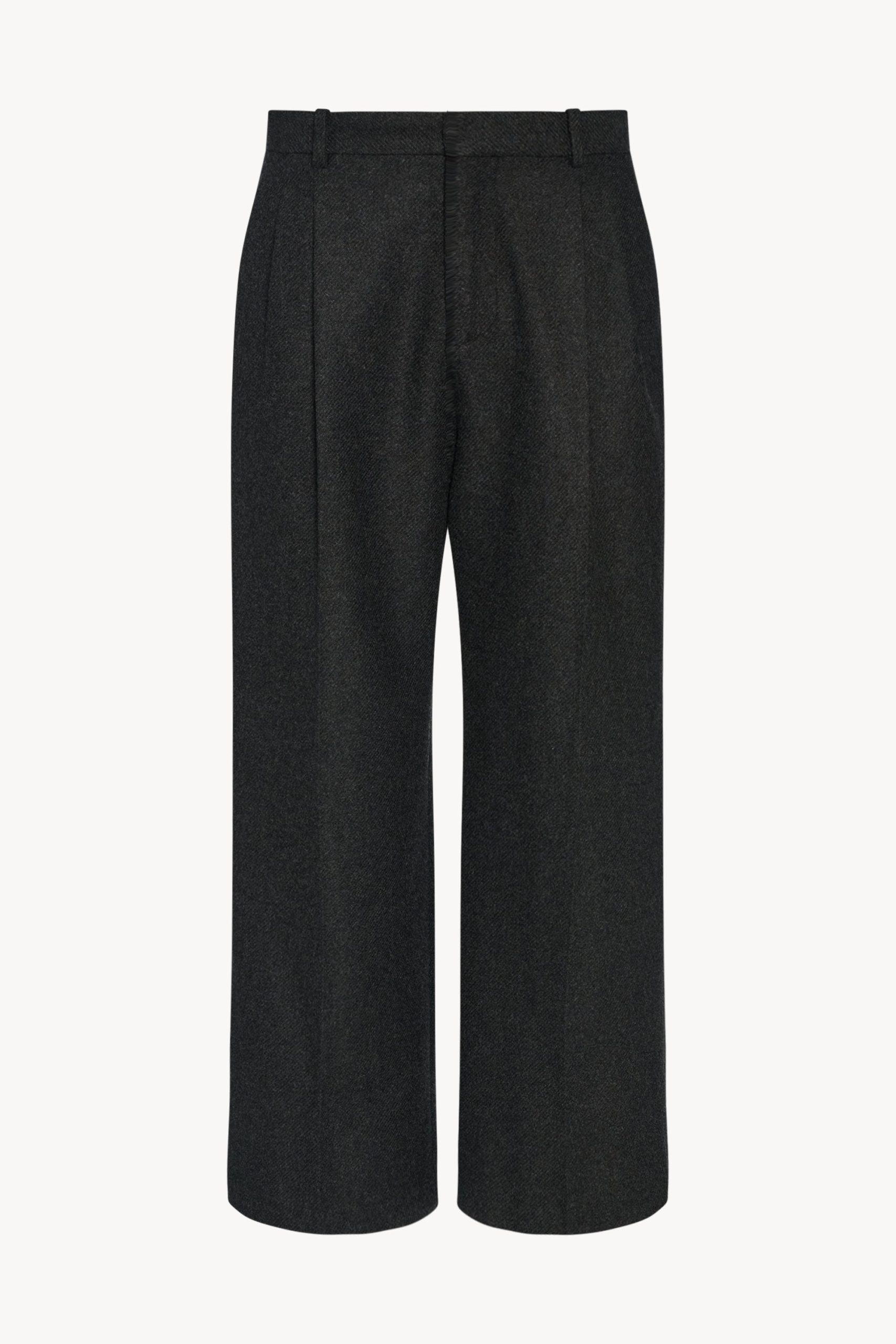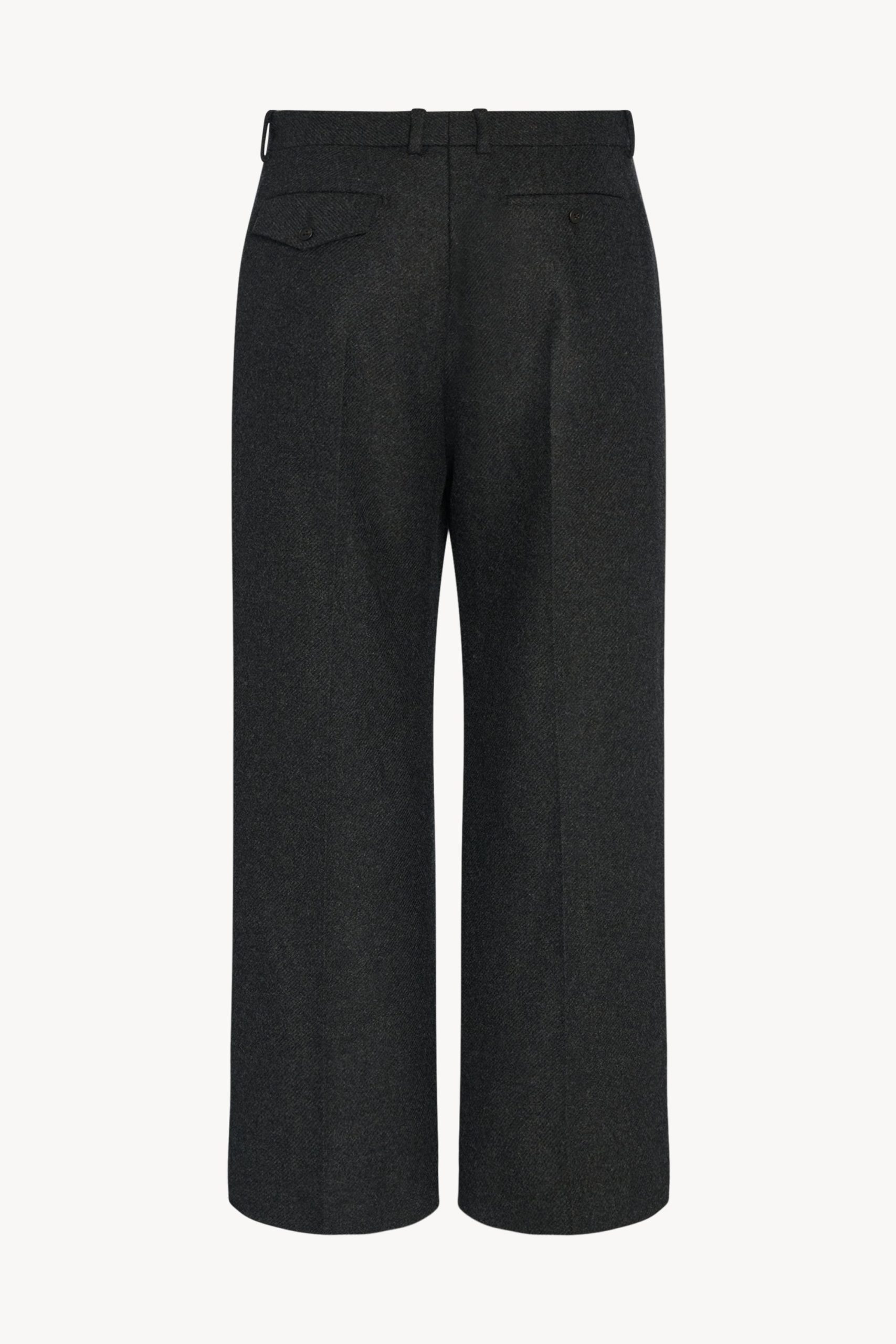 Mid-rise tailored trouser in lightweight virgin wool and cashmere twill with wide leg. pressed front and back creases. and slanted side pockets.