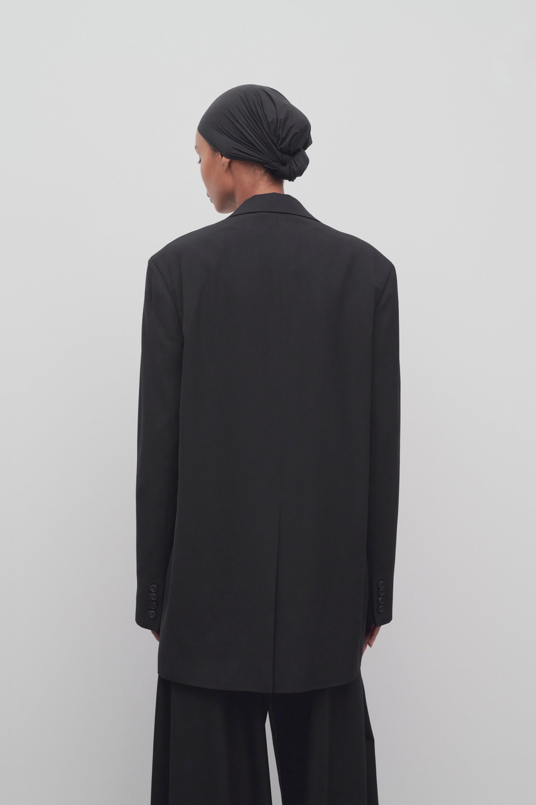 Oversized single-breasted tailored jacket in lightweight viscose and virgin wool with hand-pick stitched notch lapel. front flap pockets and back vent.