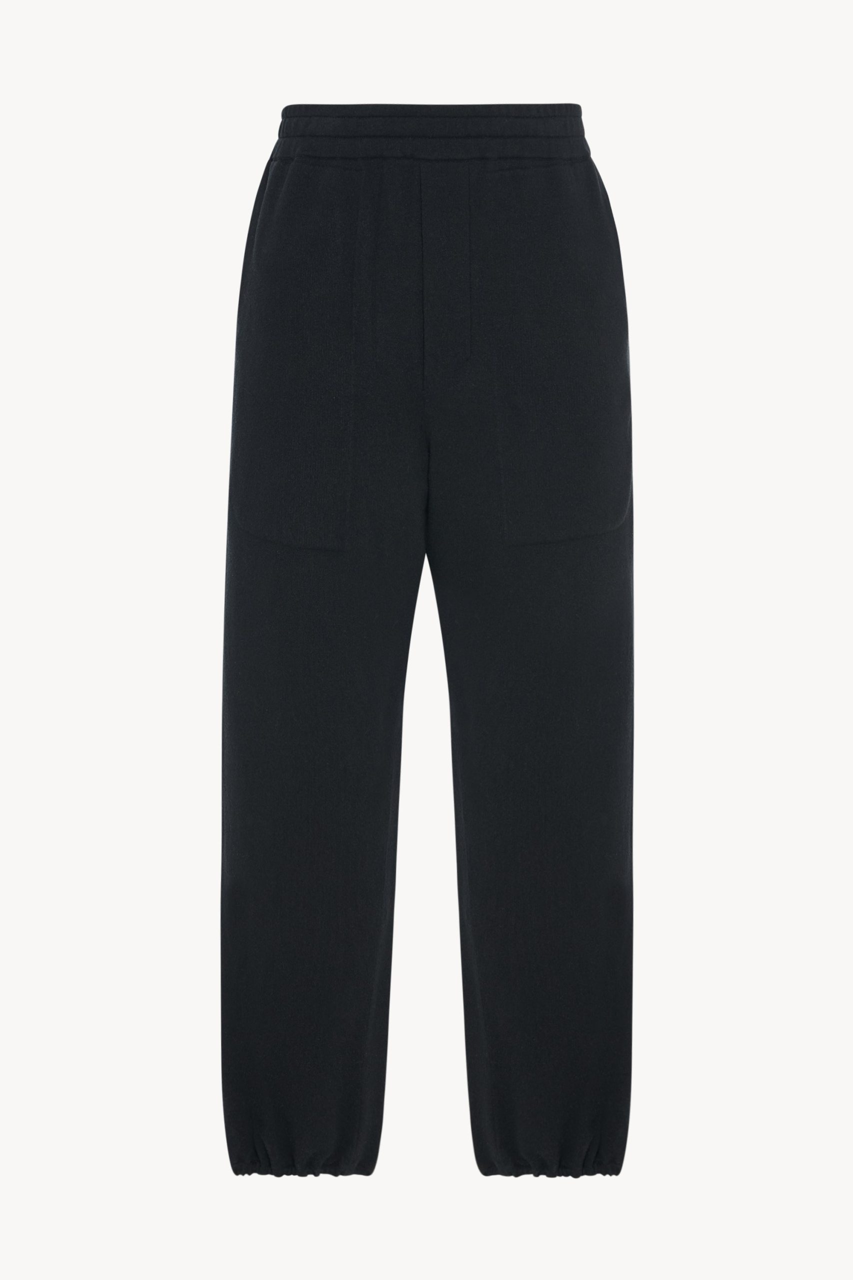 Mid-rise jogger pant in stonewashed silk jersey with straight leg. side seam pockets. and gathered elastic cuffs and waistband.