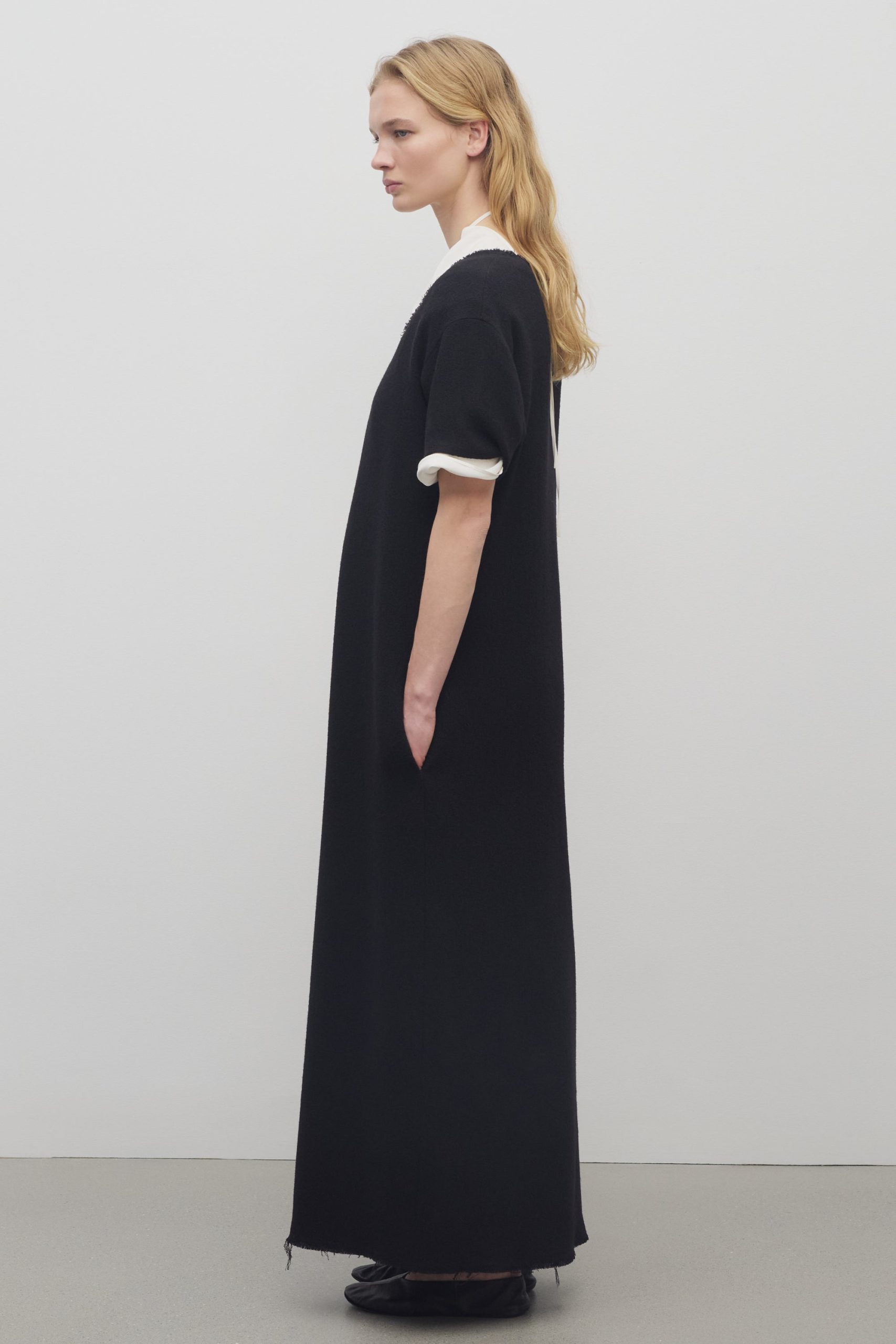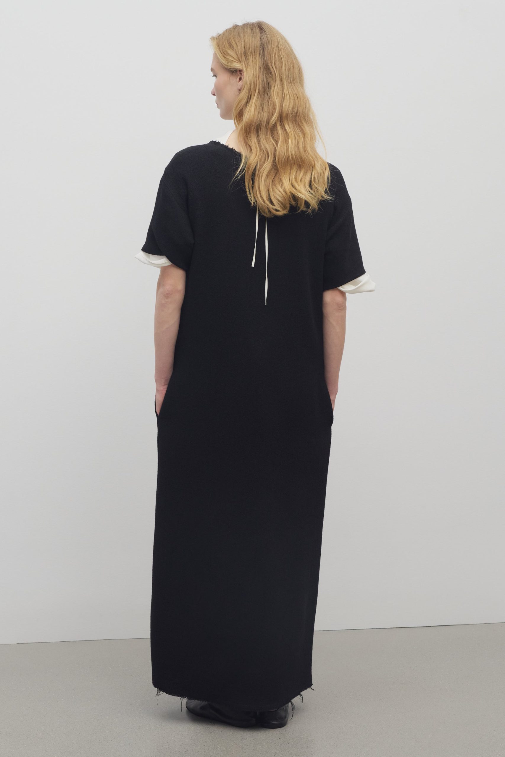 Ankle-length shift dress in textured matte wool crepe with raw finish and relaxed fit.