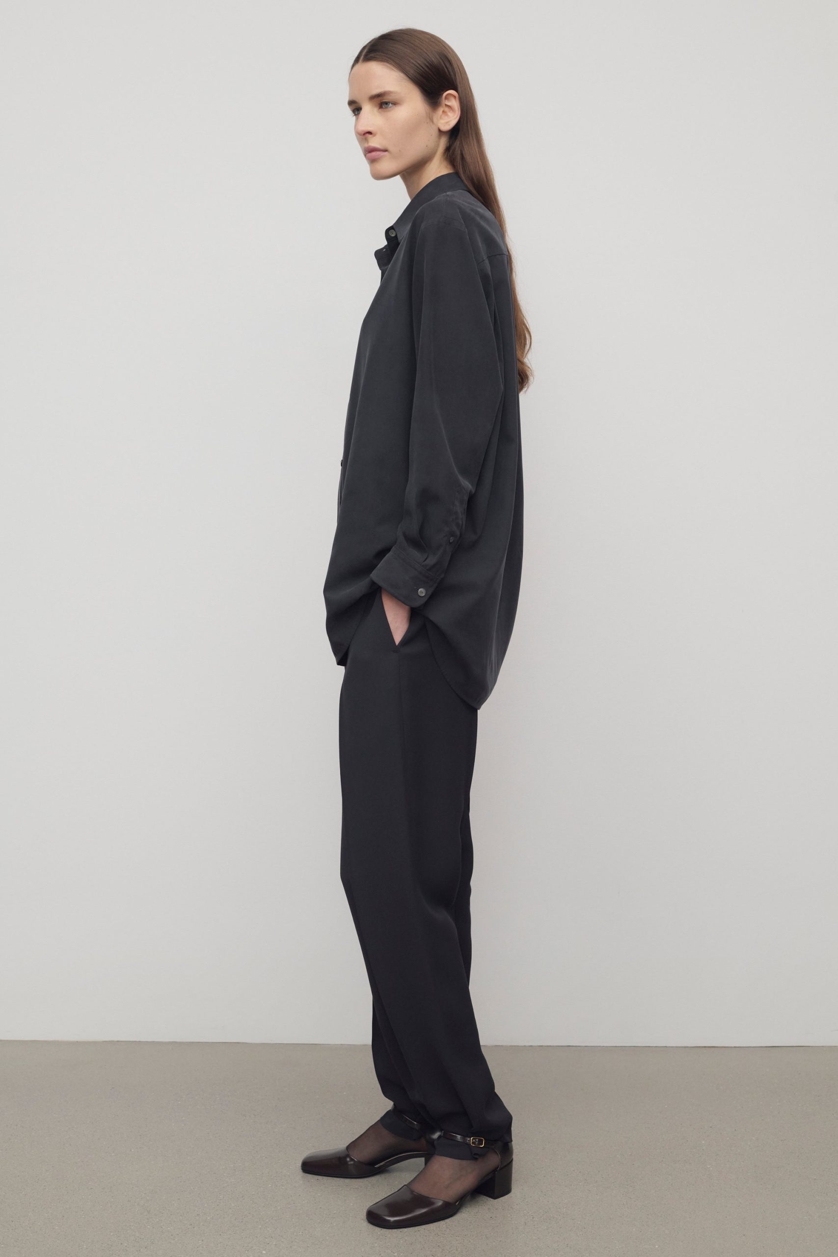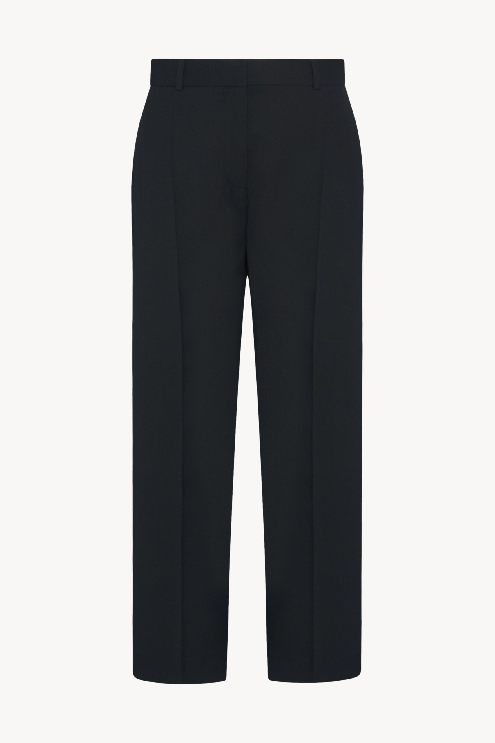 Mid-rise tailored trouser in lightweight silk twill with slightly tapered leg. pressed front and back creases. and side seam pockets.