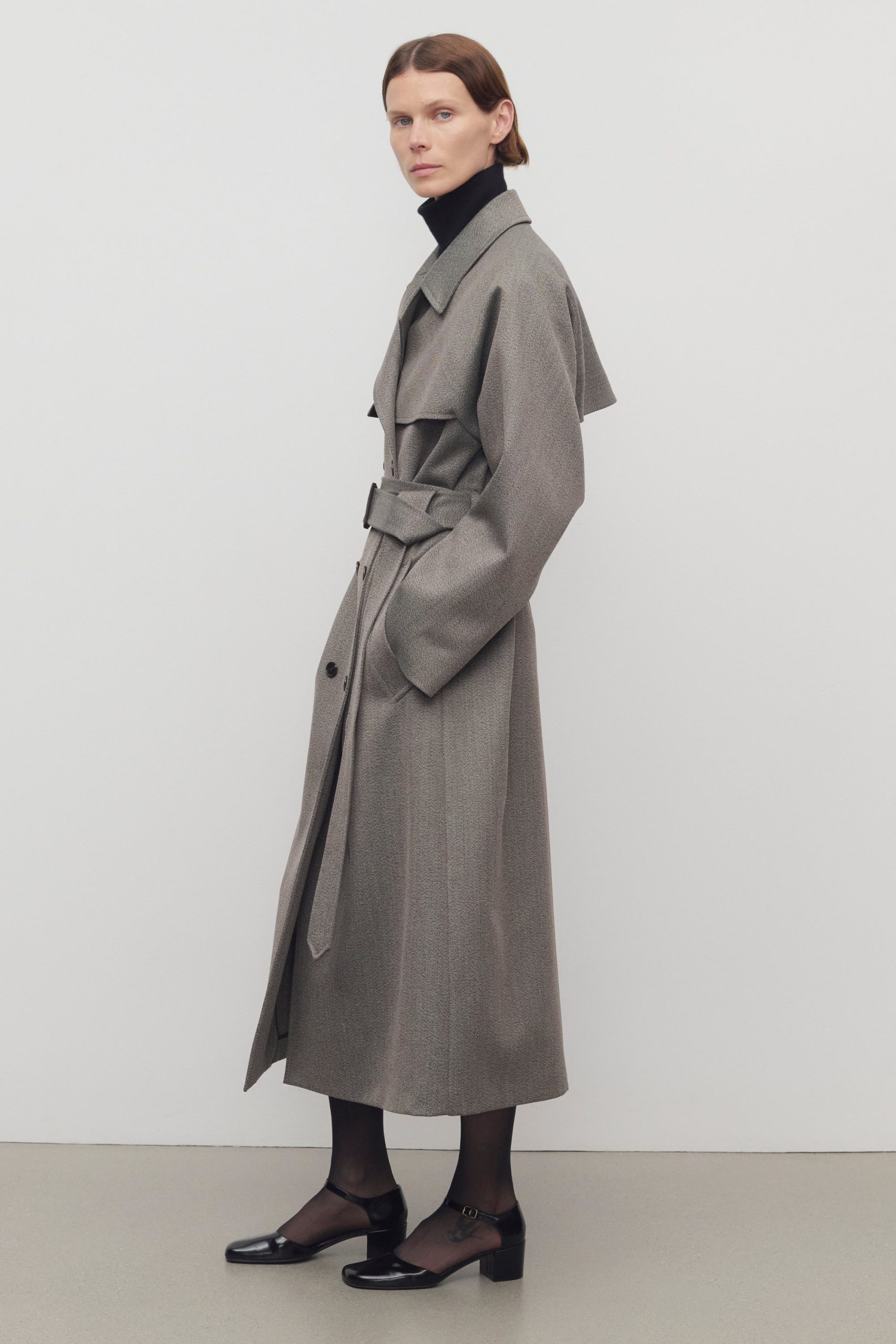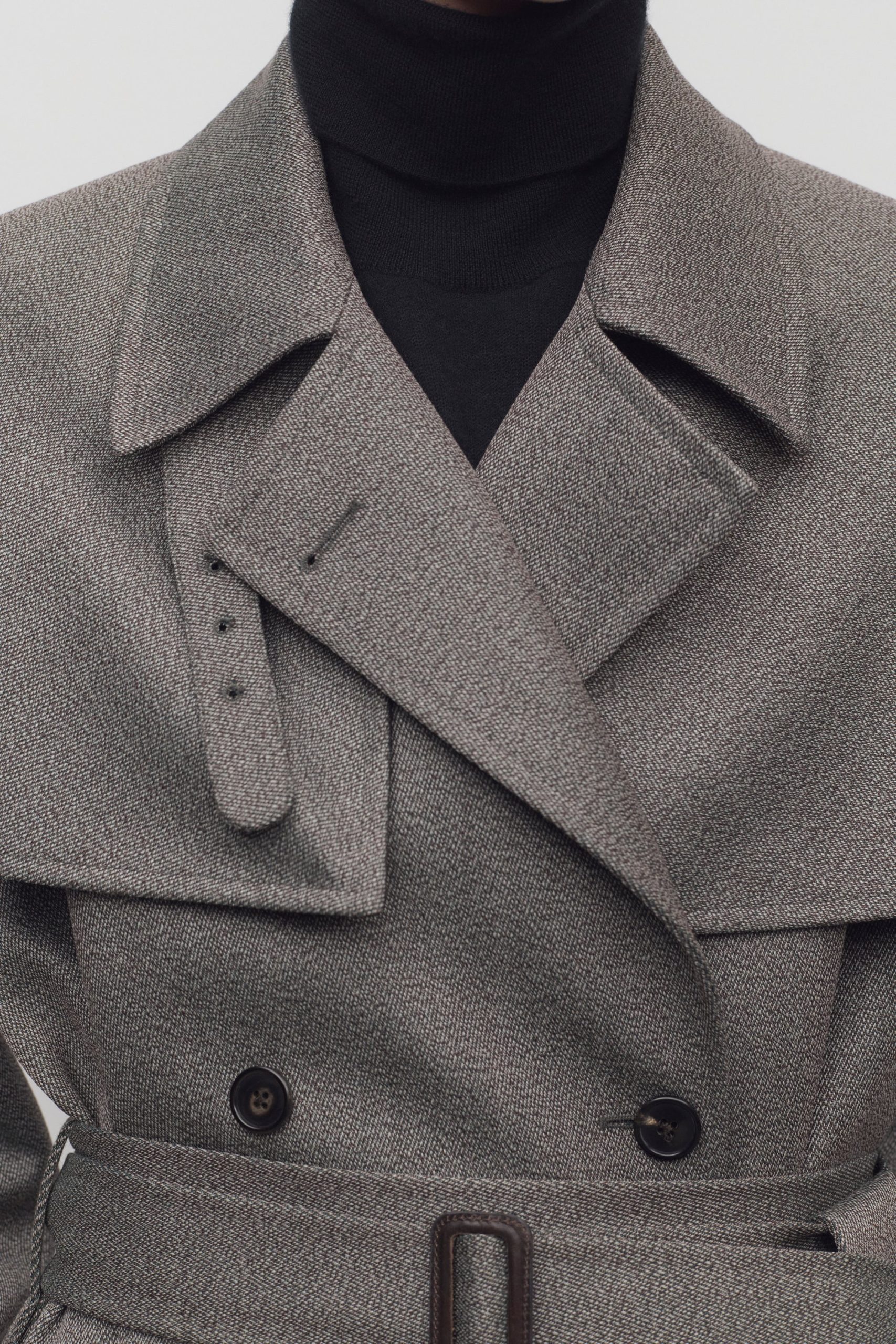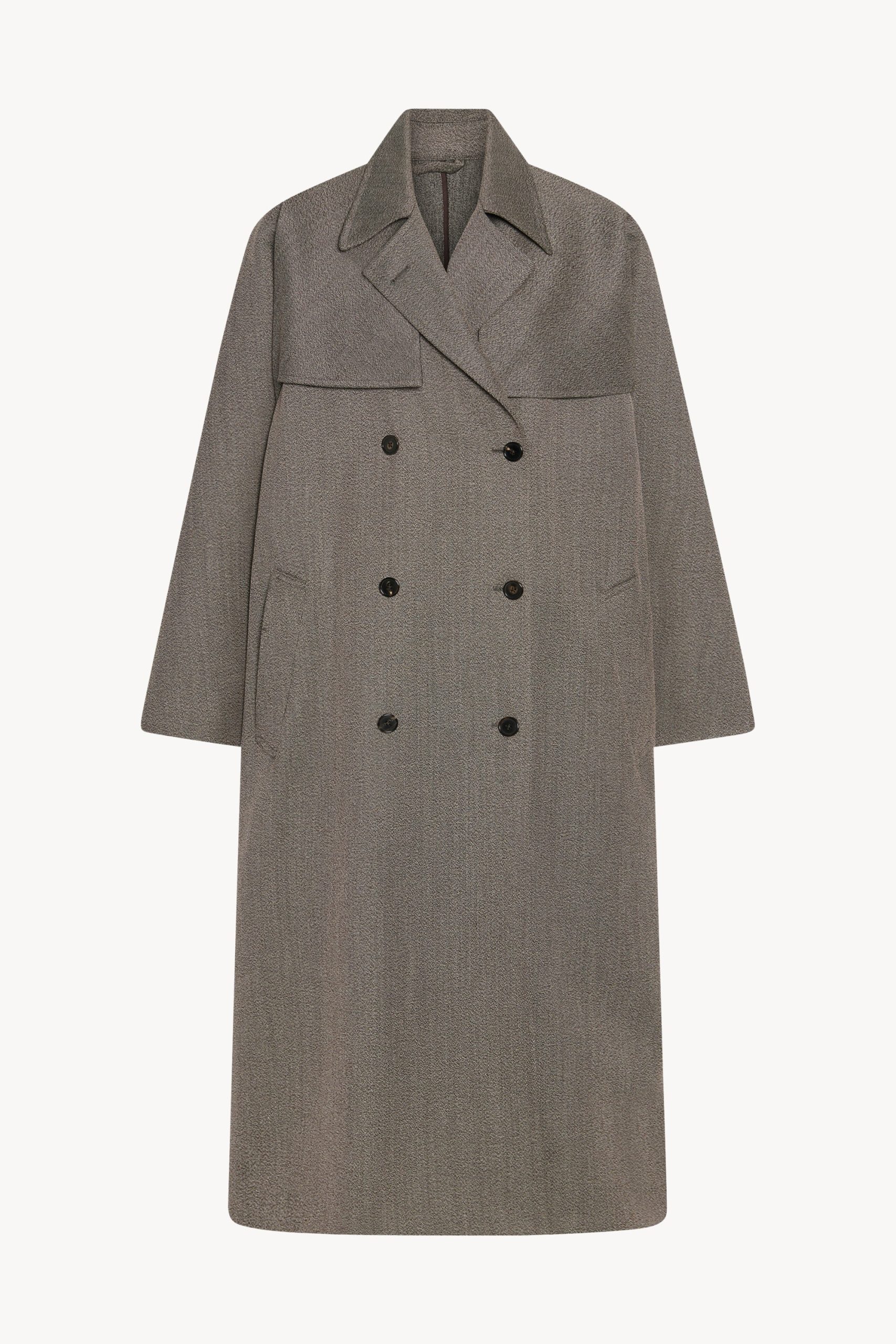 Oversized double-breasted trench coat in sleek virgin wool gabardine with slant welt pockets. horn button closure. and removable belt with buckle.