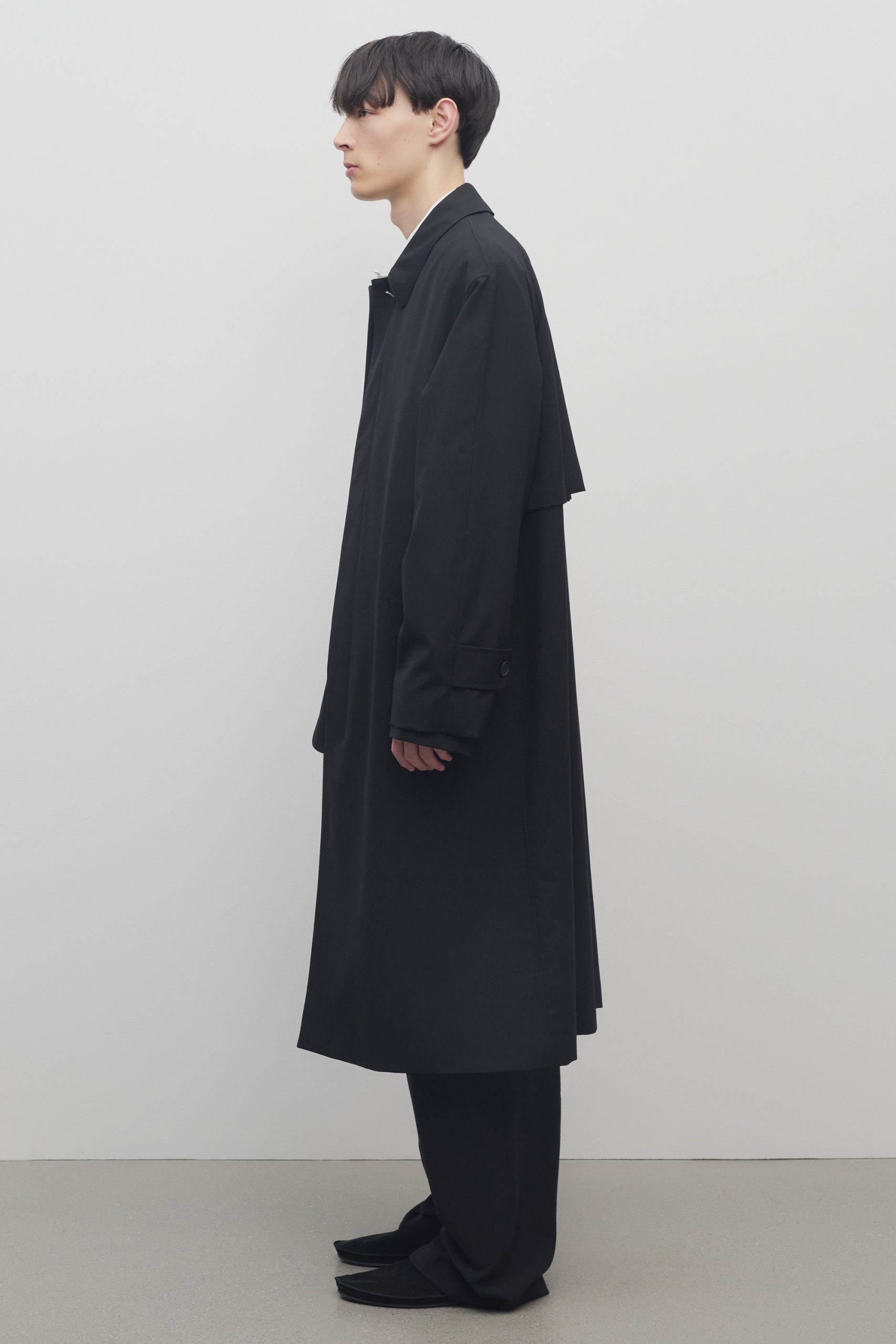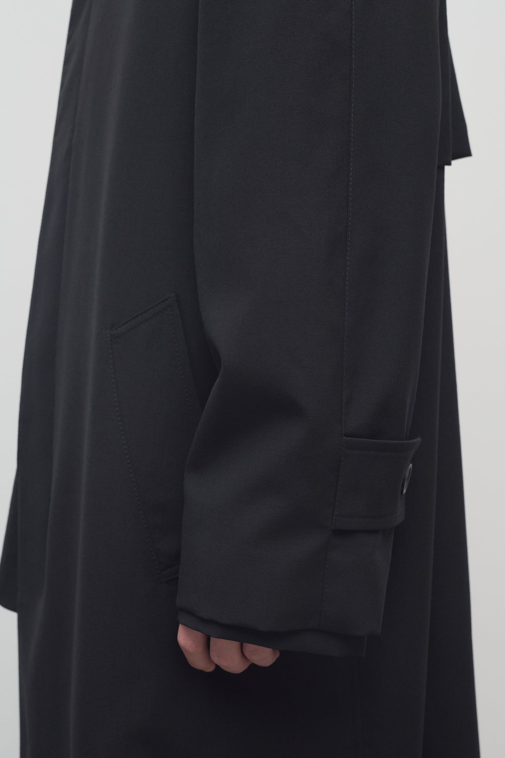 Single-breasted trench coat in crisp tropical wool with back storm flap. front welt pockets. and concealed front placket with horn button closure.