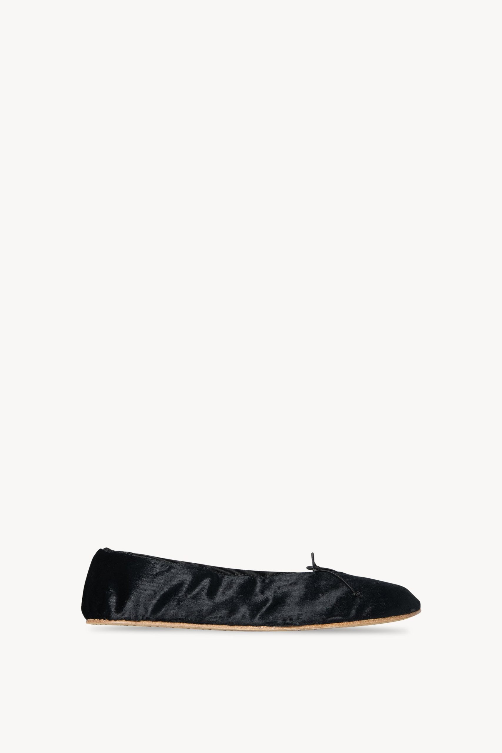 Classic ballet flat in sleek velvet with grosgrain piping. adjustable elastic tie. and flexible leather sole.