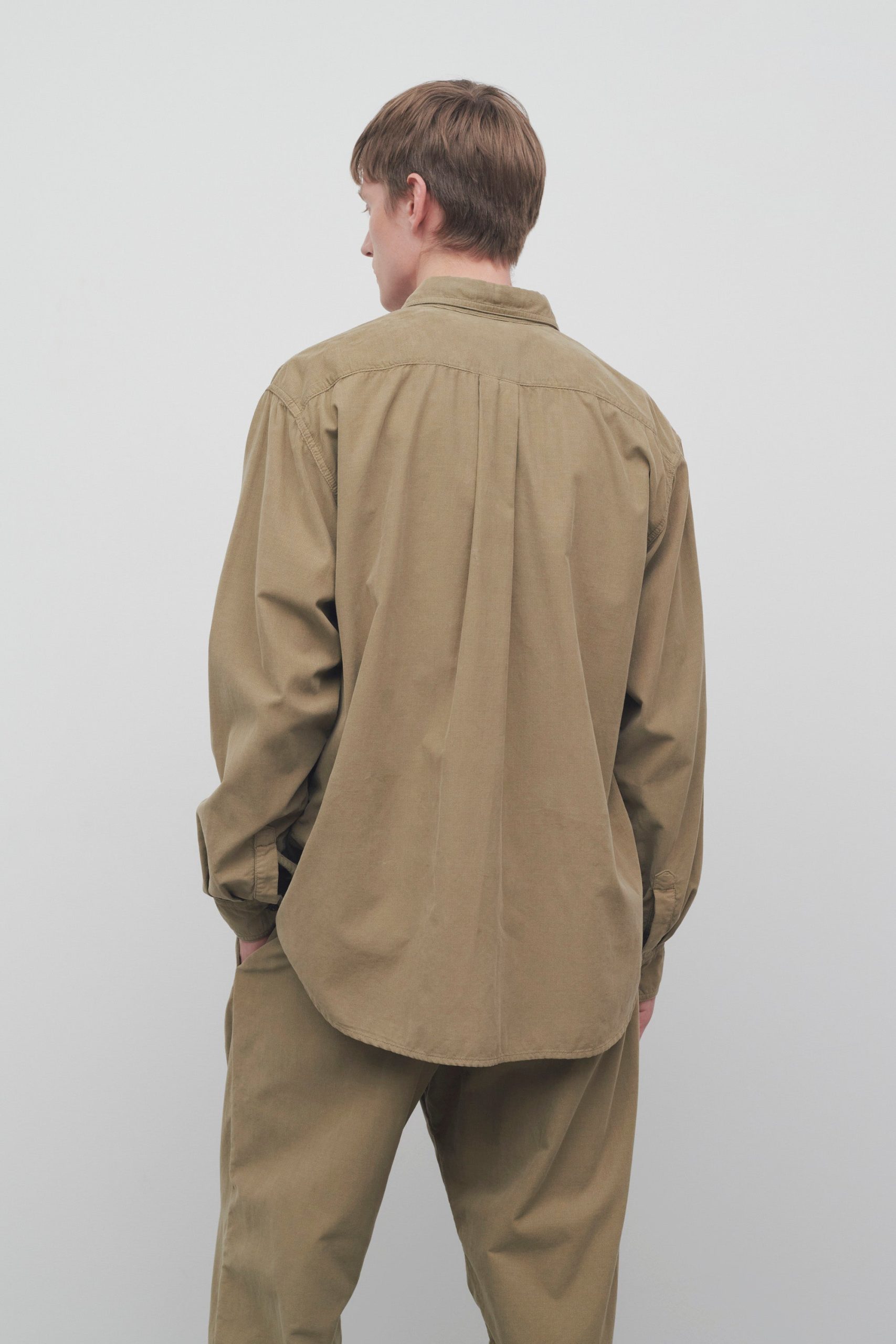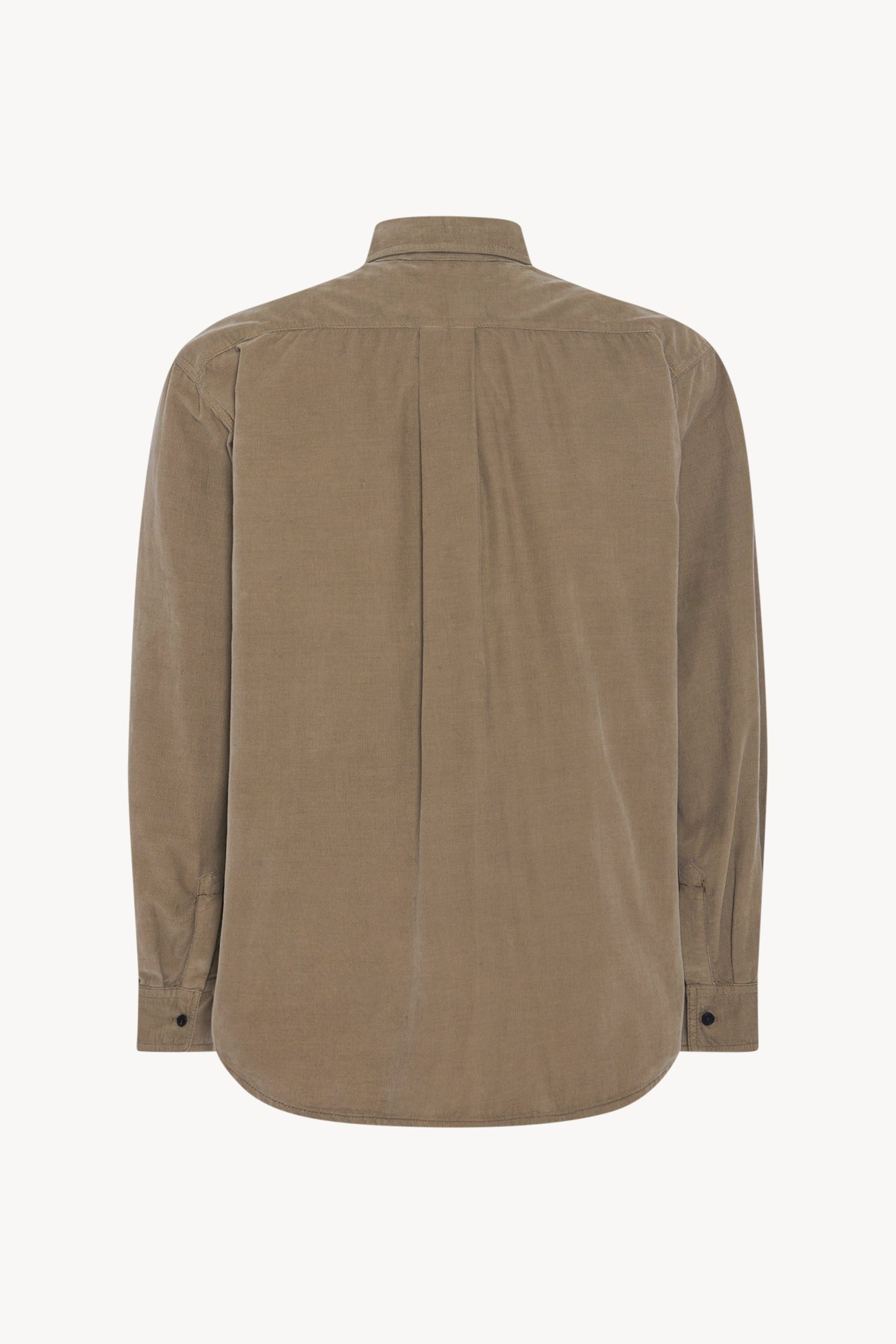 Tailored button-down shirt in light cotton corduroy with exposed placket. horn button closure. and curved hem.