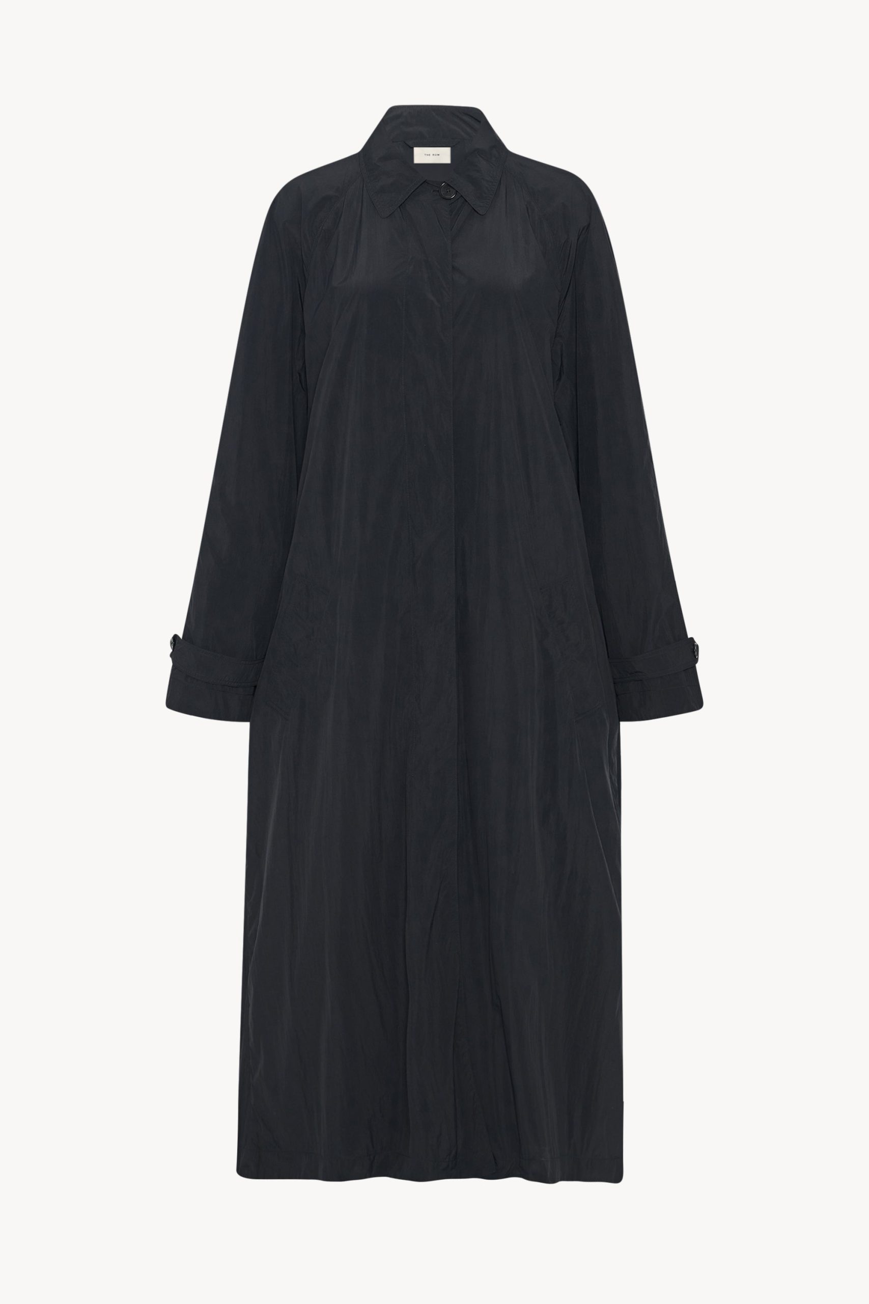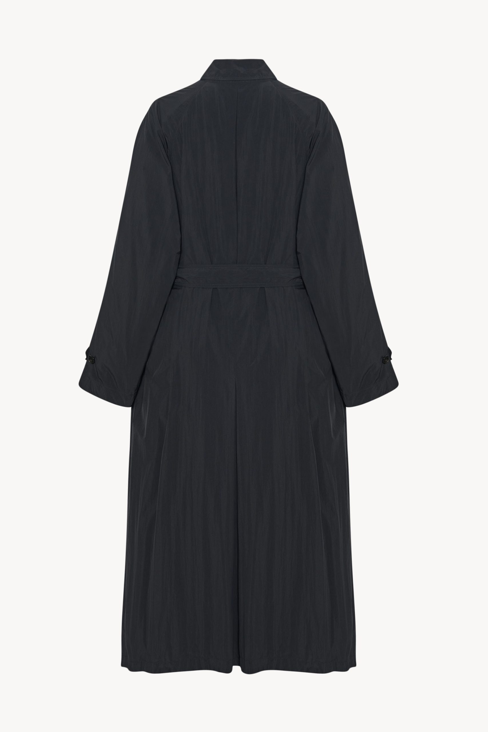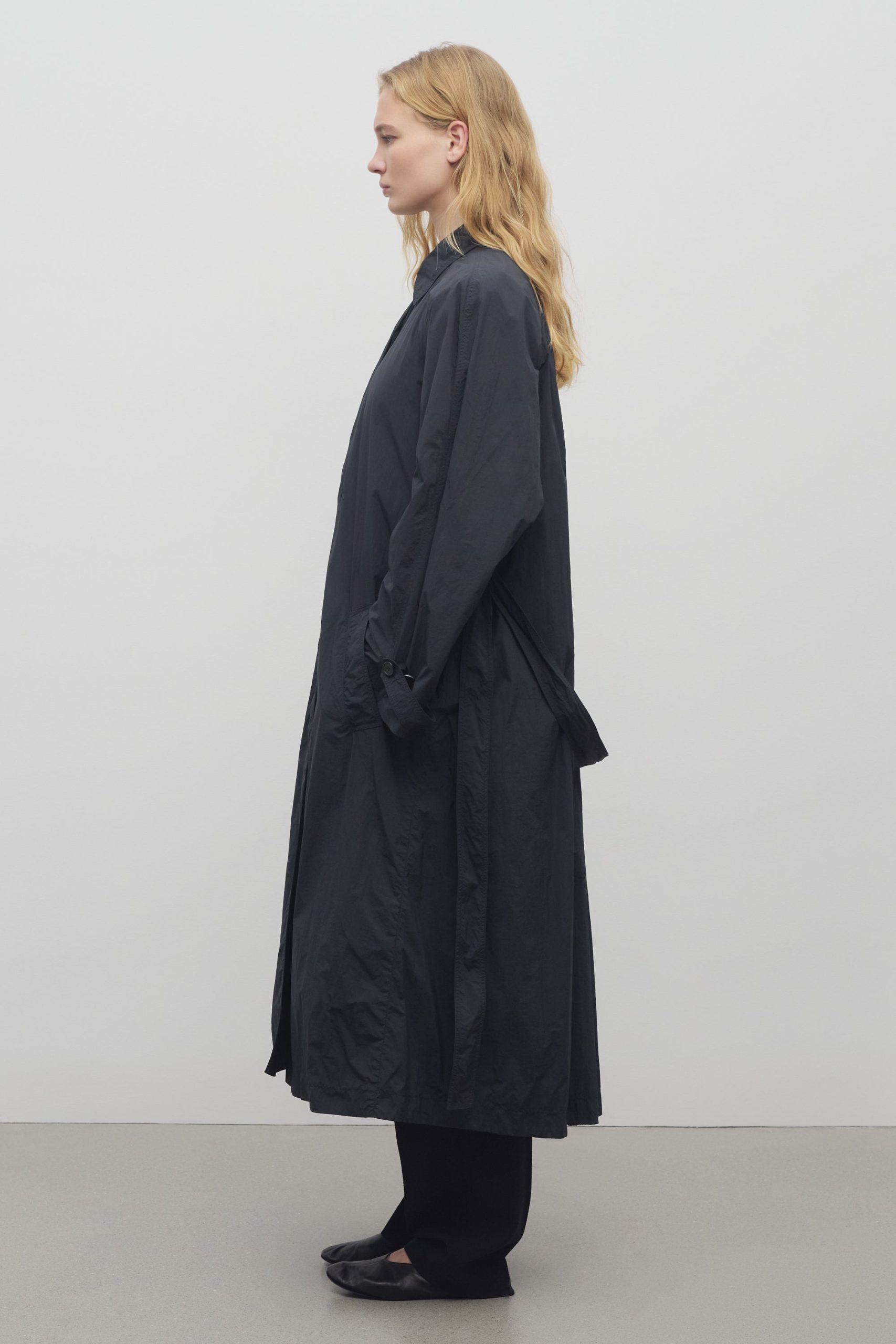 Ankle-length trench coat in water-repellent nylon with self belt. front welt pockets. and concealed front placket with horn button closure.