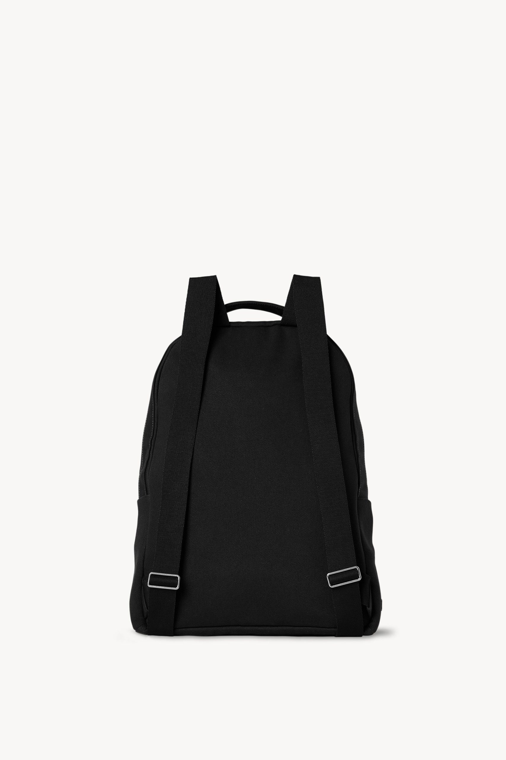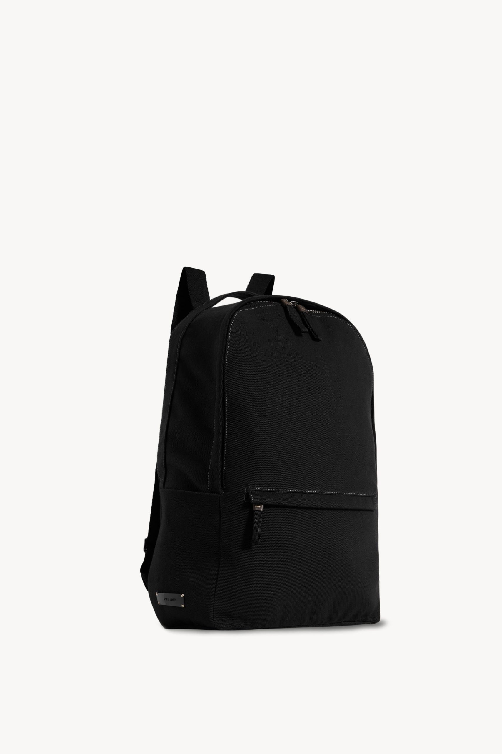 Minimal backpack in textured cotton twill with adjustable woven straps. contrast topstitching. and dual-zip closure.