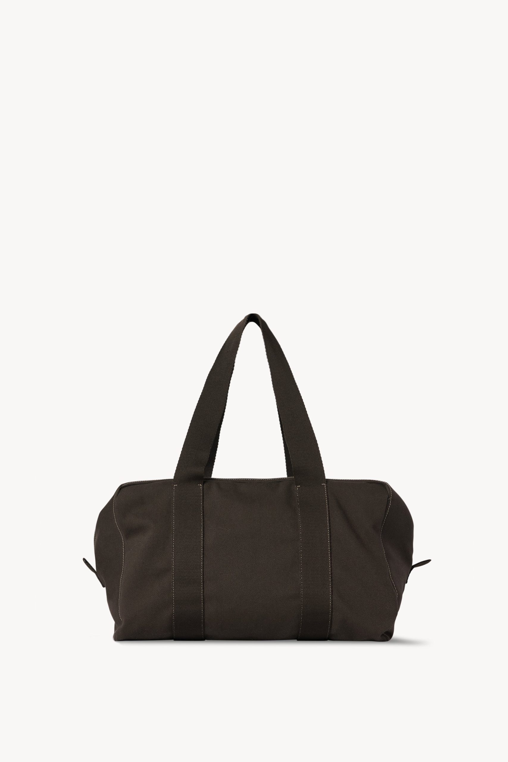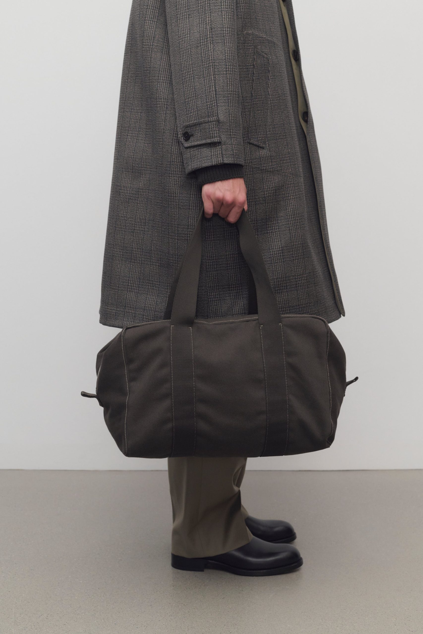 Spacious duffle bag in textured cotton twill with woven top handles. contrast topstitching. and zipper closure.