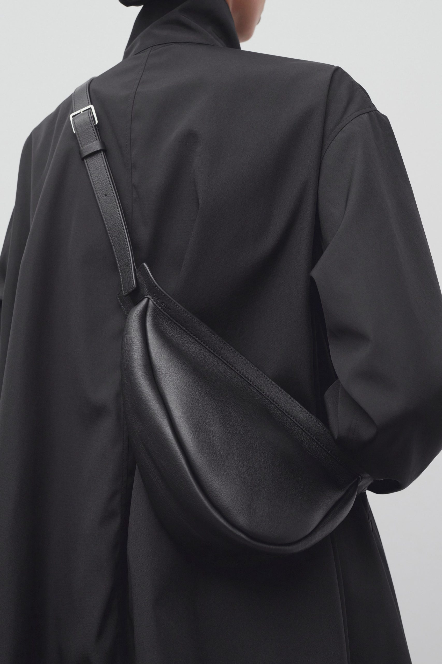 Curved crossbody bag in smooth calfskin leather with adjustable strap and zipper closure.