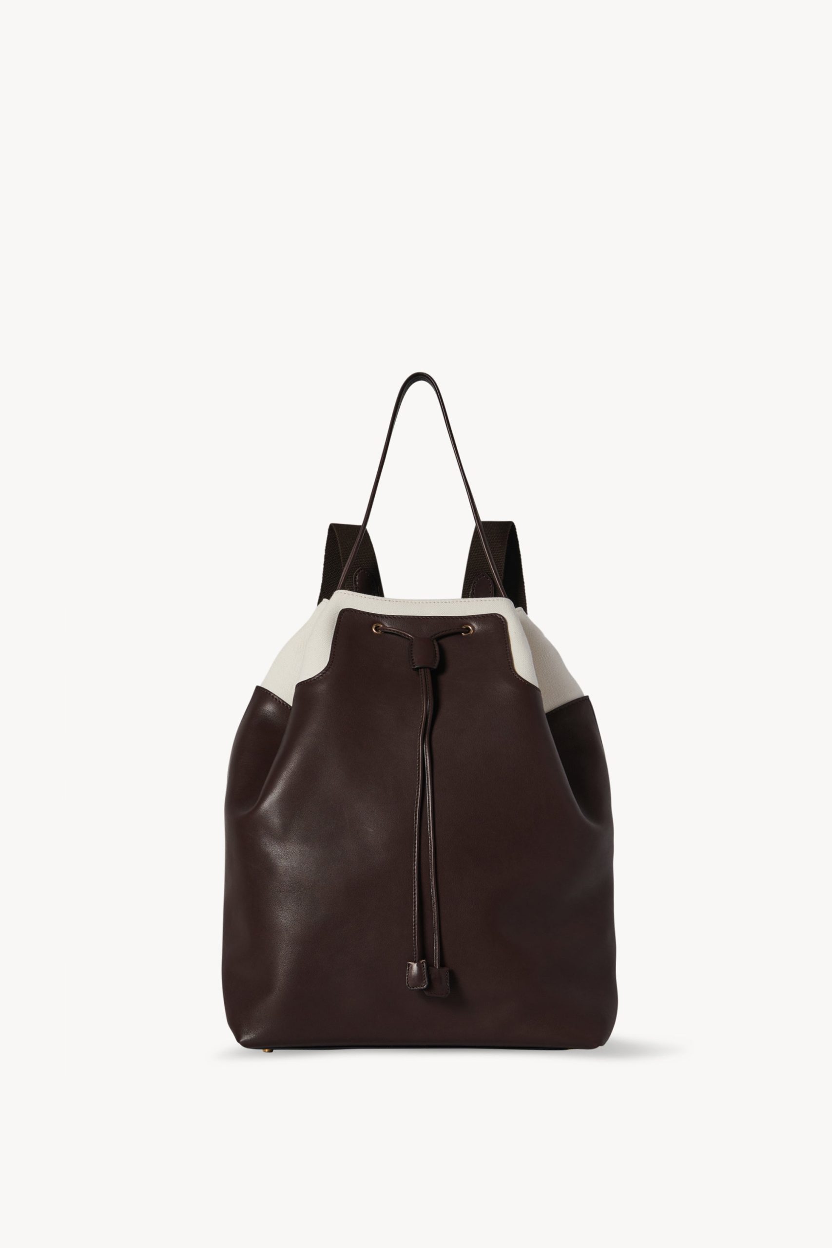 Softly structured backpack in smooth saddle leather with contrast canvas top panel. adjustable shoulder straps. and drawstring closure.