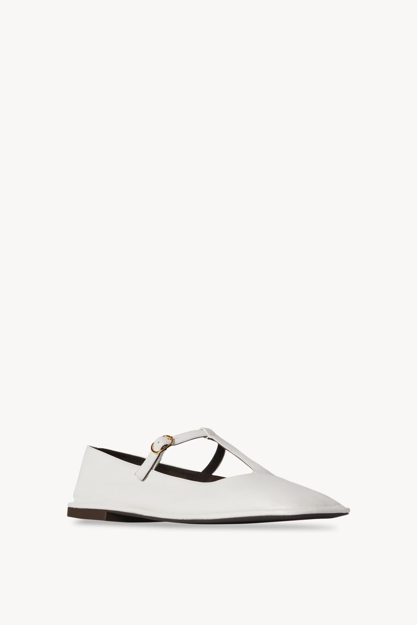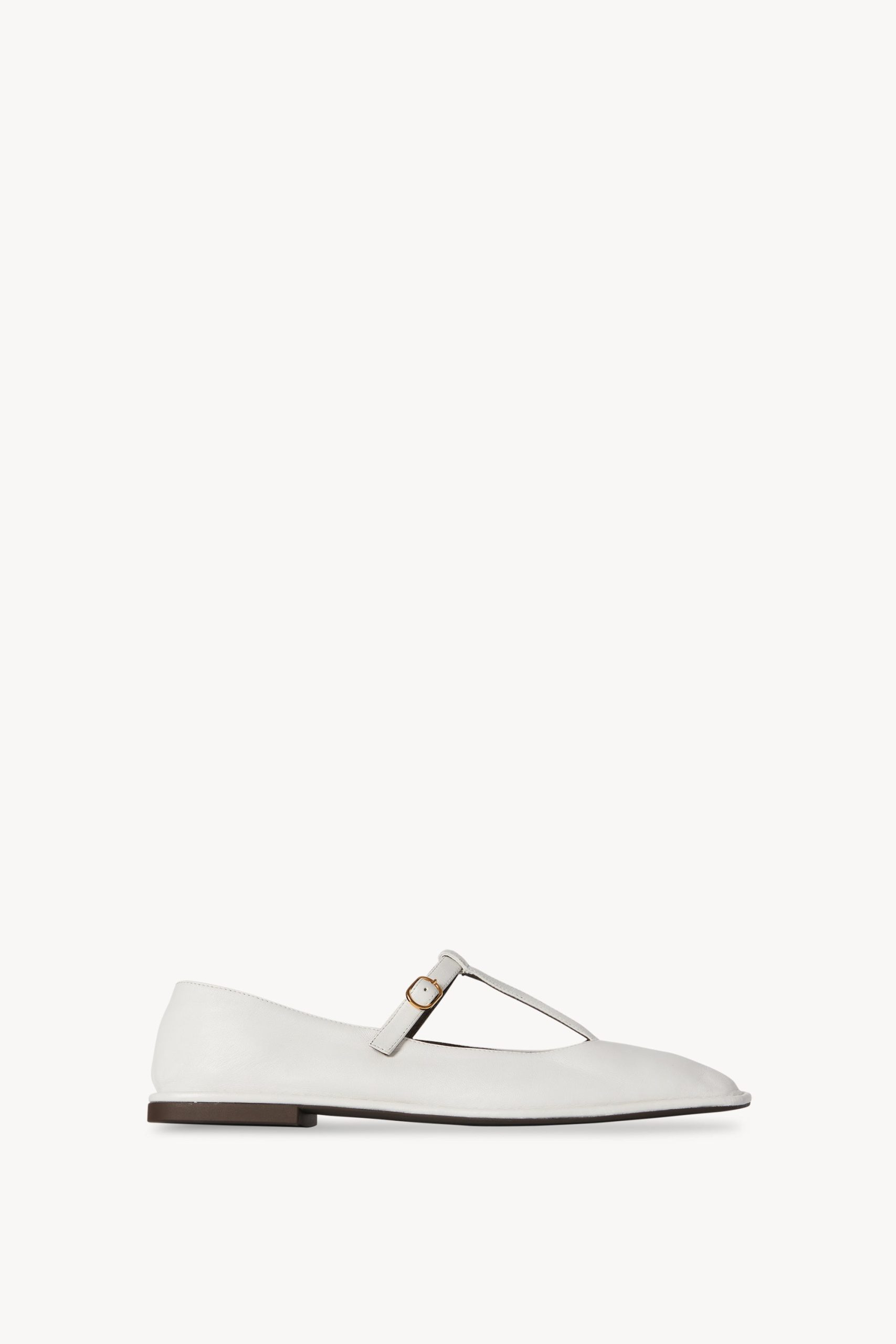 Flat t-strap shoe in soft lightweight leather with squared toe. rubber sole. and adjustable buckle closure.