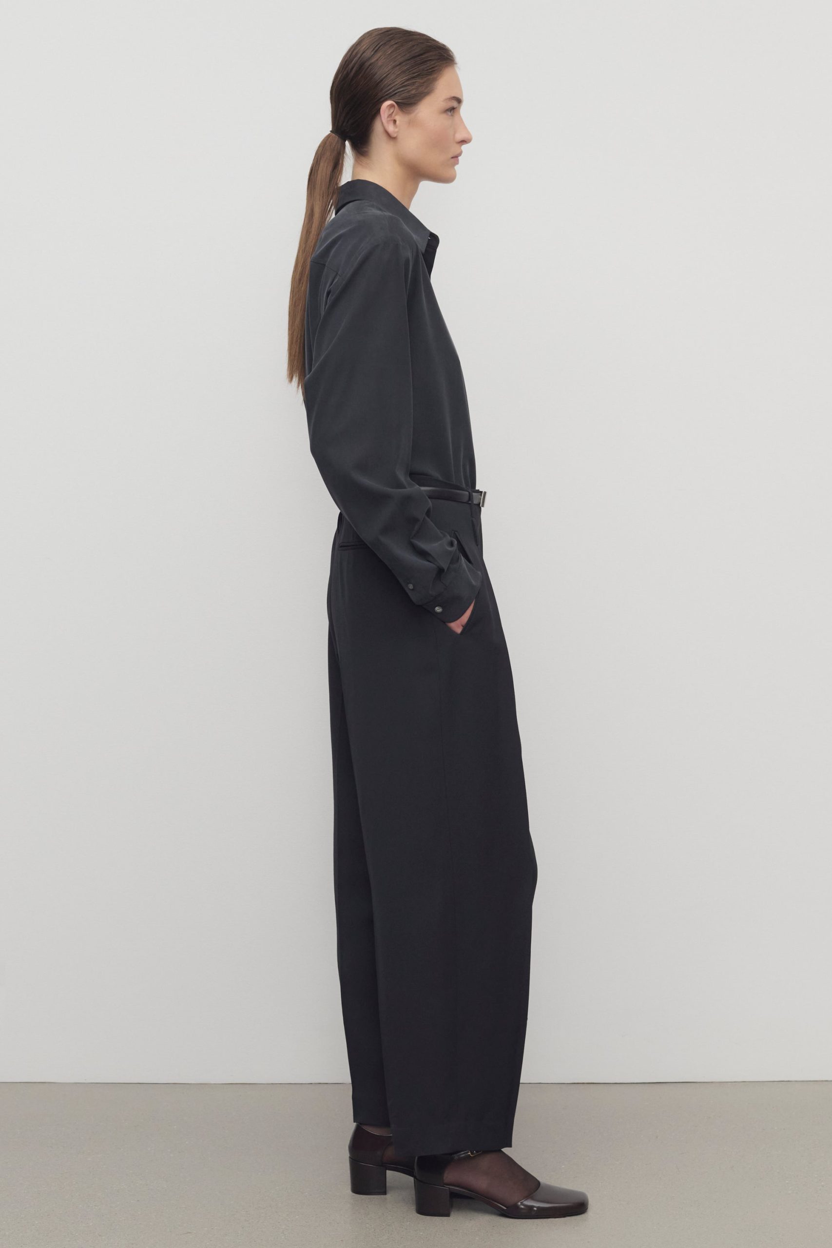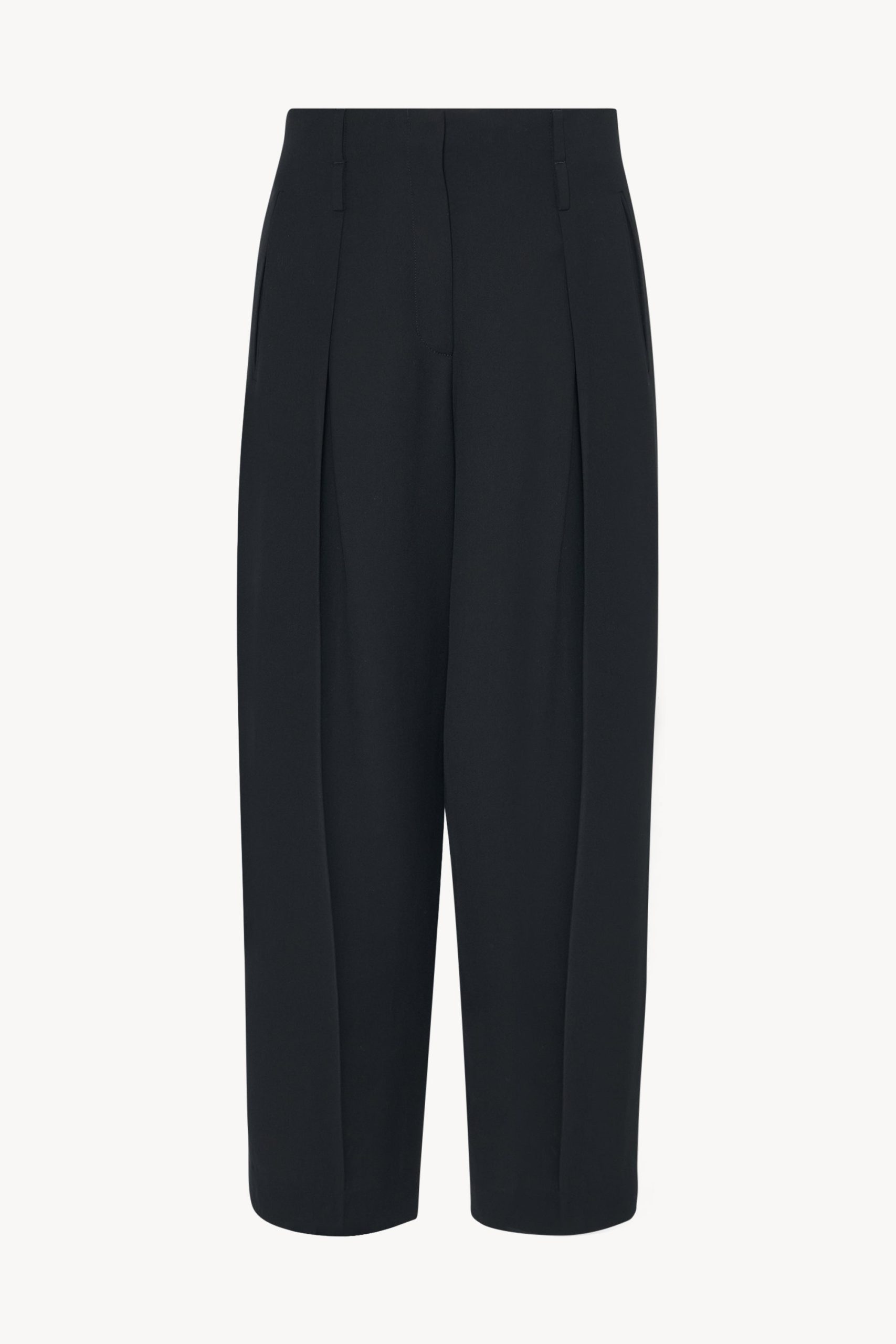 High-rise tailored trouser in lightweight silk twill with tapered hem. pressed front and back creases. and side welt pockets.