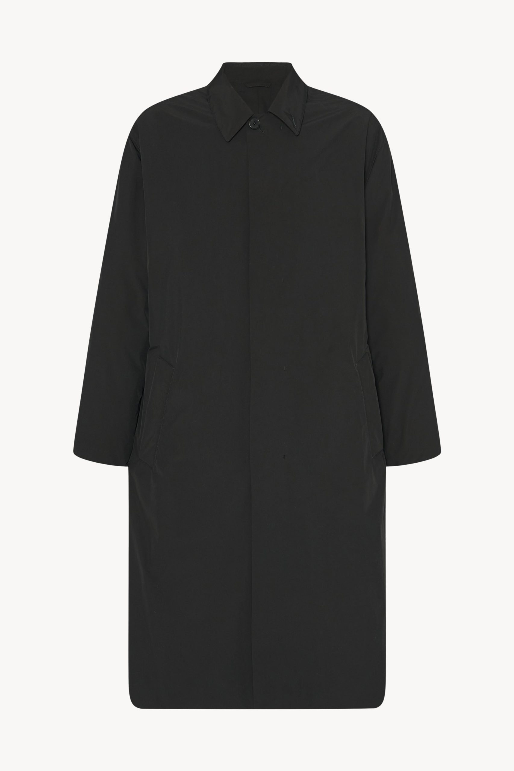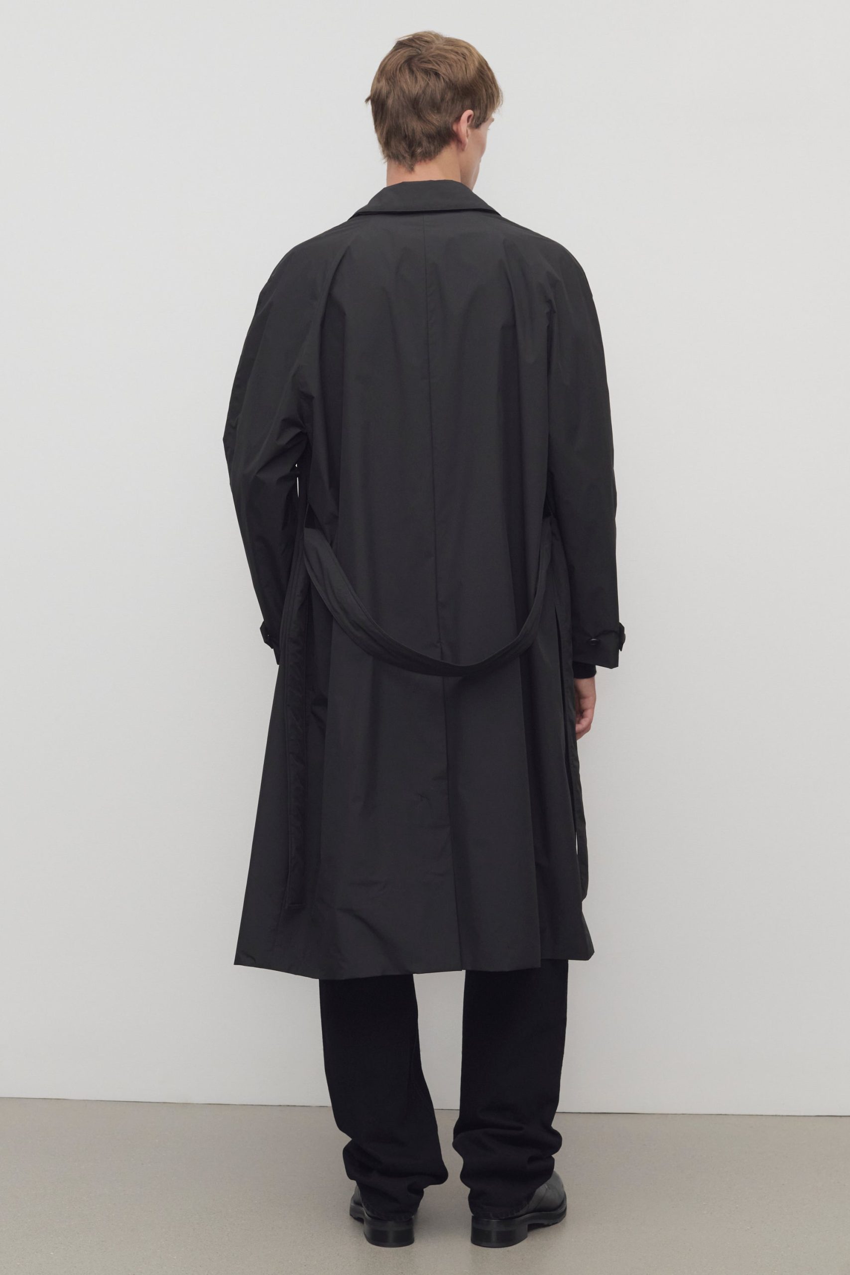 Single-breasted trench coat in water-repellant technical fabric with removable belt. slant welt pockets. and concealed front placket with button closure.