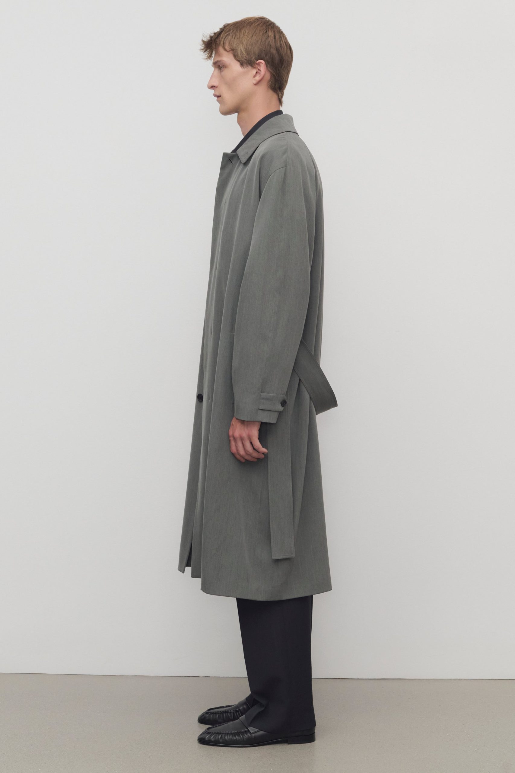 Single-breasted trench coat in double-faced silk and wool with removable belt. slant welt pockets. and concealed front placket with button closure.