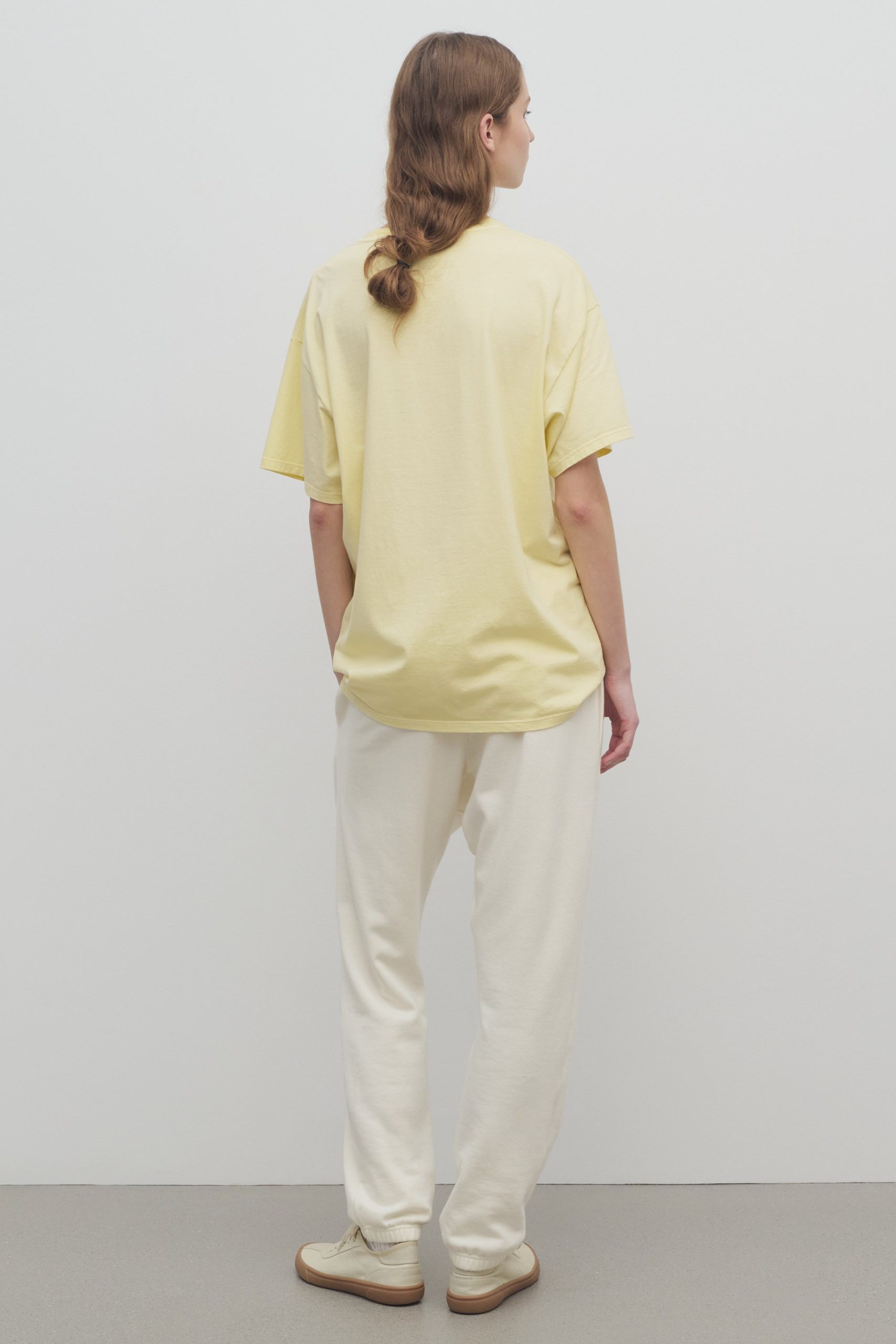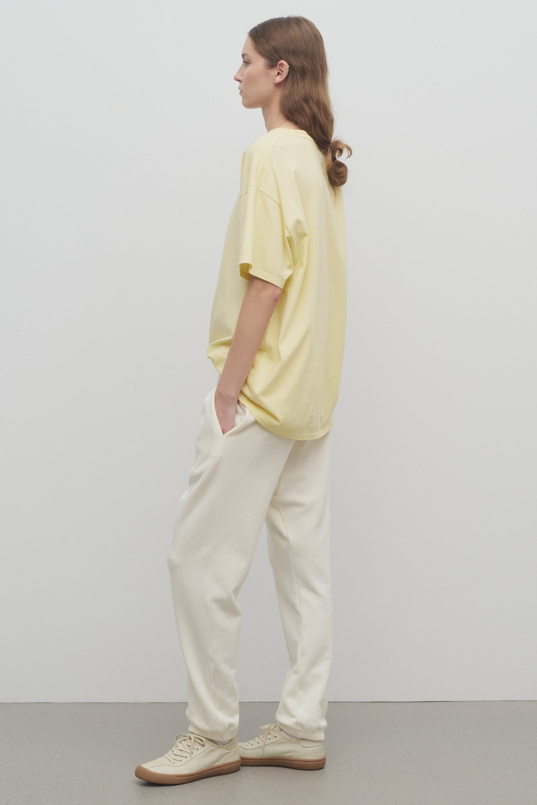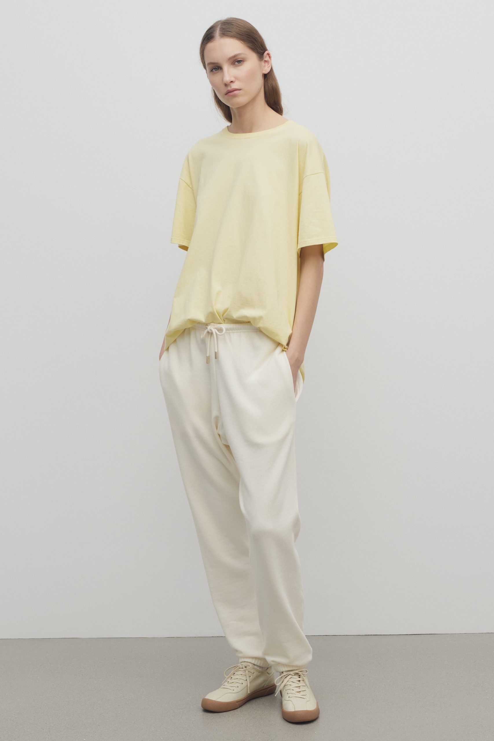 Mid-rise pant in cashmere and cotton French terry with slightly tapered leg. drawstring waist. and side seam pockets.