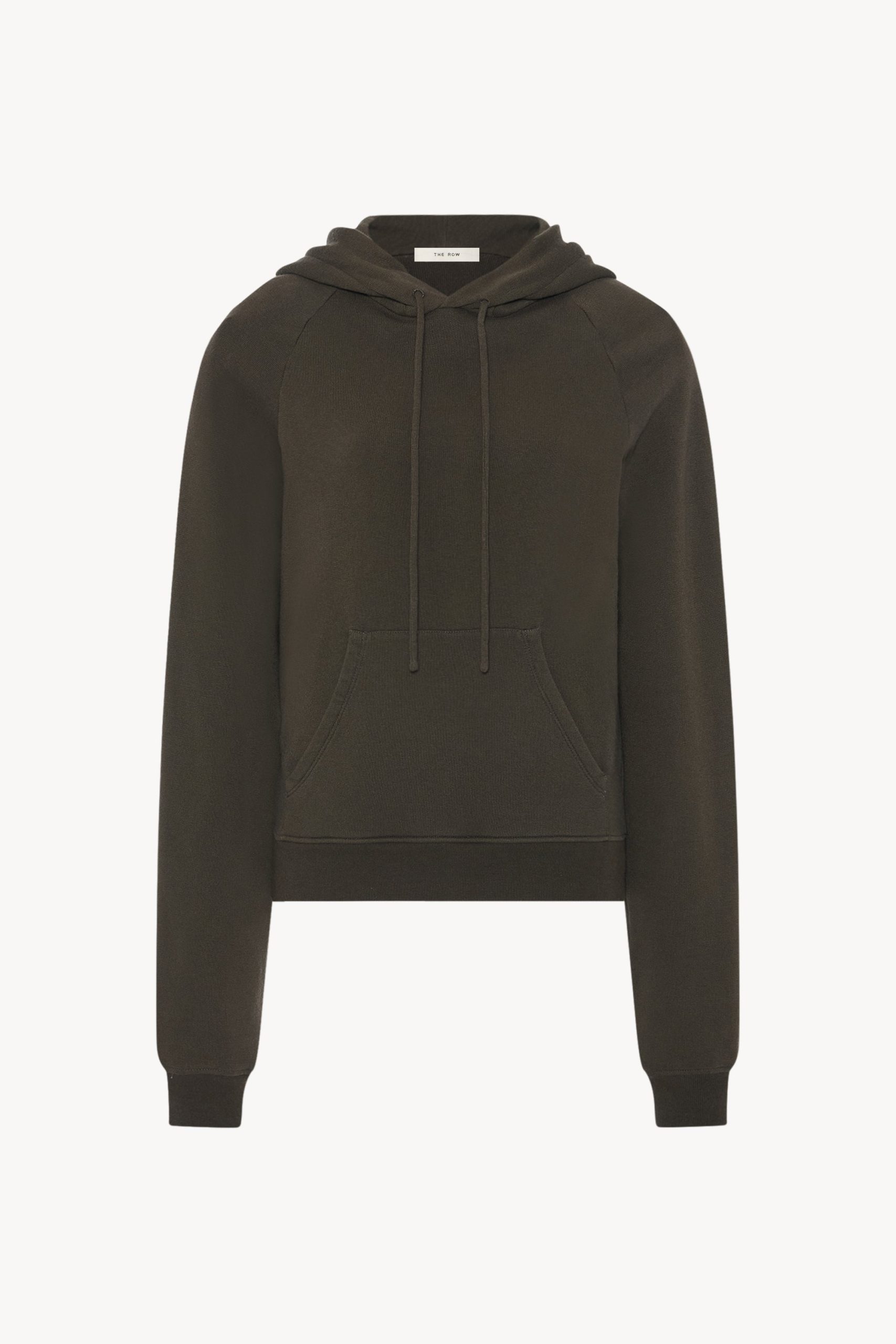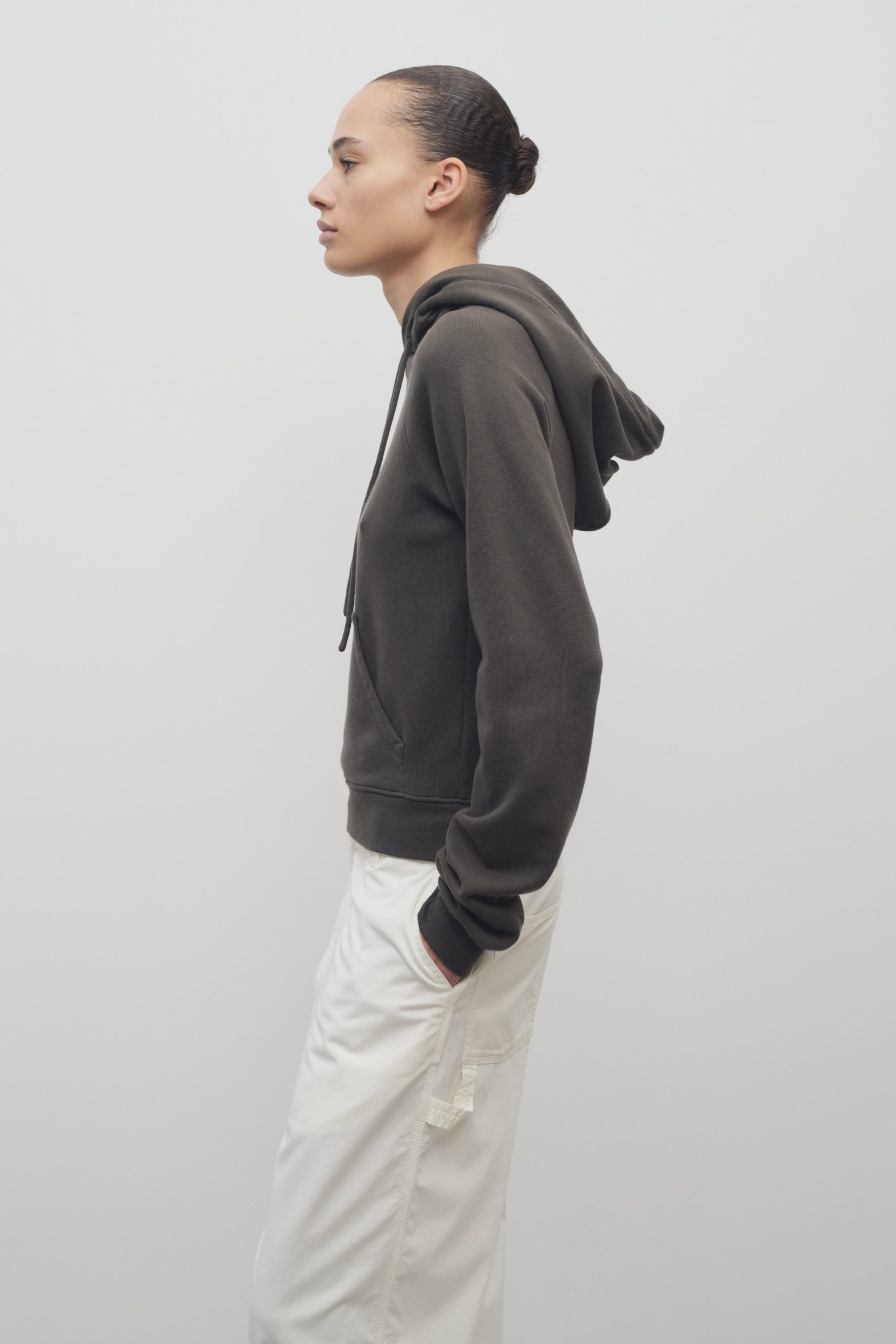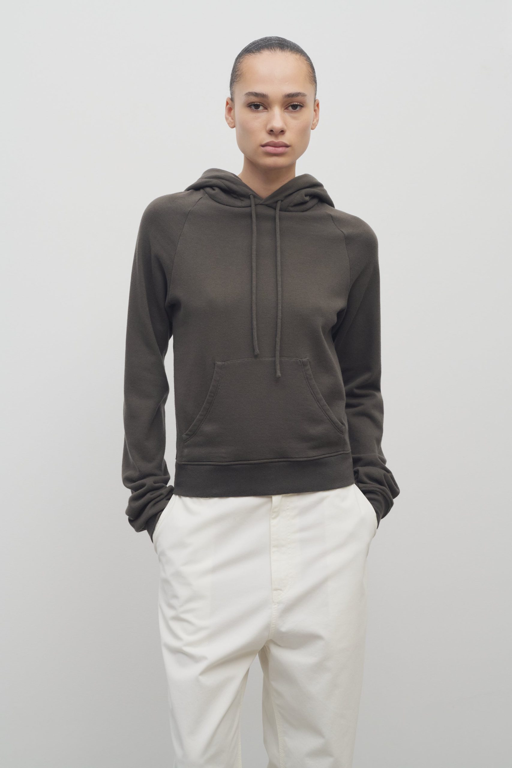 Slim hooded sweatshirt in cotton and cashmere French terry with raglan sleeves. front pouch pocket. and ribbed cuffs and hem.