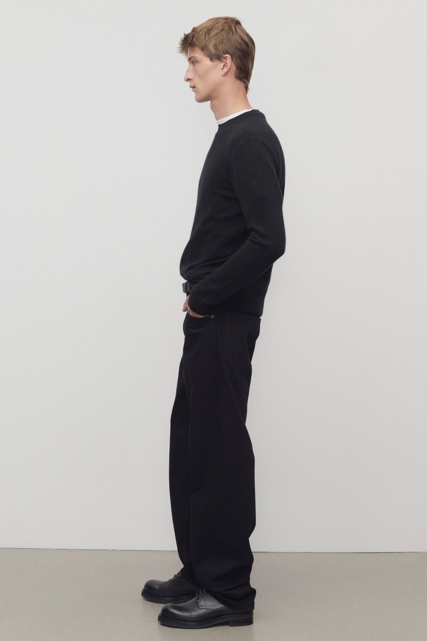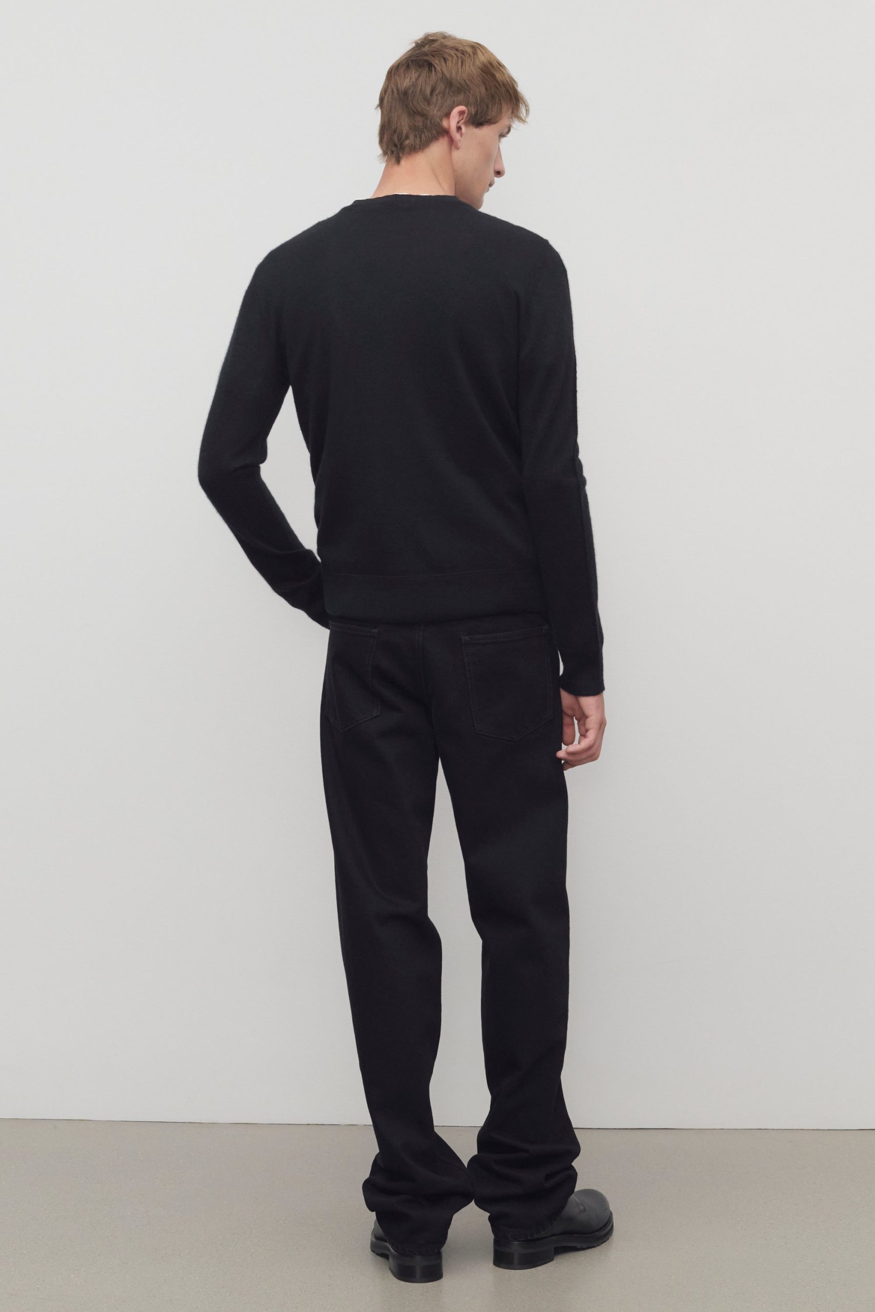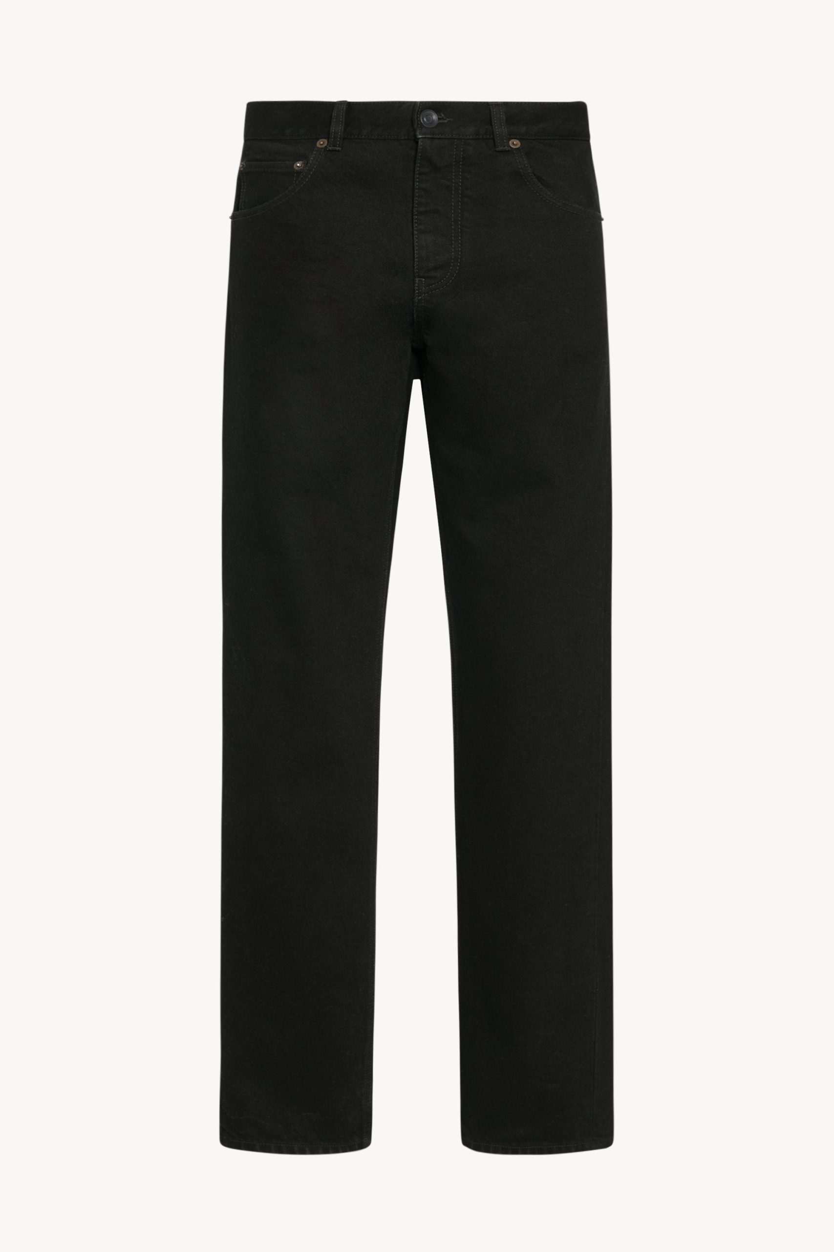 High-rise jean in mercerized cotton denim with straight leg. tonal topstitching. and classic 5-pocket construction.