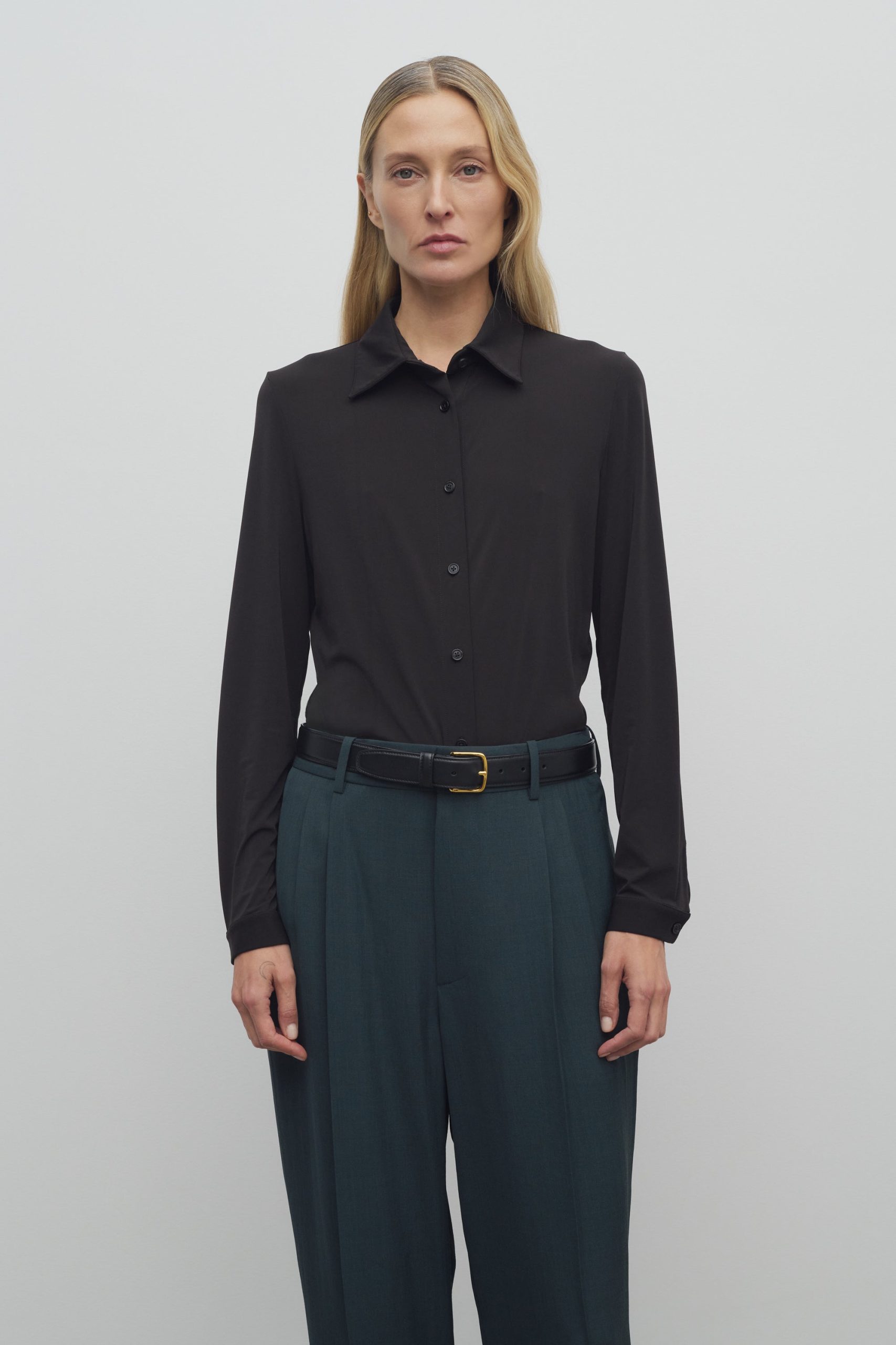 Long-sleeved button-up shirt in ultra-soft jersey with slim fit and exposed placket with mother-of-pearl buttons.