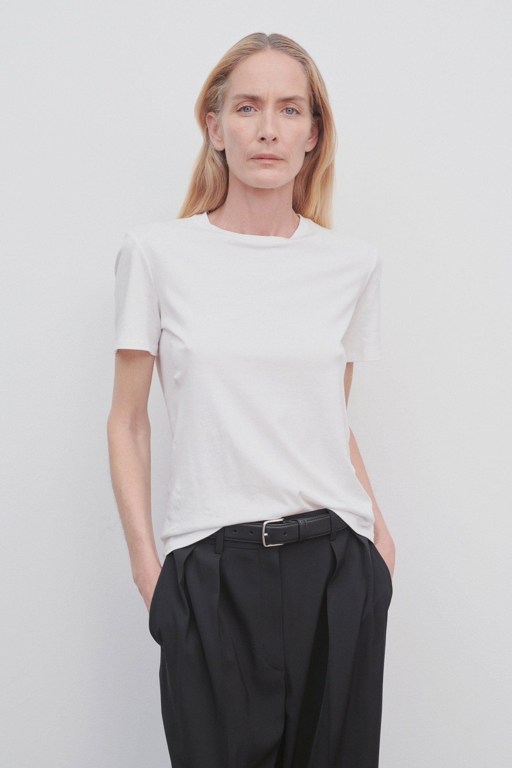 The Row Essentials short-sleeved classic t-shirt in ultra-soft. fluid cotton with signature French seam along the back.