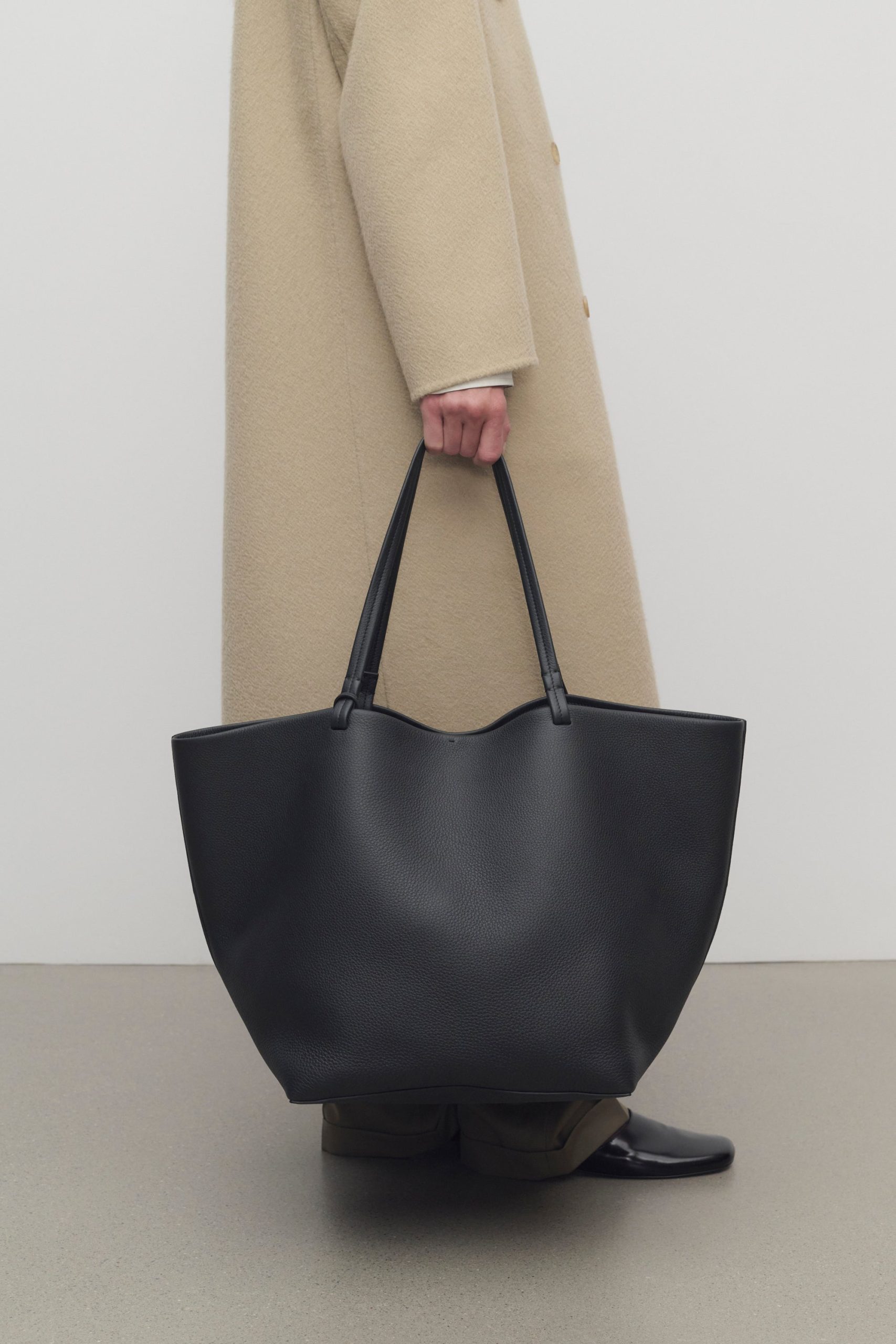 Classic tote bag in textured calfskin leather with interior tie closure. flat handles. and removable interior wristlet with adjustable strap.