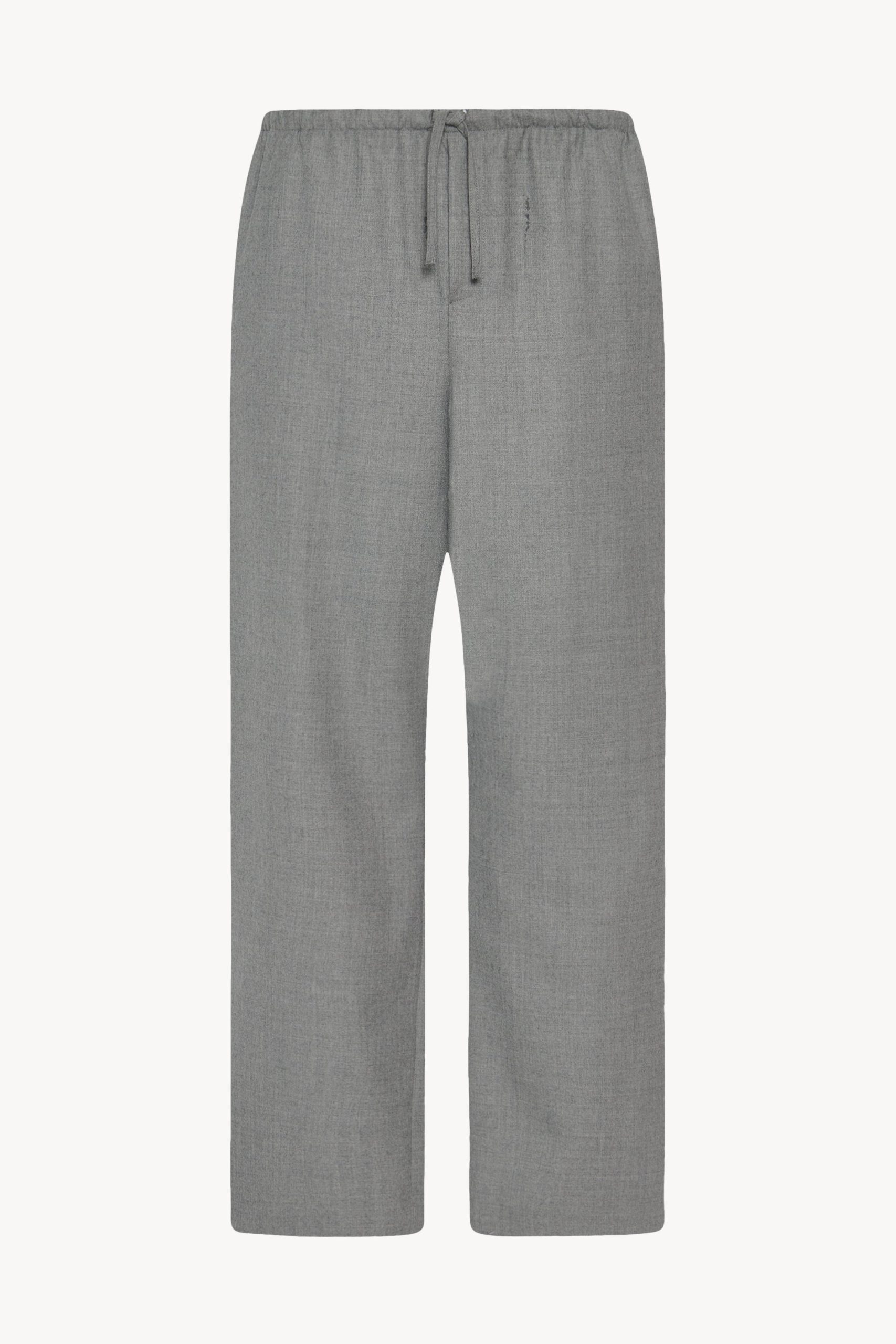 Relaxed pull-on pant in virgin wool flannel with wide. straight leg. elasticated drawstring waist. and side seam pockets.